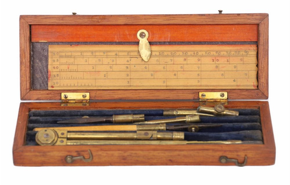 A rectangular mahogany hinged case, the interior fitted with brass drawing and measuring instruments, including dividers and ruling implements. 19th century.