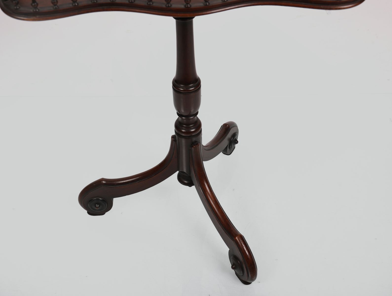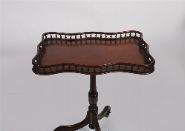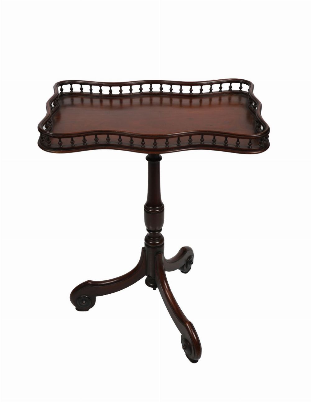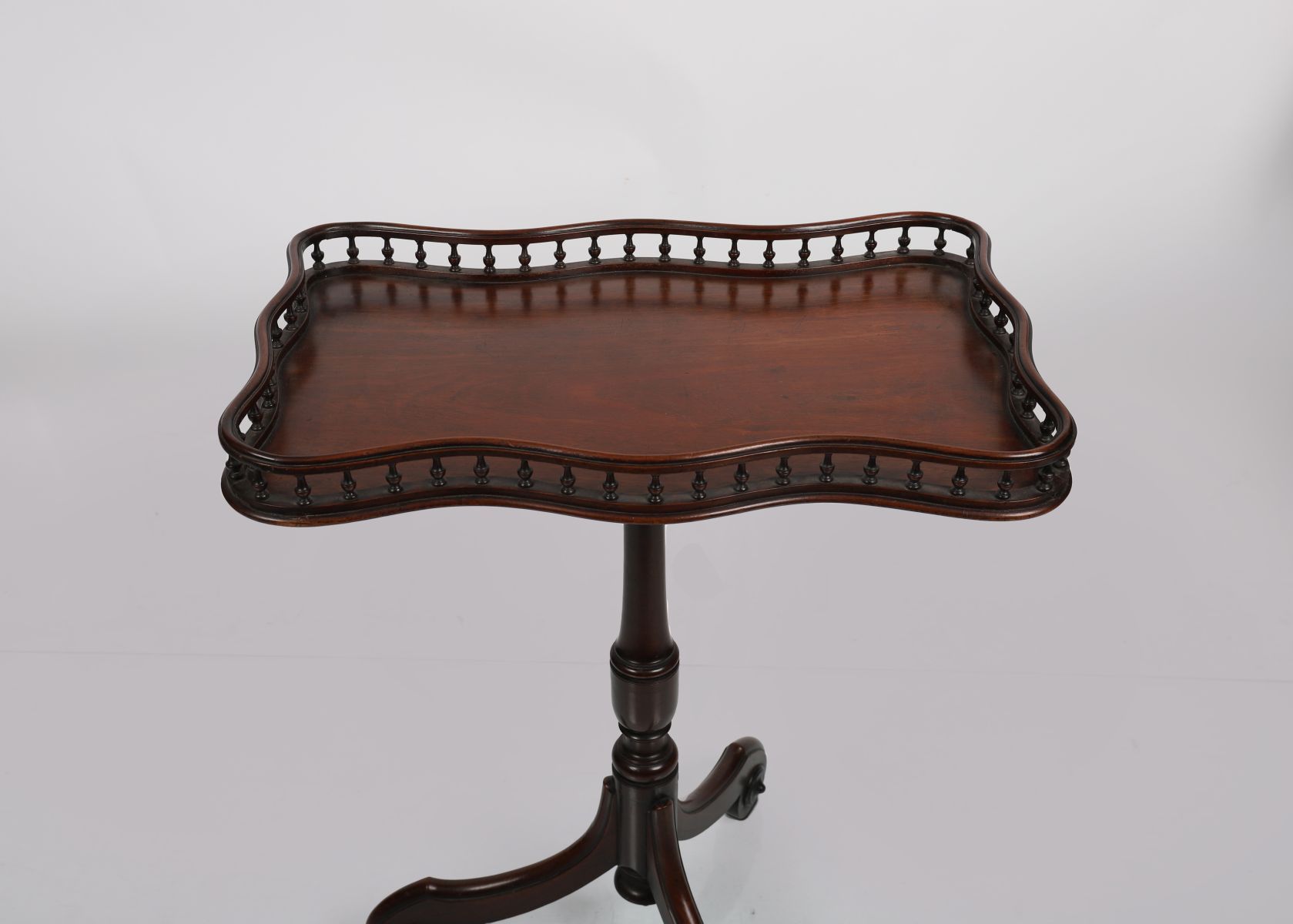 A fine 19th-century mahogany gallery table with serpentine tray top and pierced spindle gallery, raised on turned column and tripod base.