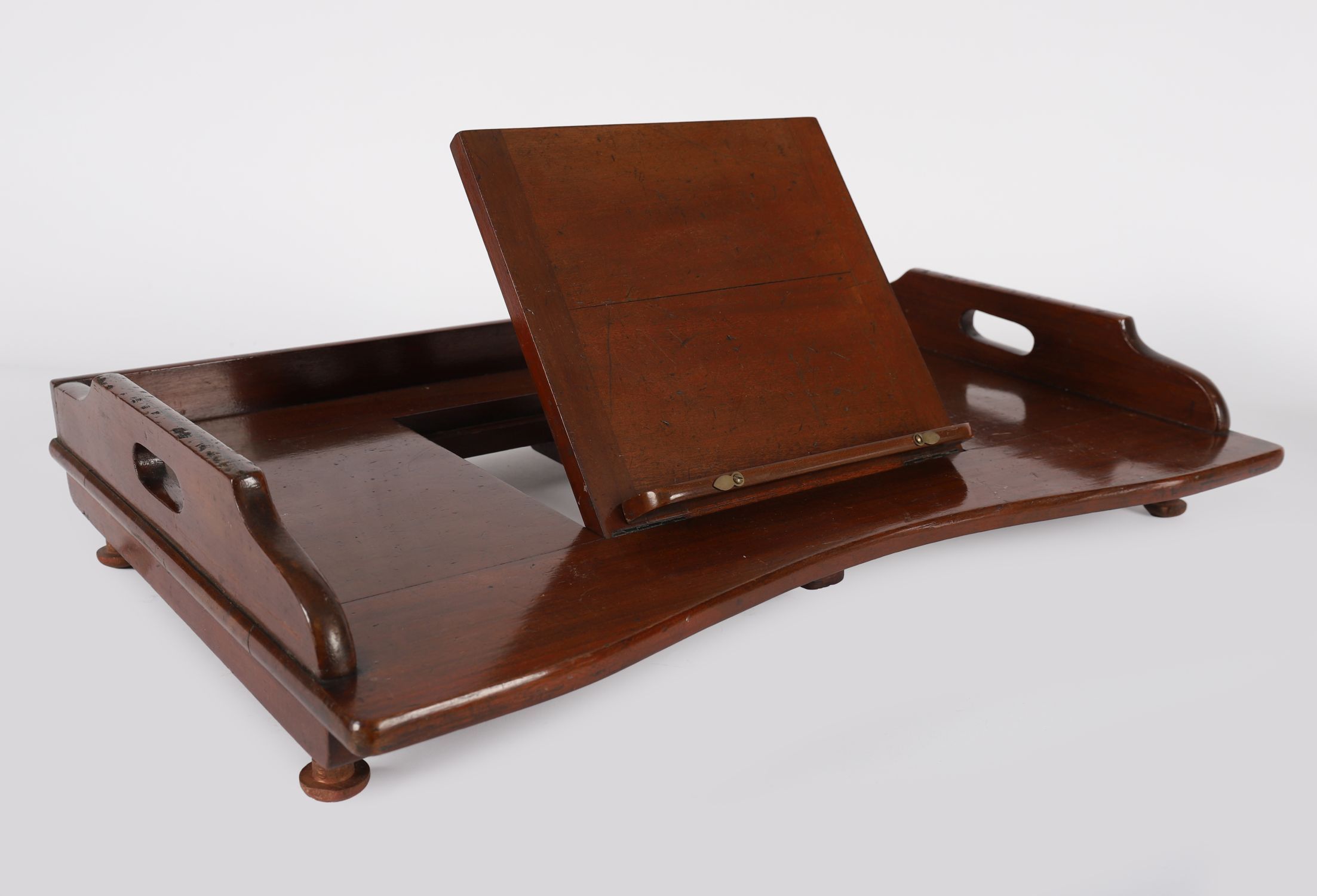 A 19th-century mahogany reading tray featuring a sloped adjustable book rest inset within a wide, shaped tray surface. With cut-out side handles and a solid construction.