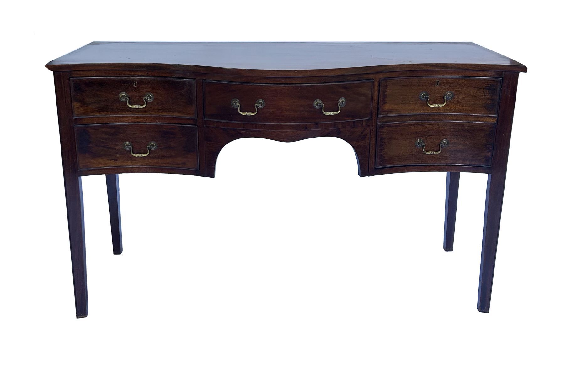 the rectangular serpentine fronted top above a series of drawers and panelled doors furnished with brass handles, raised on square tapered legs.