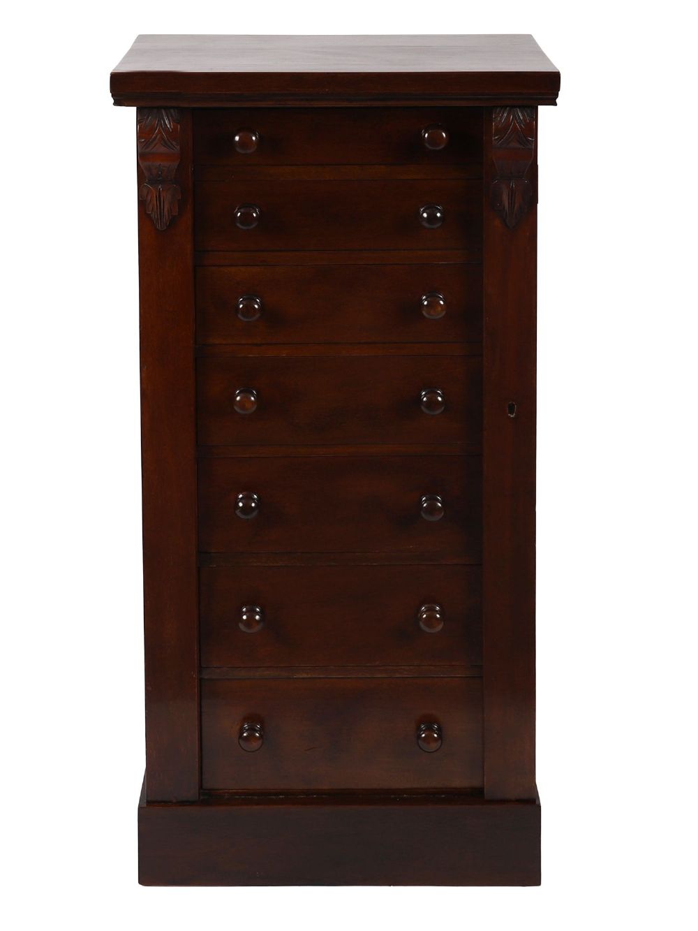 of seven drawers furnished with turned wooden knobs and locking flap.