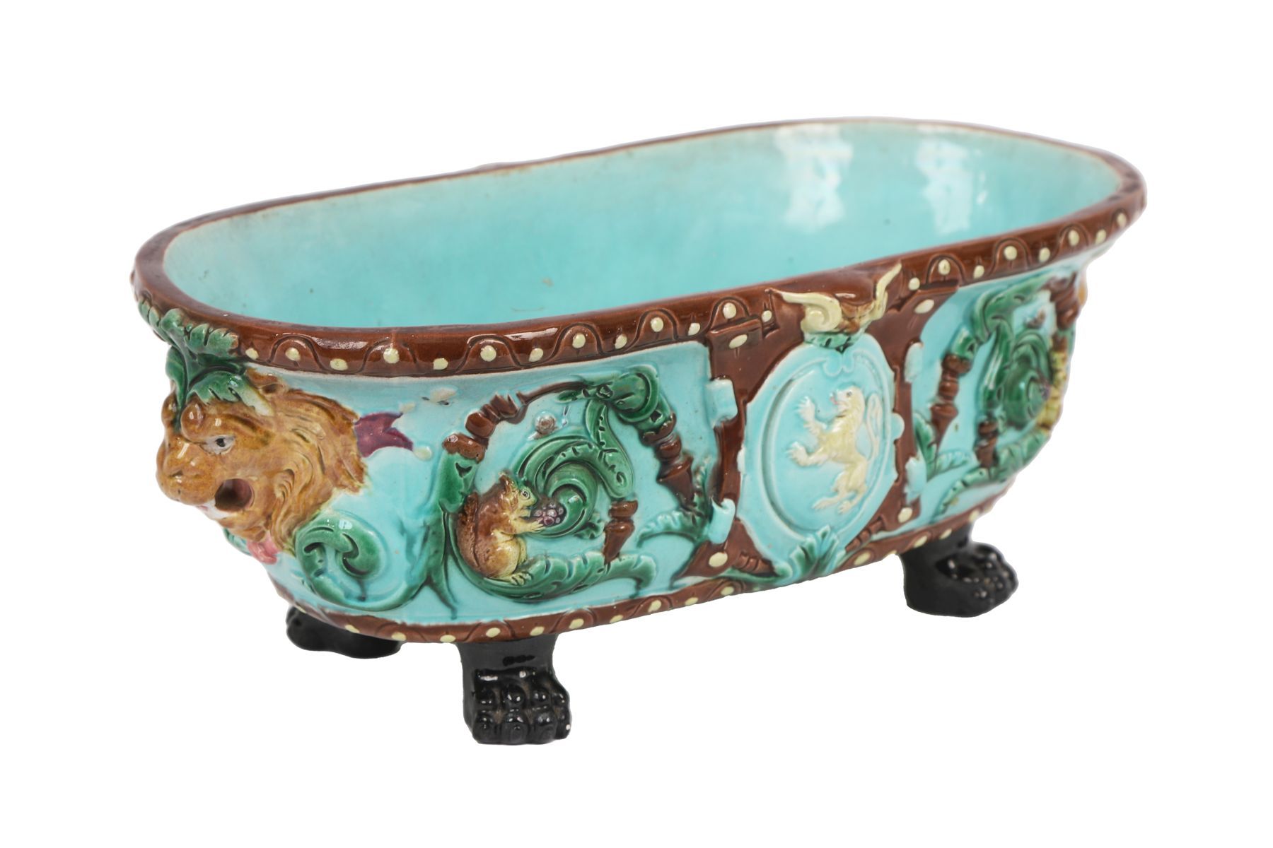 A 19th-century majolica planter of oval form, decorated in turquoise and brown glazes with moulded lion head masks and scrolling ornament, raised on four claw feet.