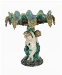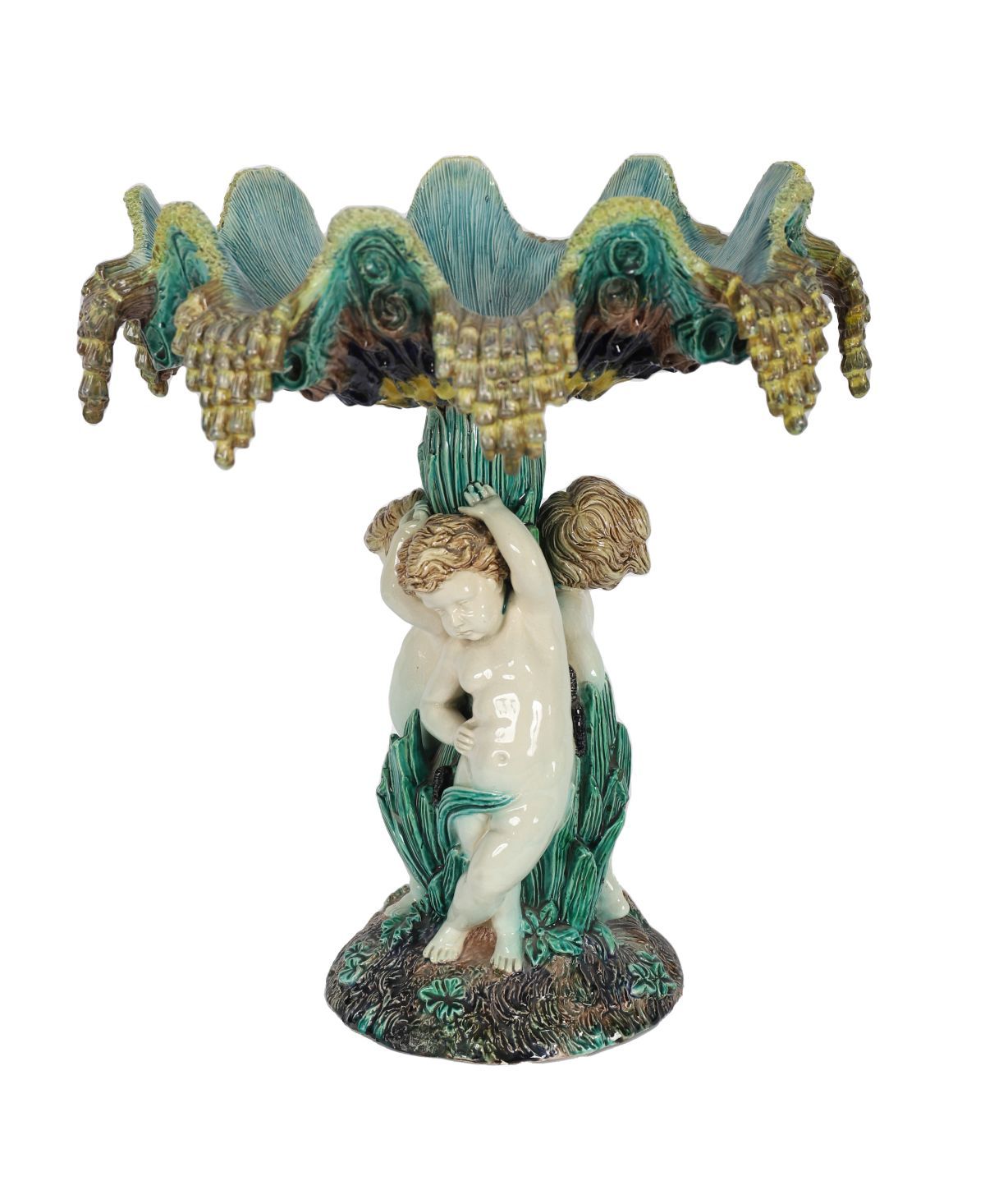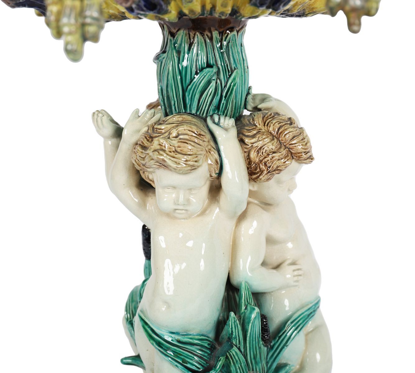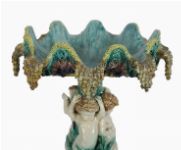 A 19th-century majolica tazza, the shallow dish supported by a figural stem and decorated in polychrome glazes. Continental, 19th century.