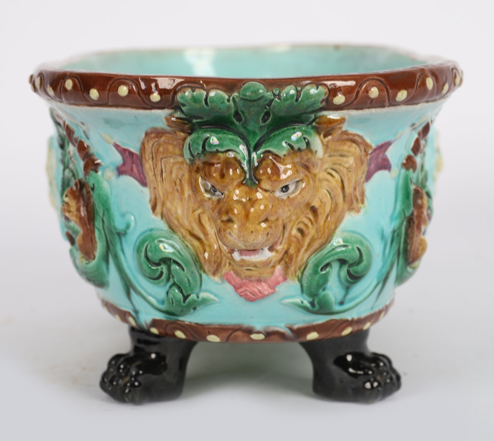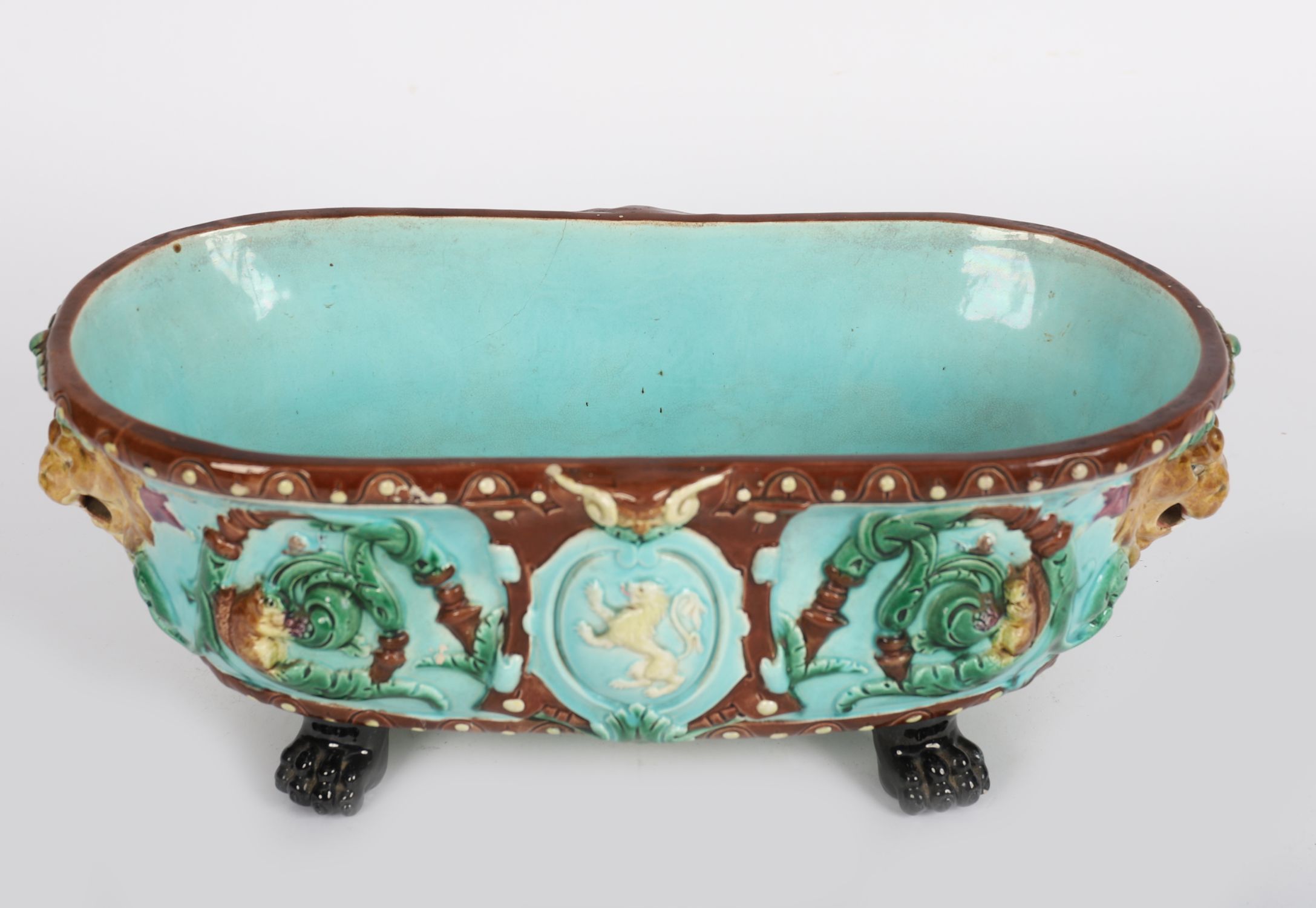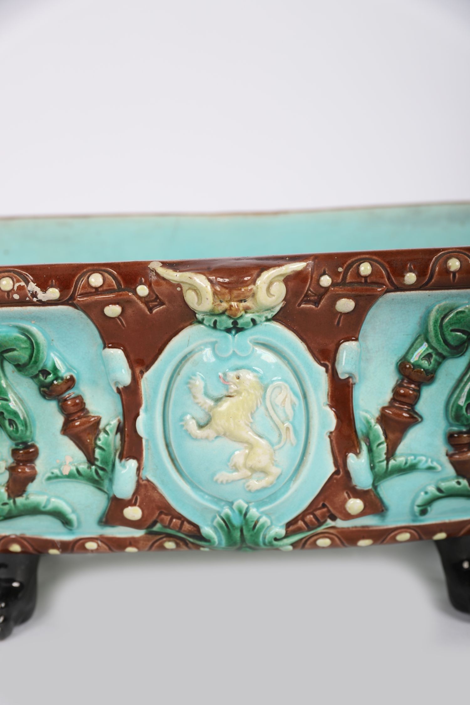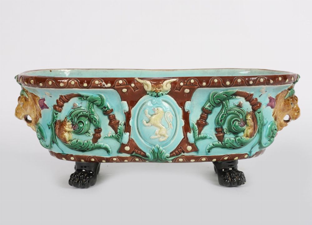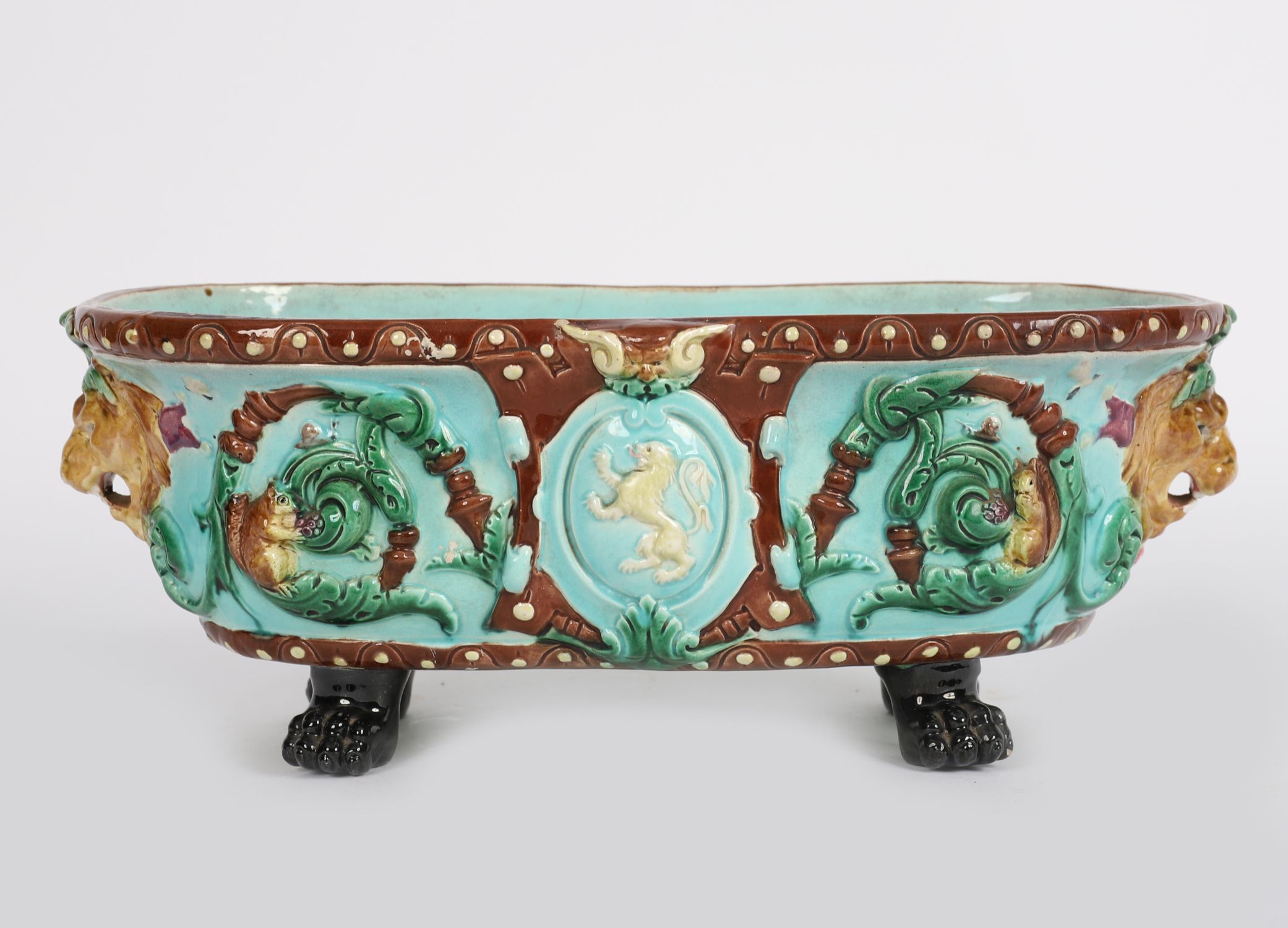 A large trough-shaped majolica jardinière, the exterior decorated with scrollwork panels enclosing lion medallions on a turquoise ground, all picked out in rich polychrome glaze. Raised on four black paw feet with a turquoise glazed interior.