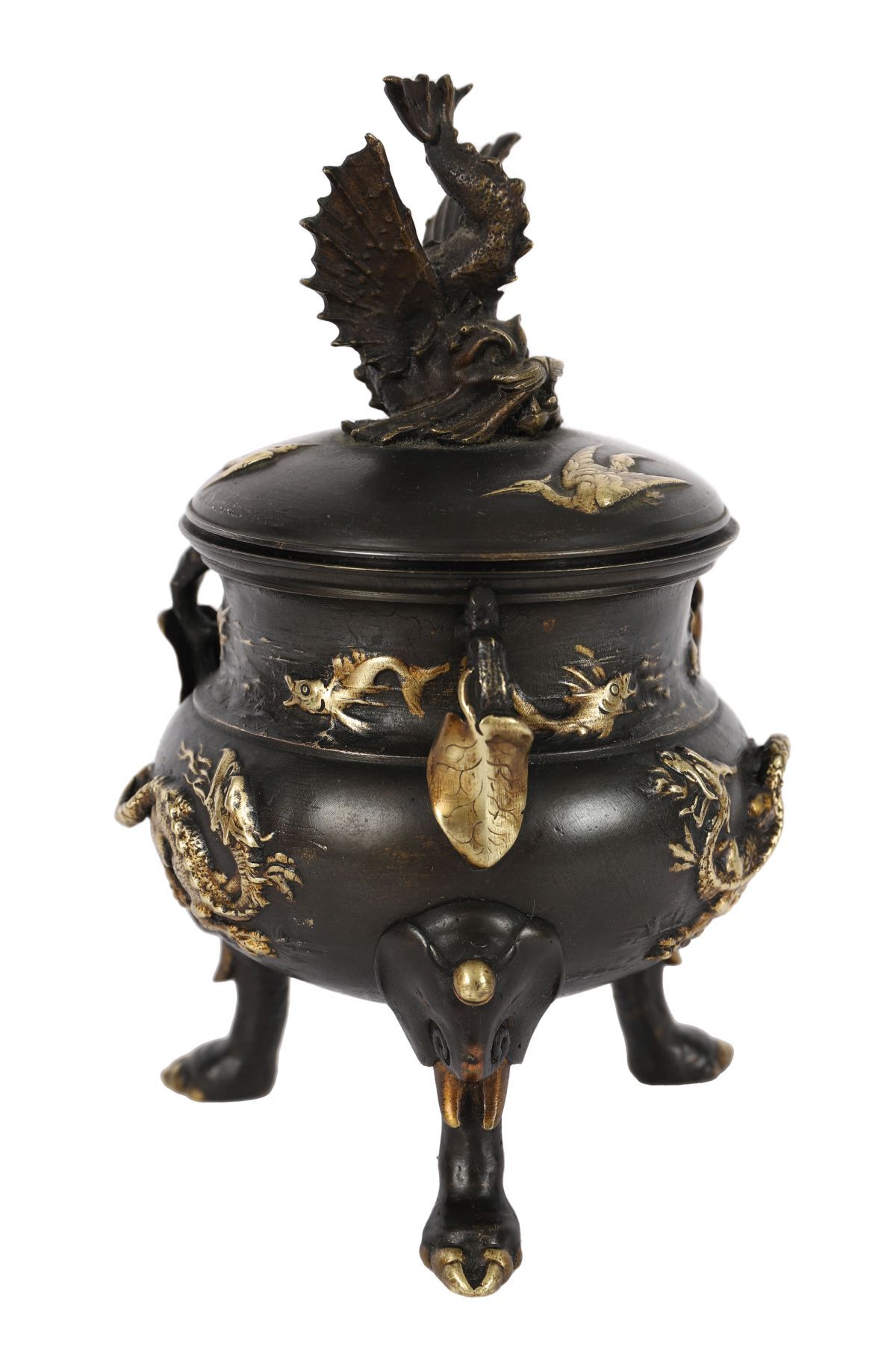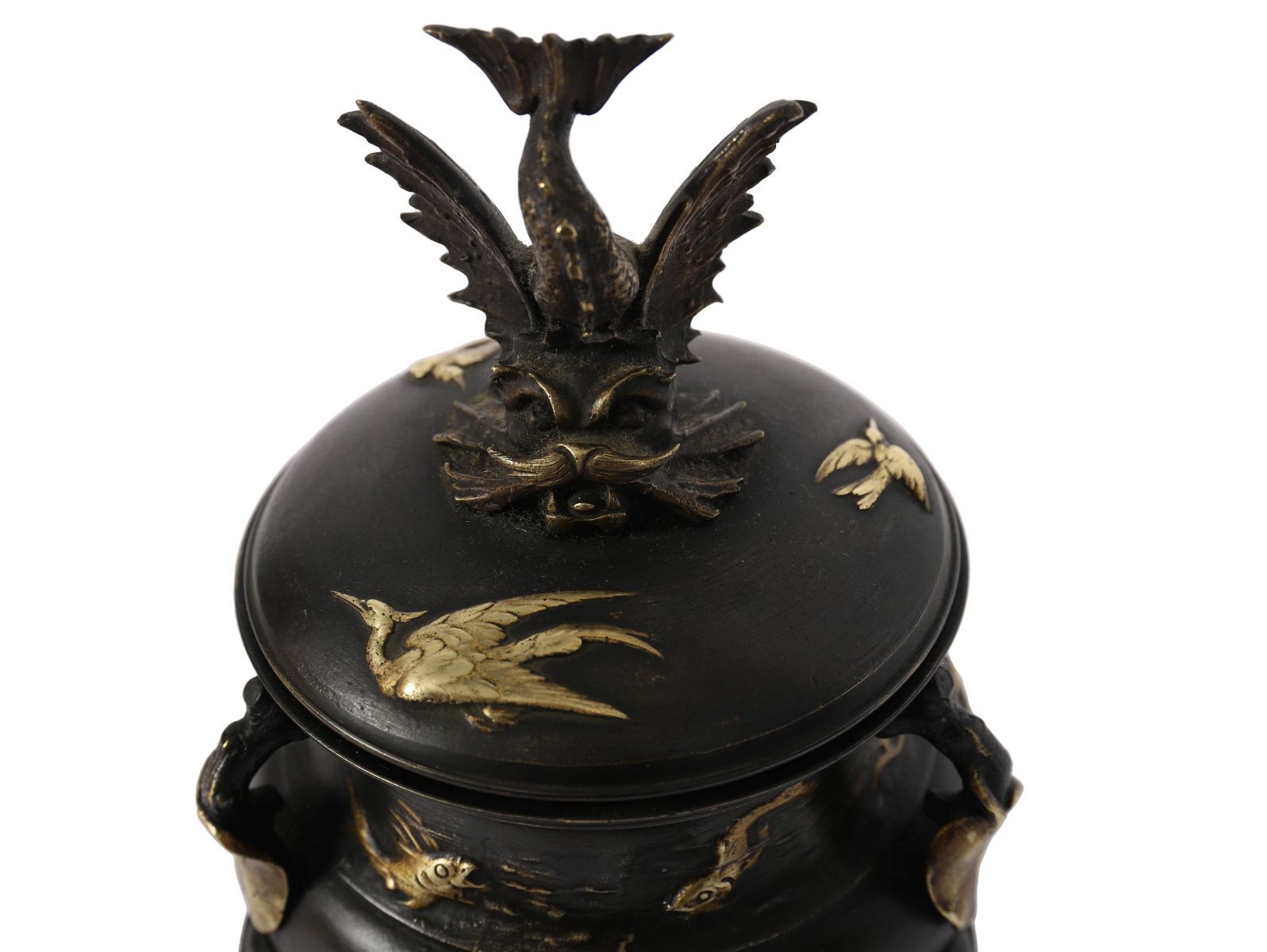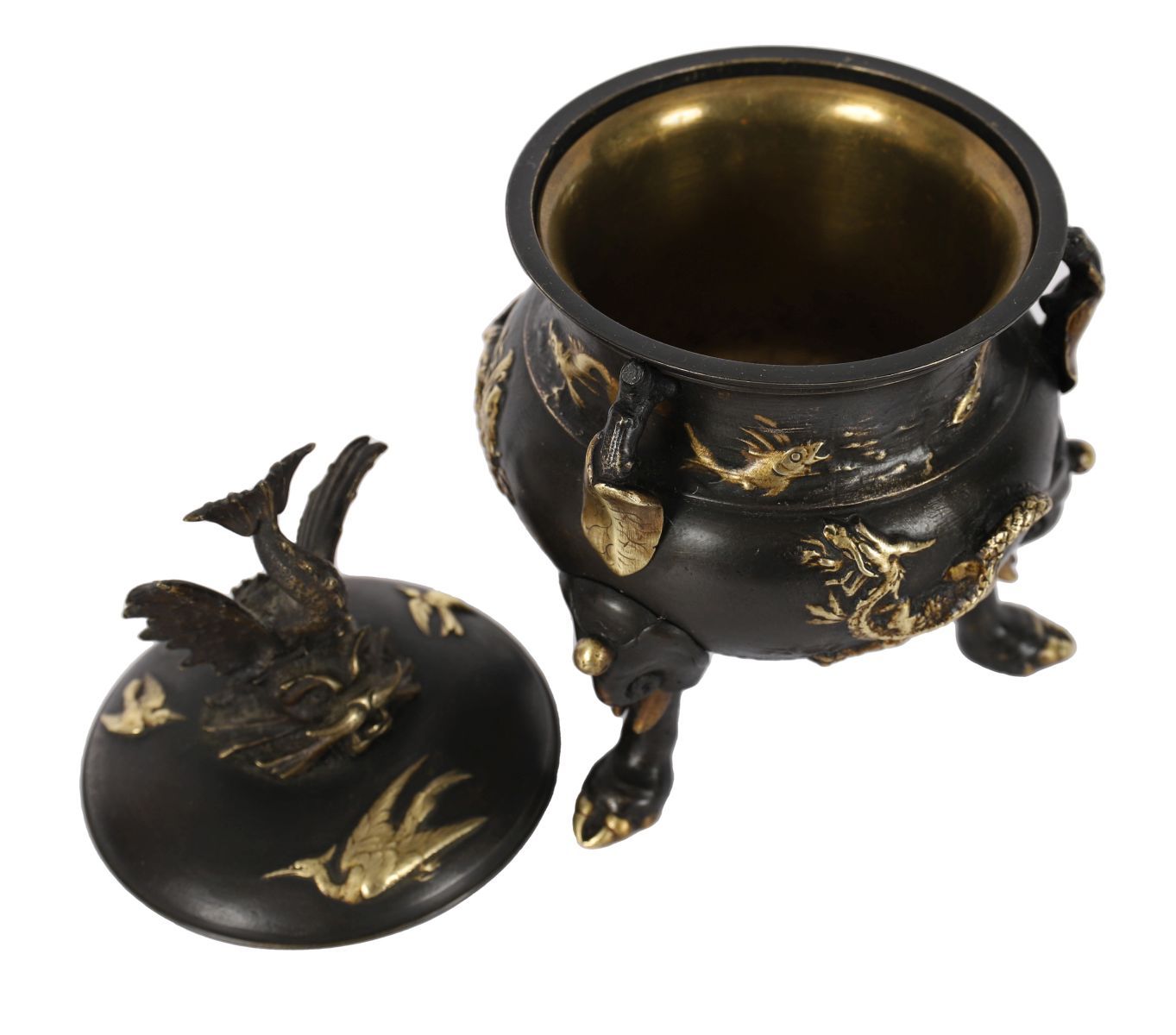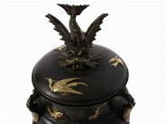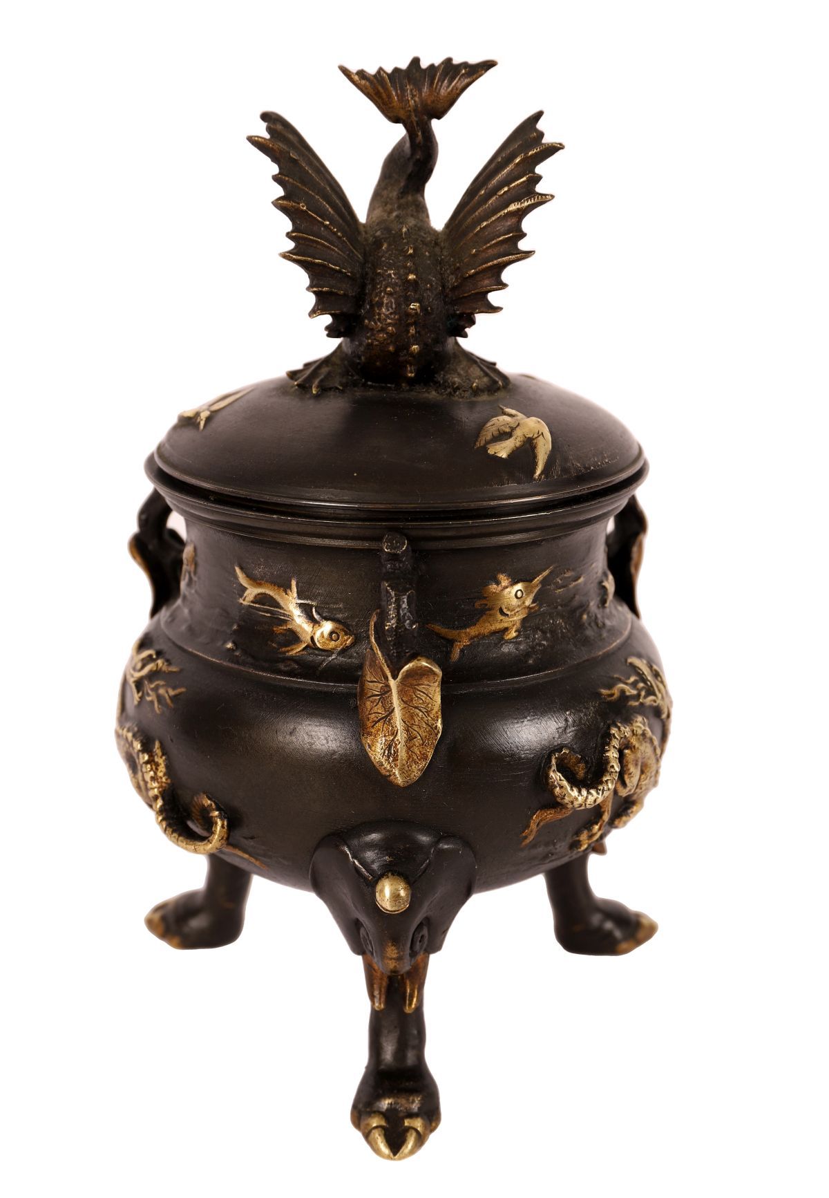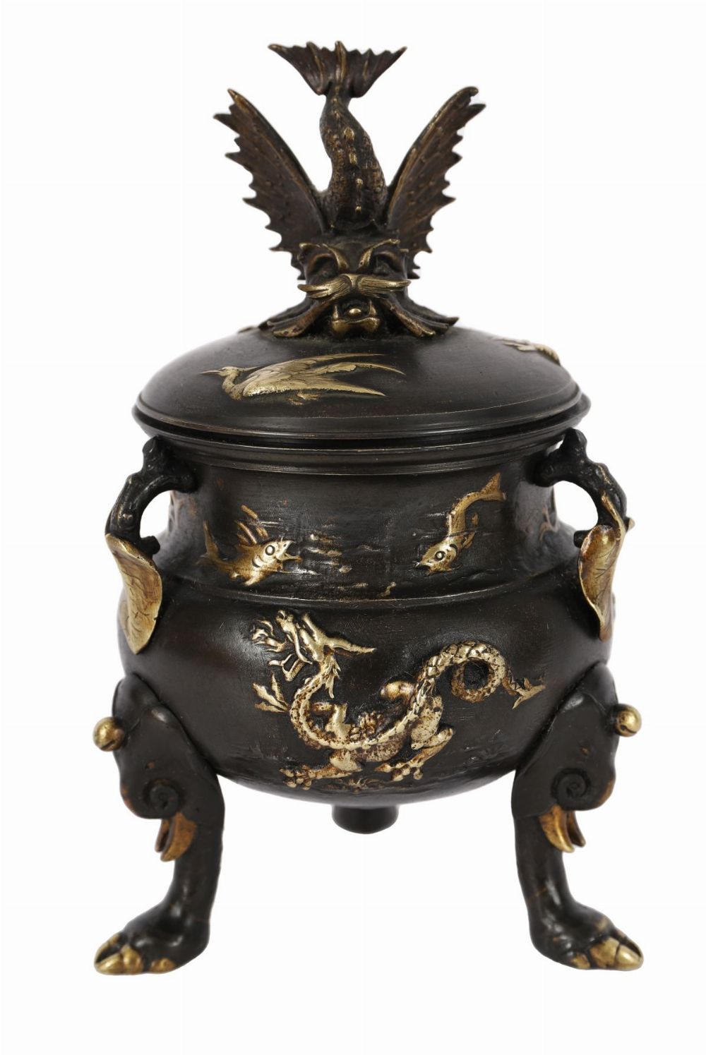 A 19th-century Japanese bronze censer of globular form, cast in relief with insects, fish, and aquatic motifs, raised on three stylised feet. The domed cover surmounted by a finely modelled bird finial with outstretched wings, the surface enriched with parcel-gilt highlights accentuating the decorative detail. A characteristic example of Meiji-period metalwork, combining naturalistic subject matter with skilled casting and patination. Japanese, Meiji period (1868–1912).