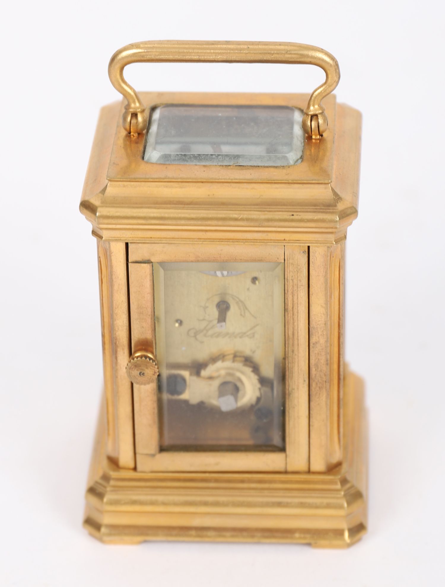 A fine brass-cased miniature carriage clock of rectangular form with bevelled glass panels, white enamel dial with Roman numerals, and swing handle. French, late 19th century, the small scale making it an elegant travel timepiece.