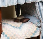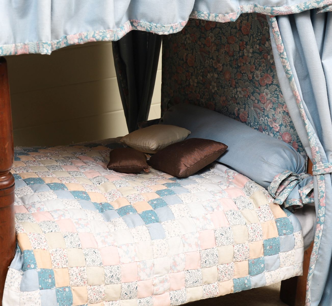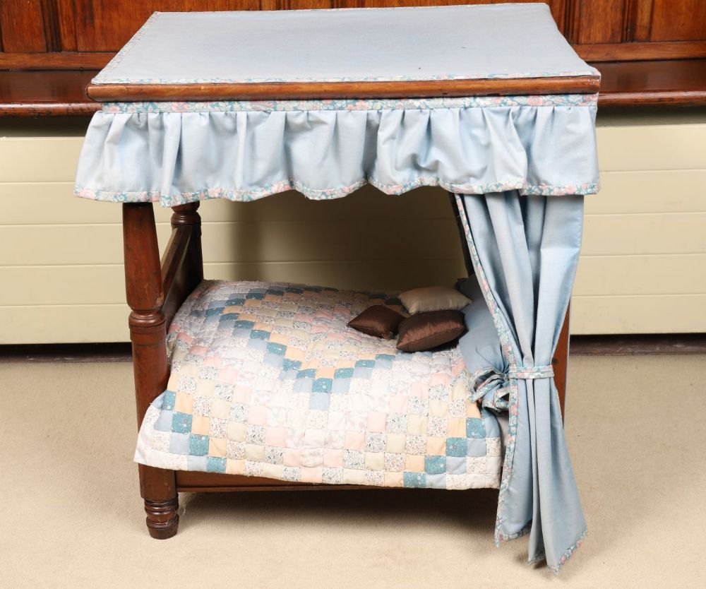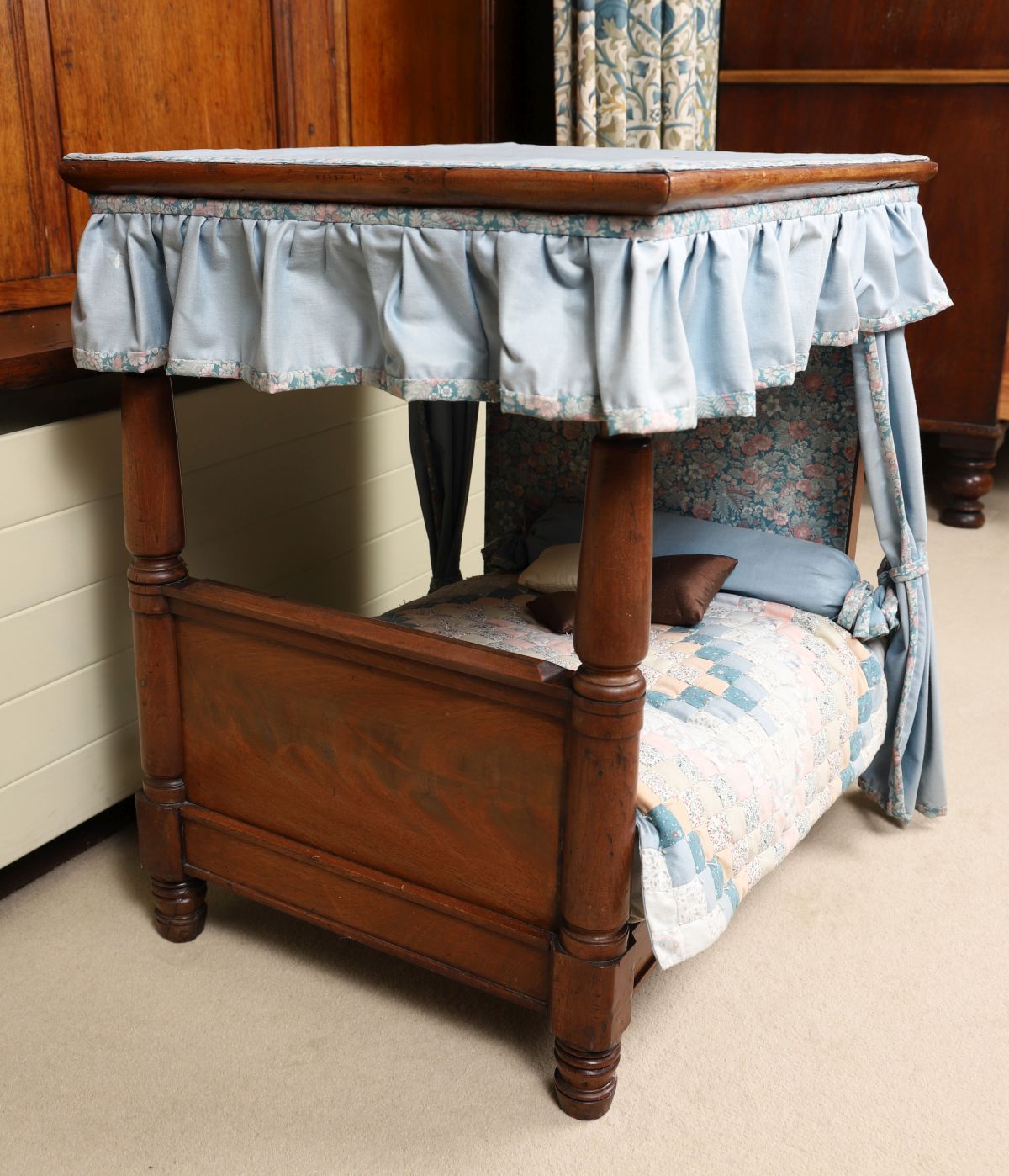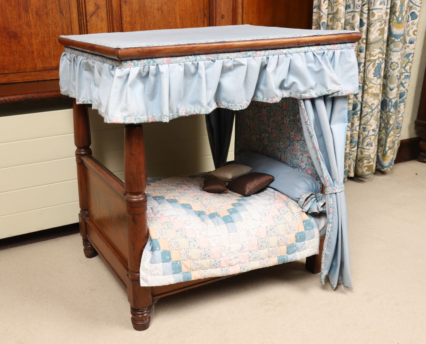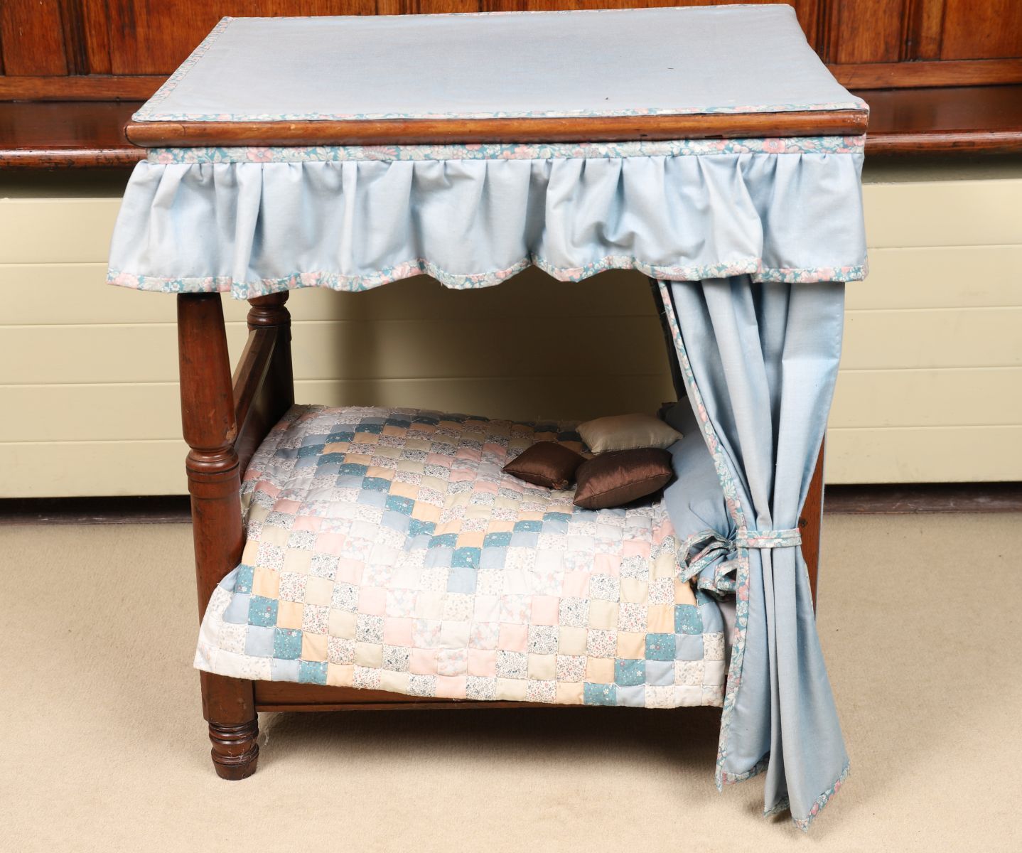 A 19th-century miniature four-poster bed, the turned posts supporting a tester, dressed with fitted bedding and hangings.