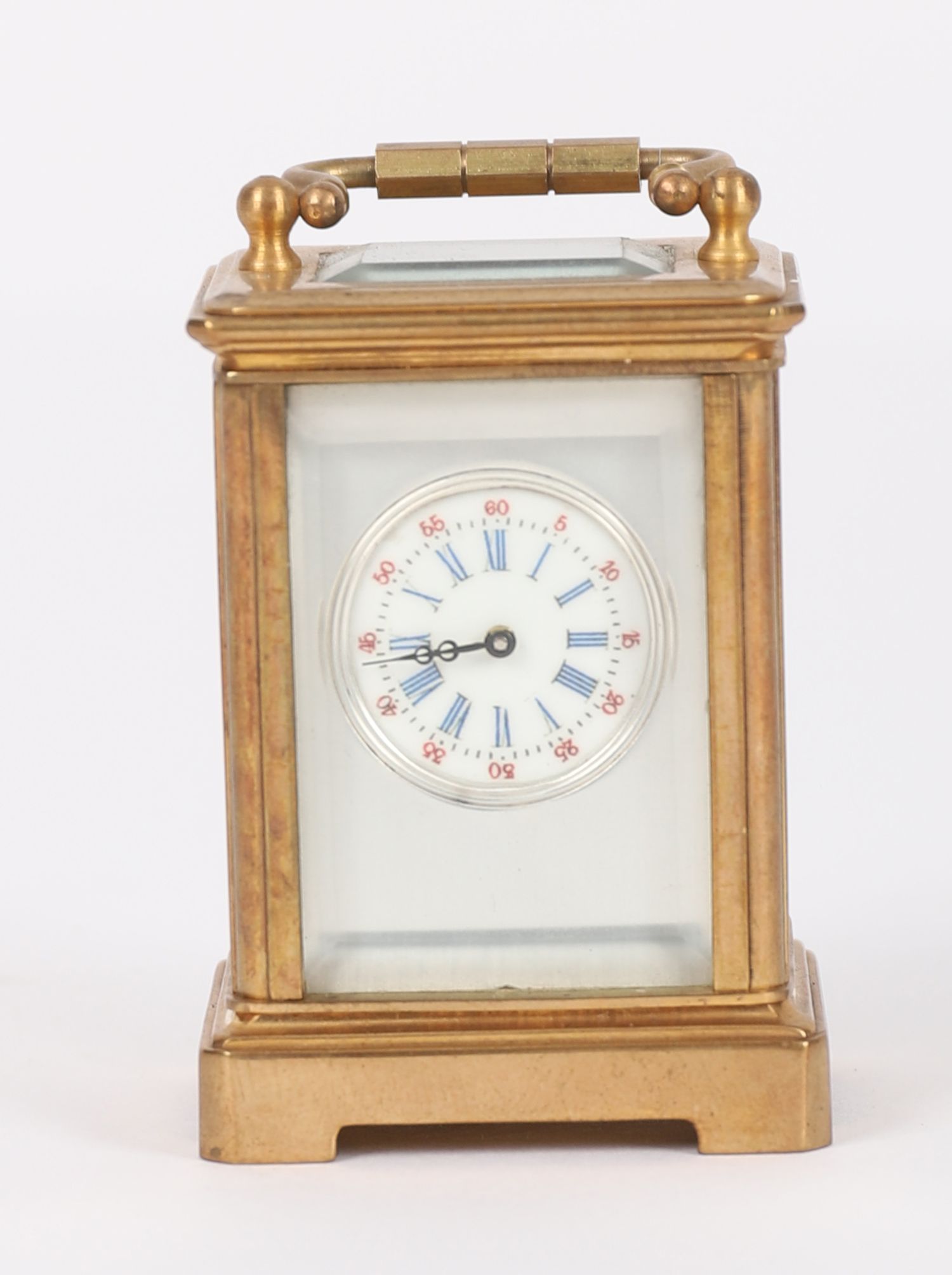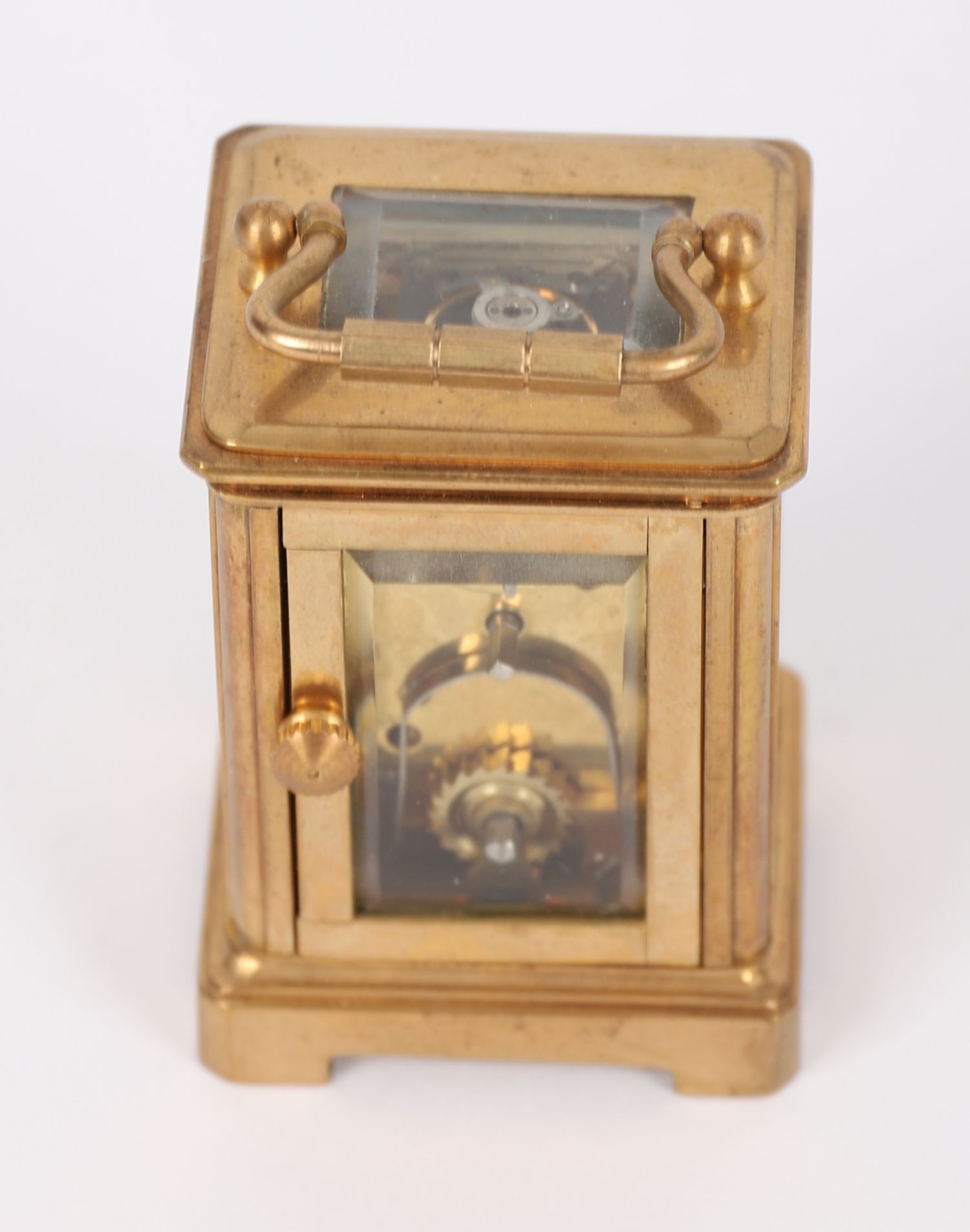A fine 19th century miniature French carriage clock, the gilt brass case of rectangular form with bevelled glass panels, enamel dial with Roman numerals and outer Arabic minute track. With original handle and winding aperture to the backplate.