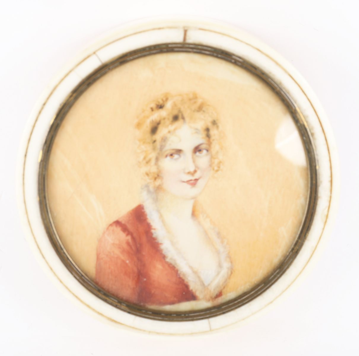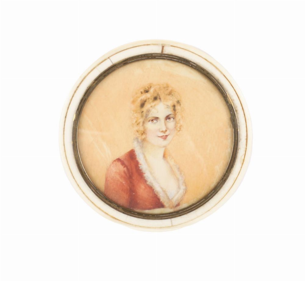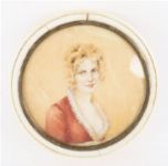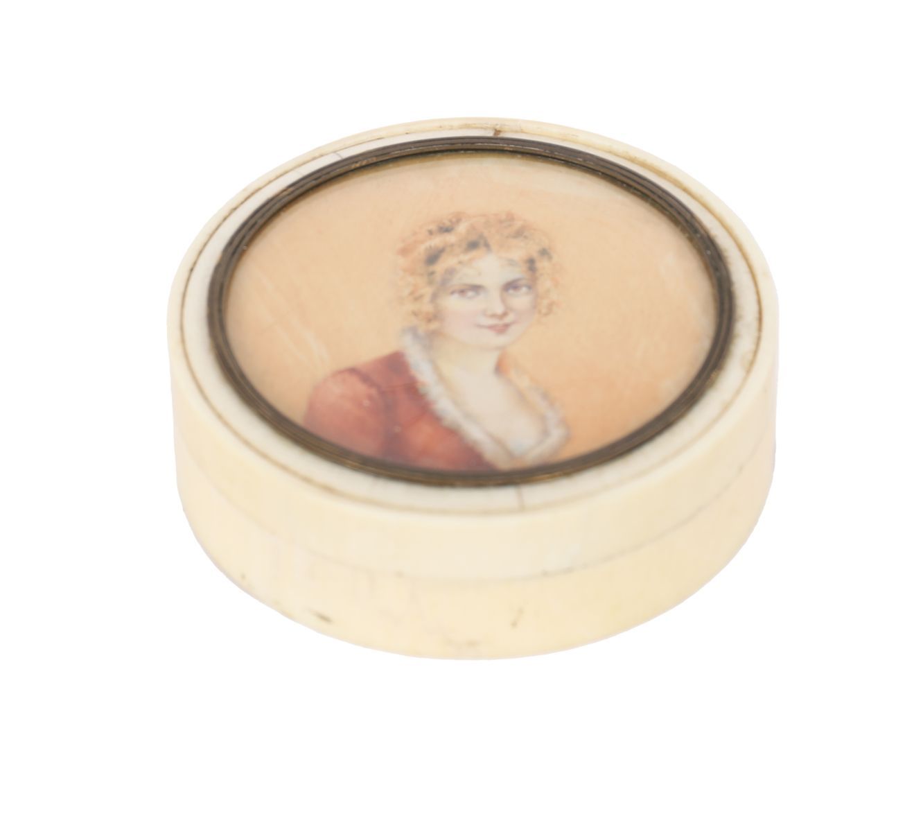 A circular ivory box mounted with a hand-painted miniature portrait of a lady in red attire, under glass. 19th century.