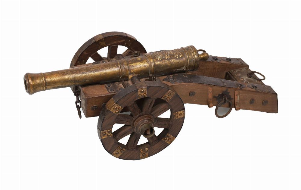 A well-made scale model cannon, the brass barrel ornately engraved and mounted on a riveted hardwood carriage with iron fittings and wheels.