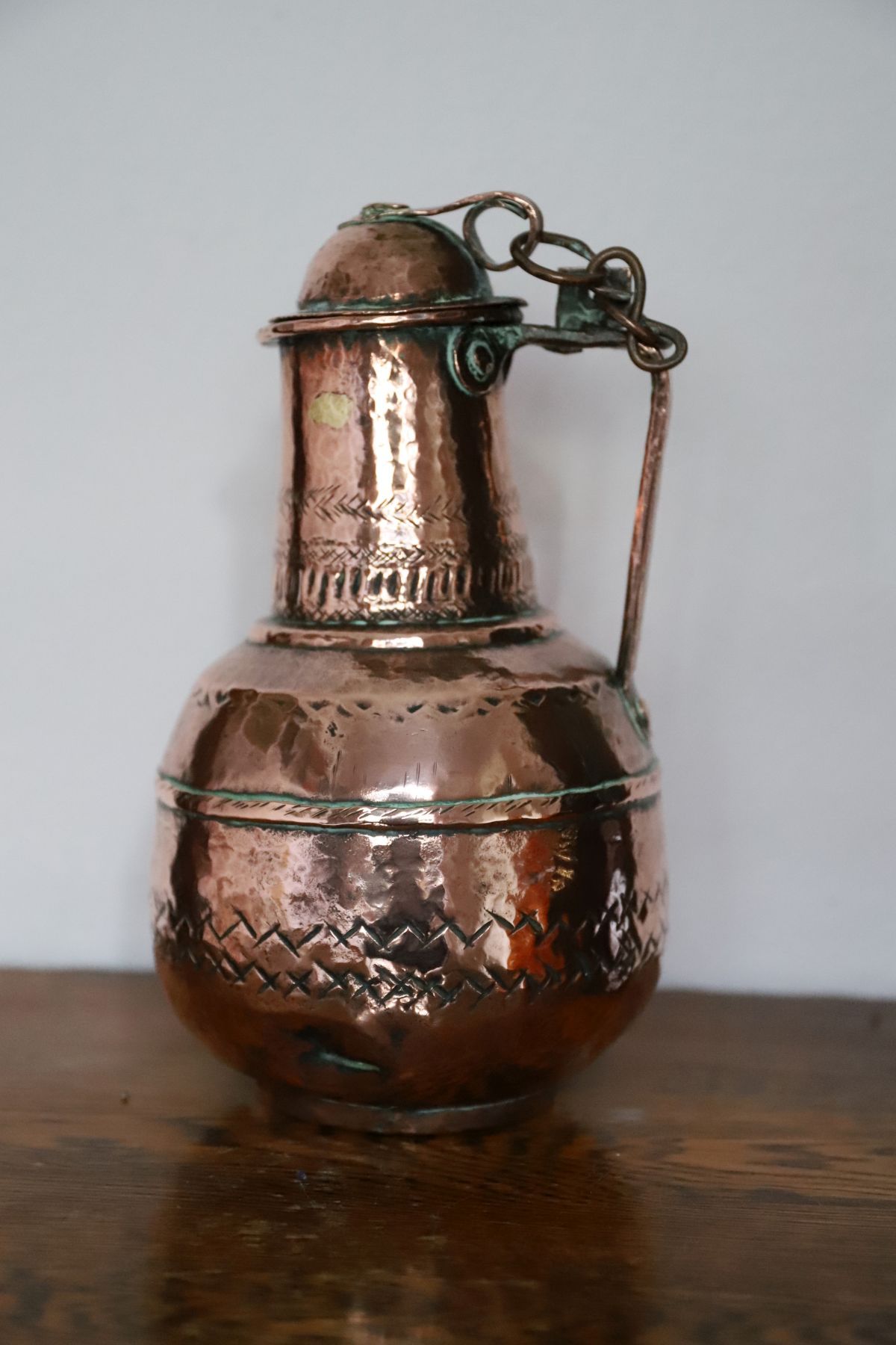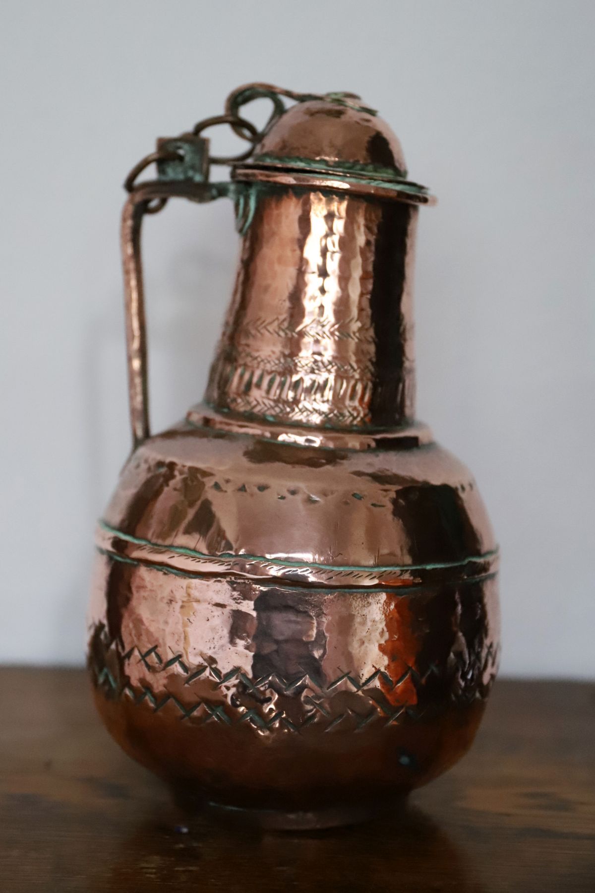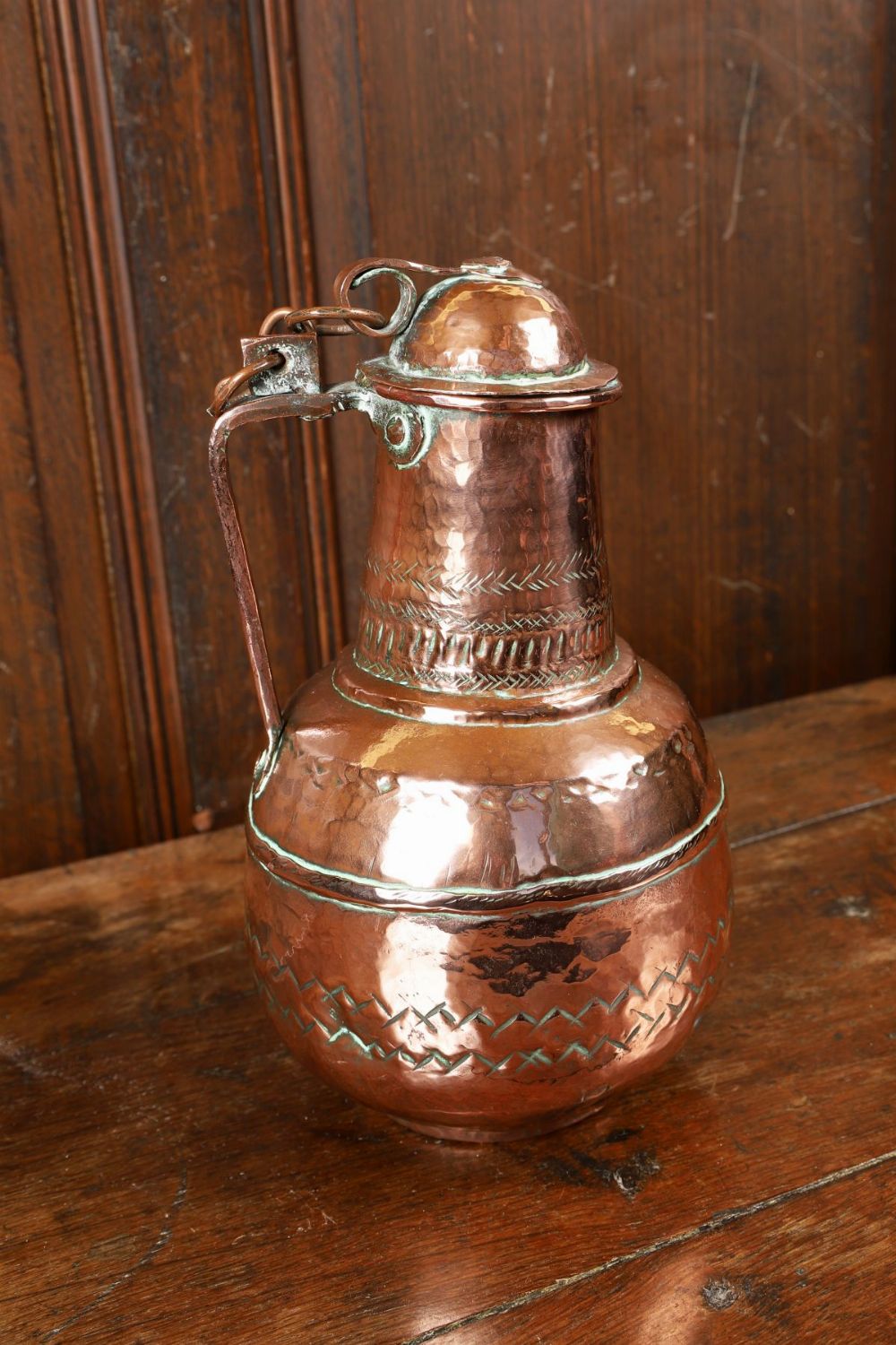 A 19th-century Moroccan copper ewer, of baluster form with domed cover, chain-linked lid and shaped spout, the surface with incised decoration and areas of verdigris patination.