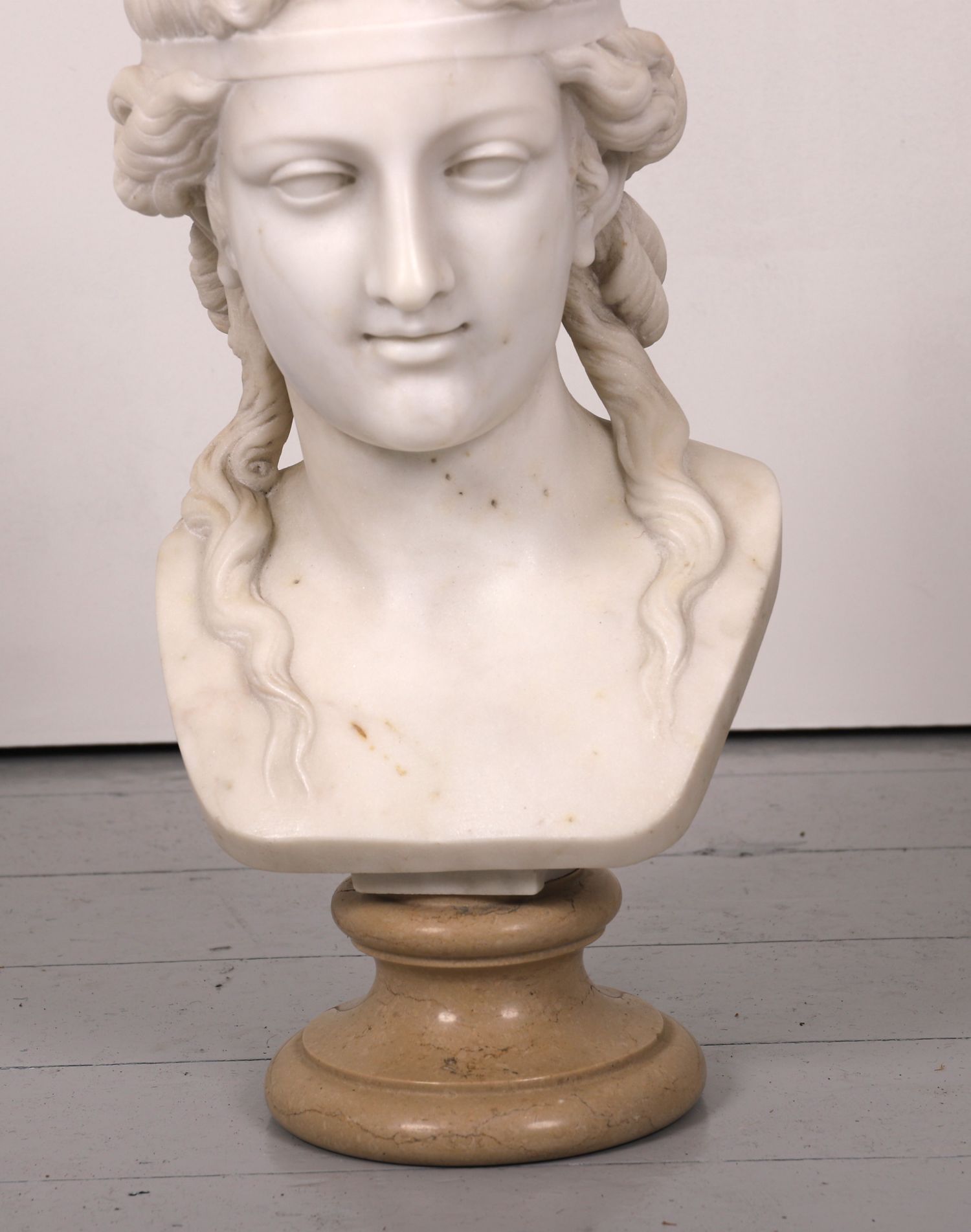 A finely carved white marble bust of a young woman with braided hair bound in a fillet, raised on a circular marble socle. Classical in style, possibly representing a muse or an idealised female figure of antiquity.