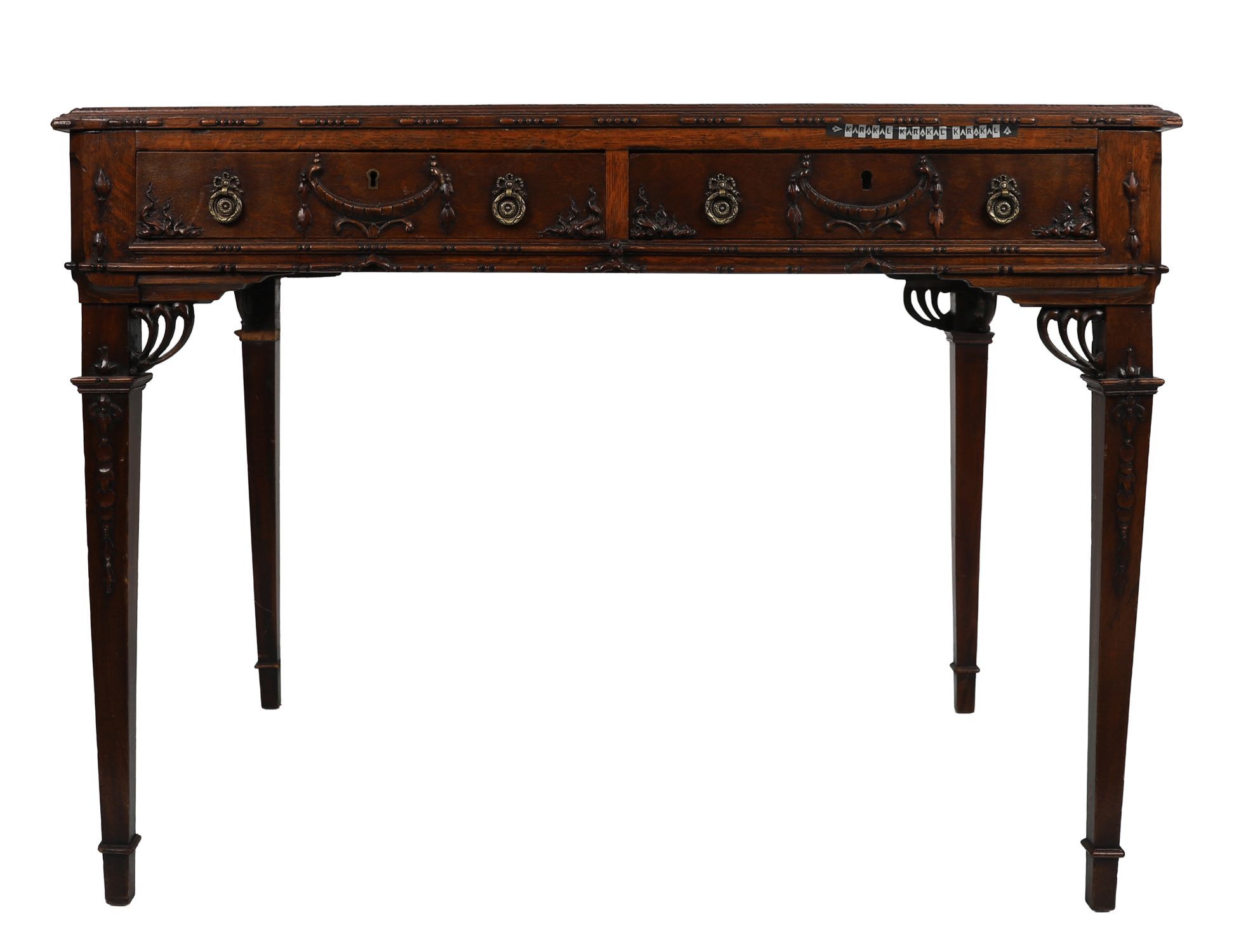 A fine 19th century oak library table, finished in the round, in the Adam style. The frieze fitted with two drawers to one side, decorated with carved swags and rosettes, and raised on square tapering legs with carved capitals and spade feet. The table is richly detailed with classical motifs, reflecting the influence of Robert Adam.