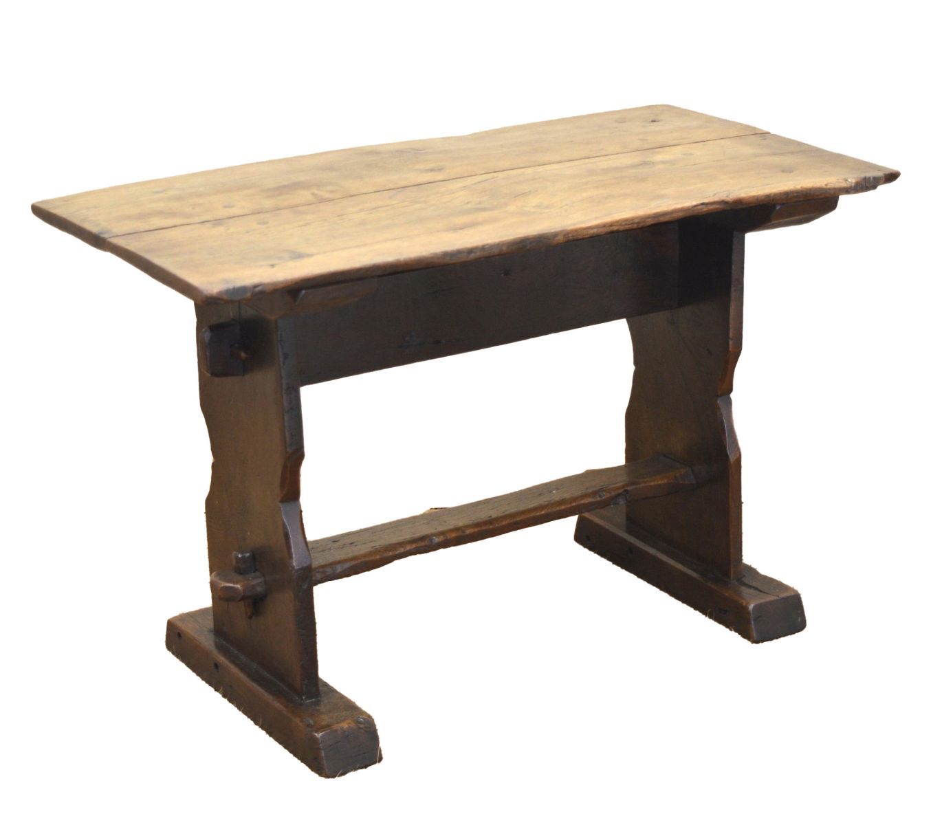 the solid rectangular top raised on panelled trestle-style ends, joined by a central stretcher; of substantial construction, typical of tavern or communal dining use.