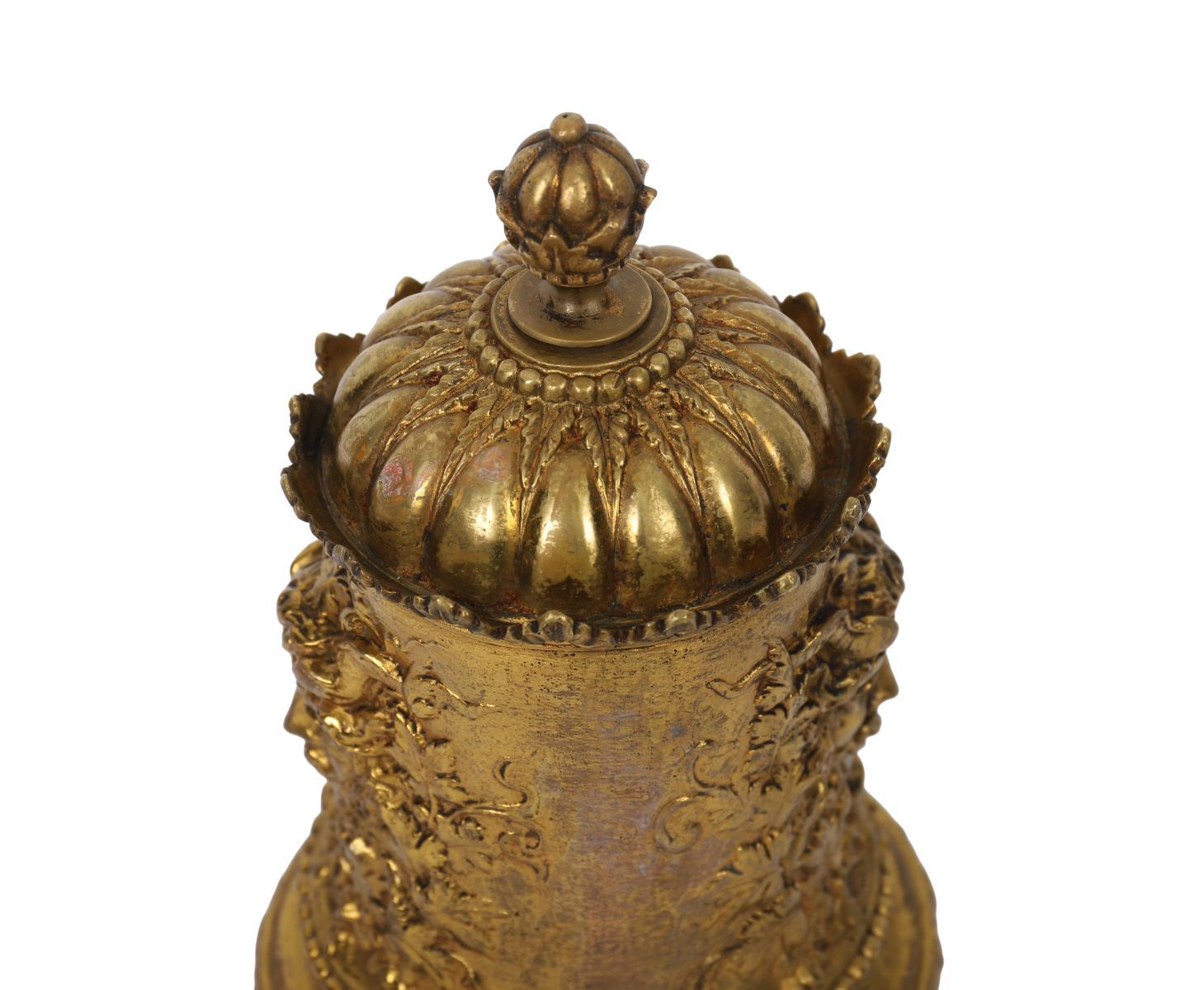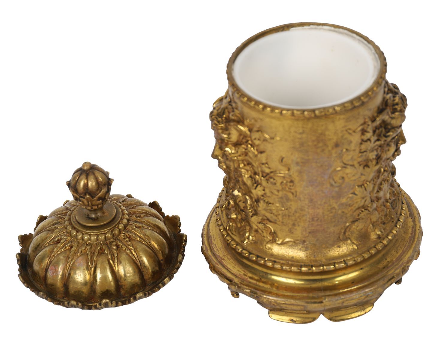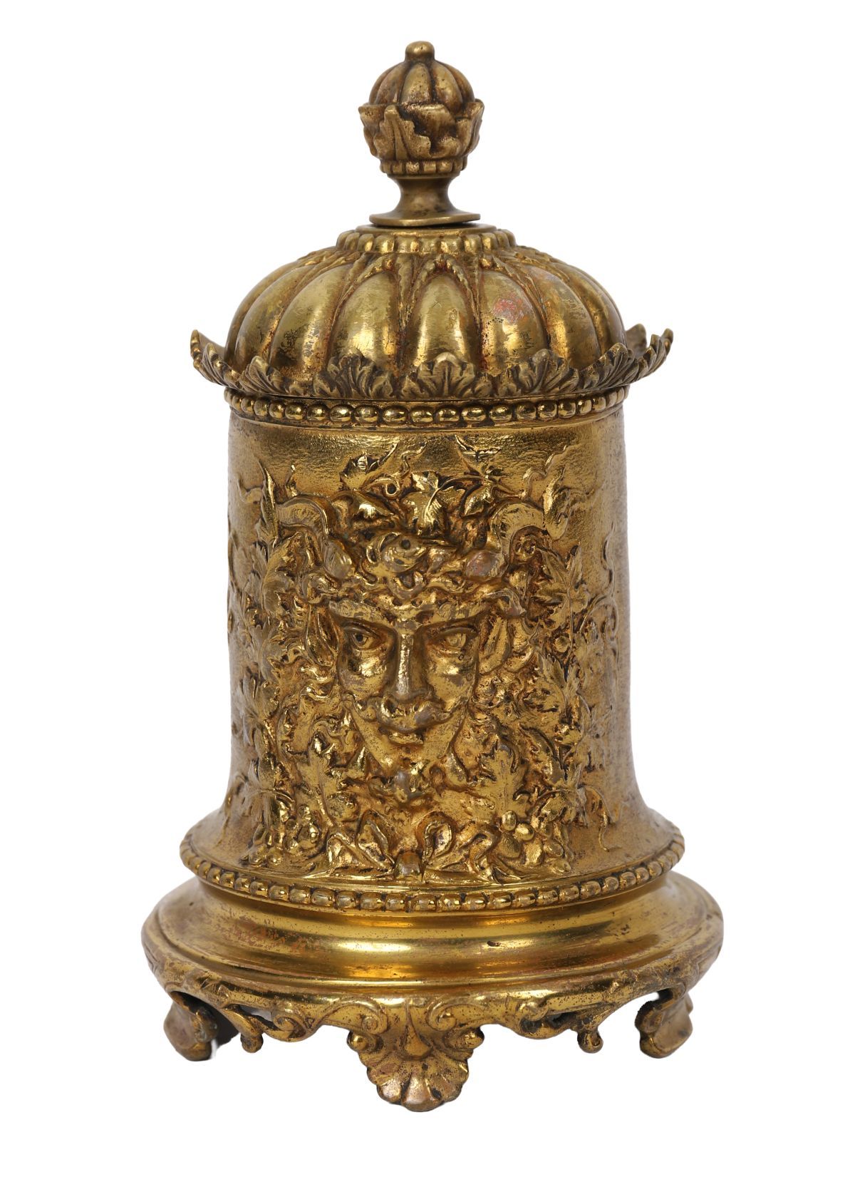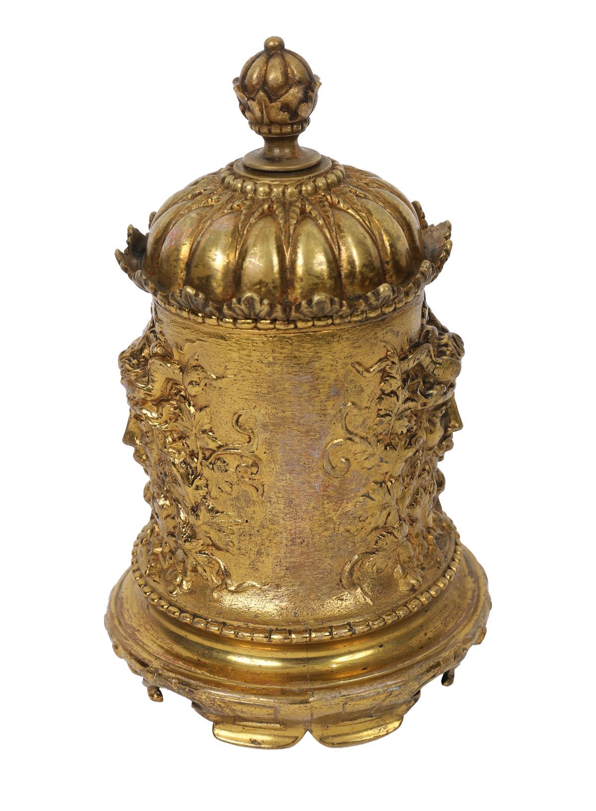 Finely cast gilt metal caddy of cylindrical form, decorated with foliate and Bacchic mask reliefs, the domed lid with acorn finial and interior fitted with a porcelain liner.
