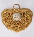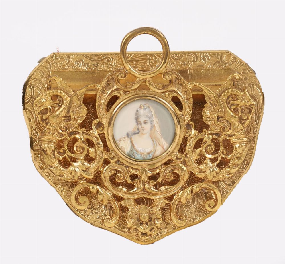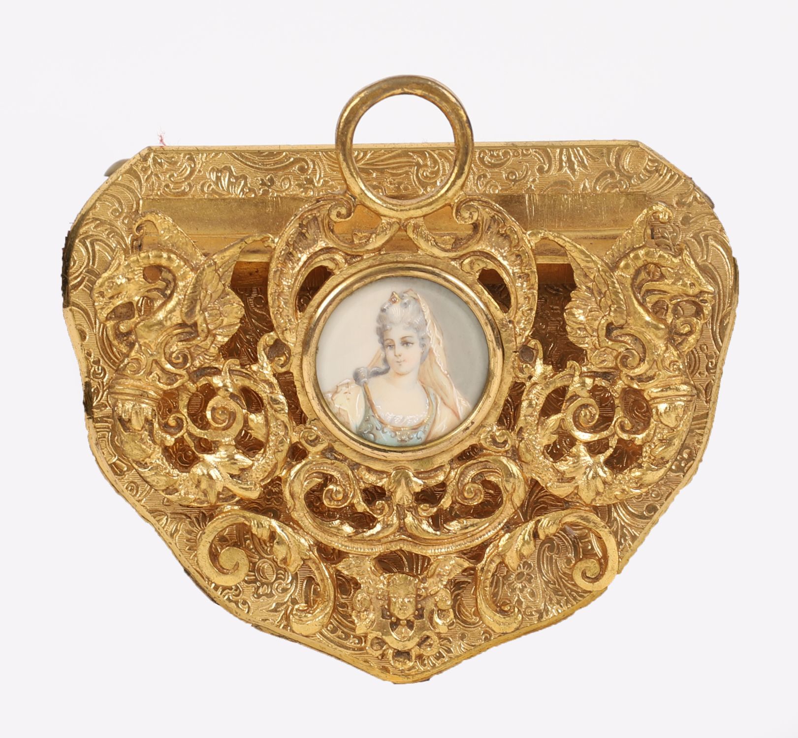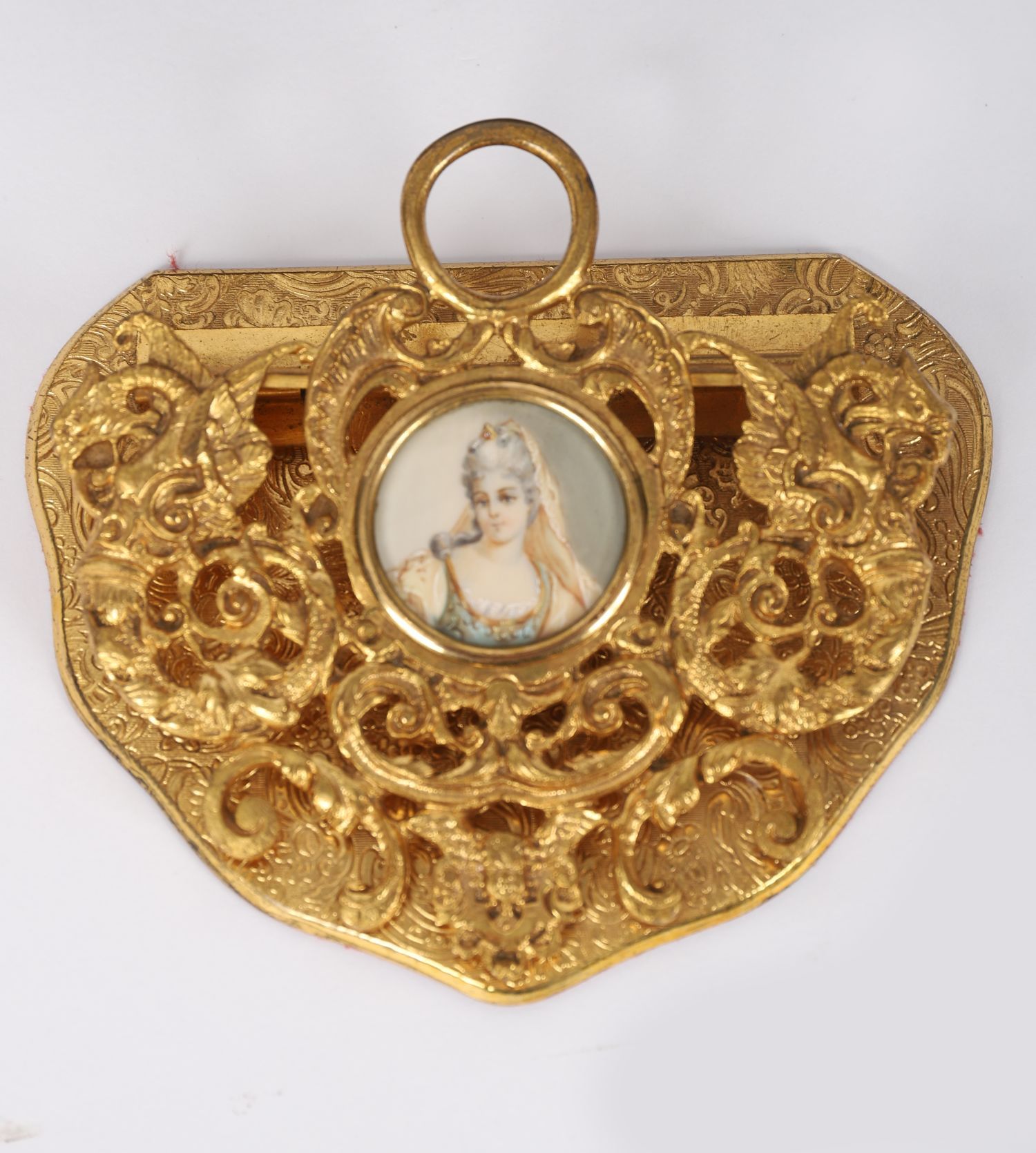 A 19th century ormolu desk tidy or paper clip, cast with scrolling foliage and dragons, centred by a circular portrait miniature of a lady in period costume. Both decorative and practical, combining fine metalwork with miniature portraiture.