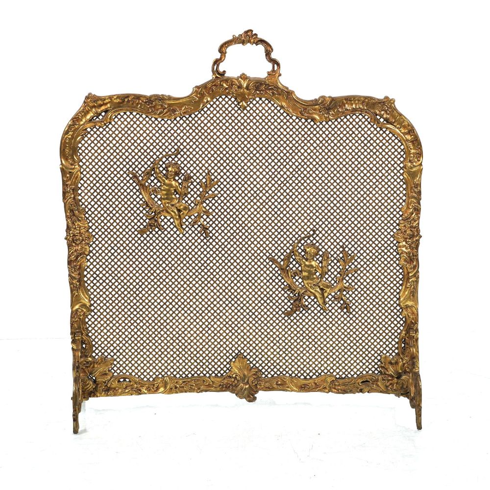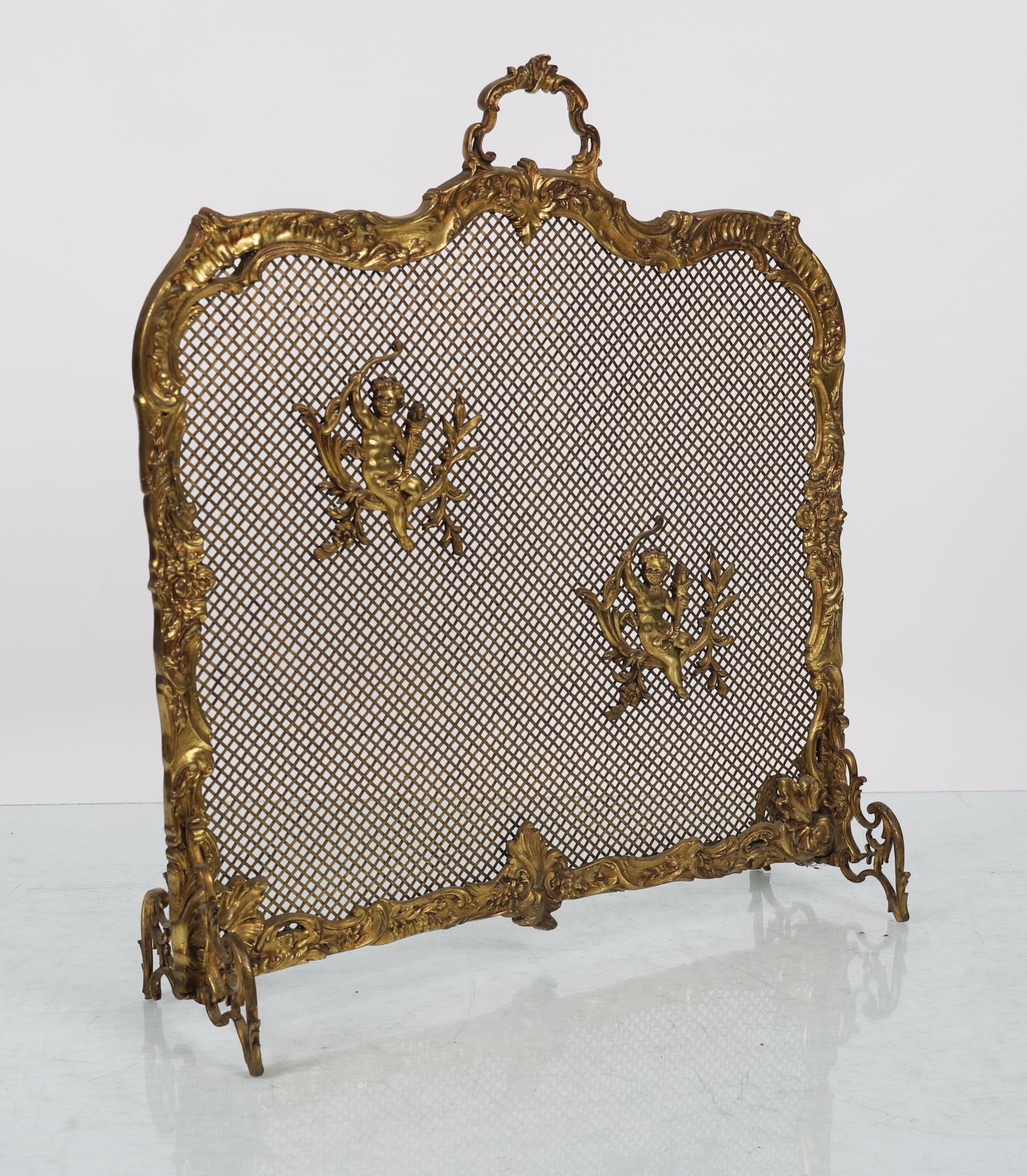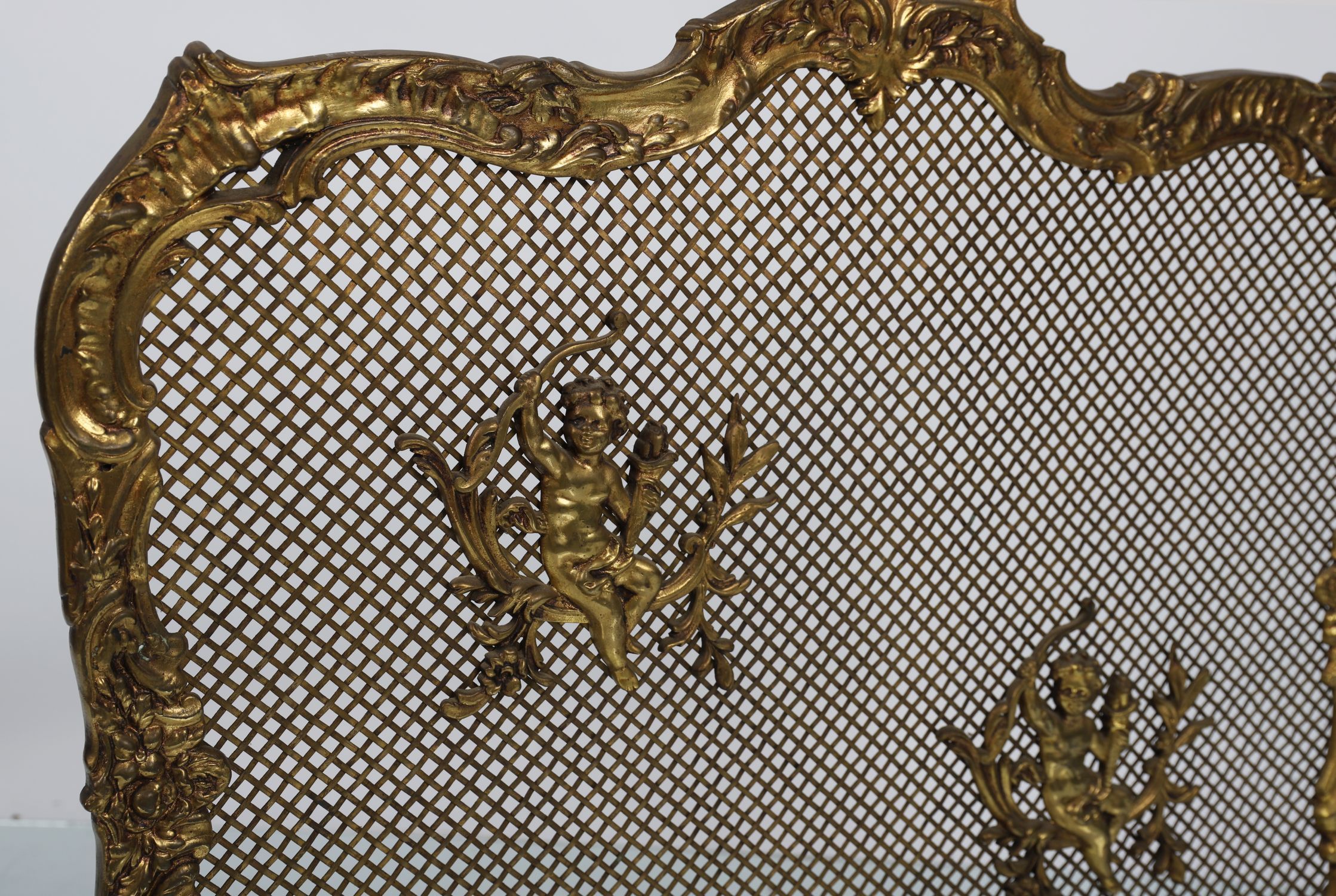 A fine 19th-century French ormolu fire screen, the pierced mesh panel surmounted by a central cartouche and ribbon crest, with cherub, scroll, and floral cast ornament, raised on scrolled supports.