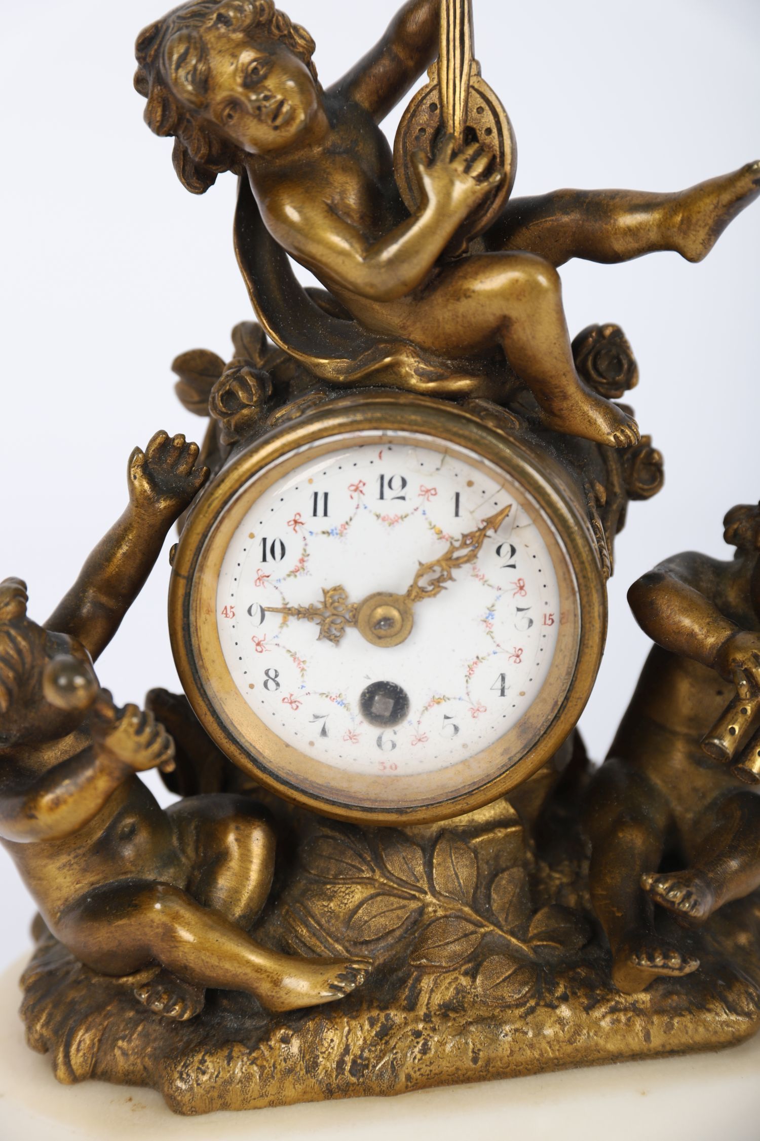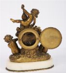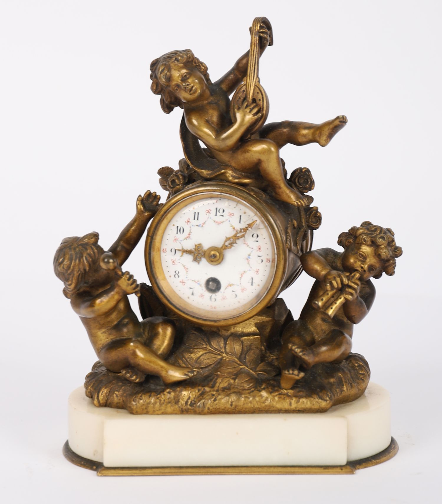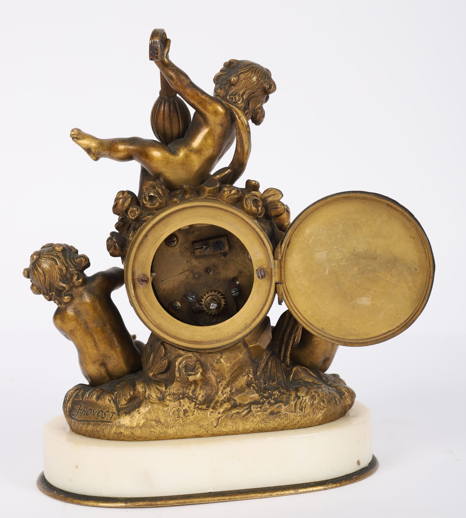 A decorative 19th century ormolu mantel clock of Rococo influence, surmounted by a finely modelled cherub playing a mandolin, flanked by two further putti musicians to either side of the enamel dial with Roman numerals. The clock is raised on a shaped white marble base, the gilt bronze with rich patination and intricate detailing. A charming piece, combining the playful spirit of 19th century design with the elegance of ormolu craftsmanship. Signed E. Provost .