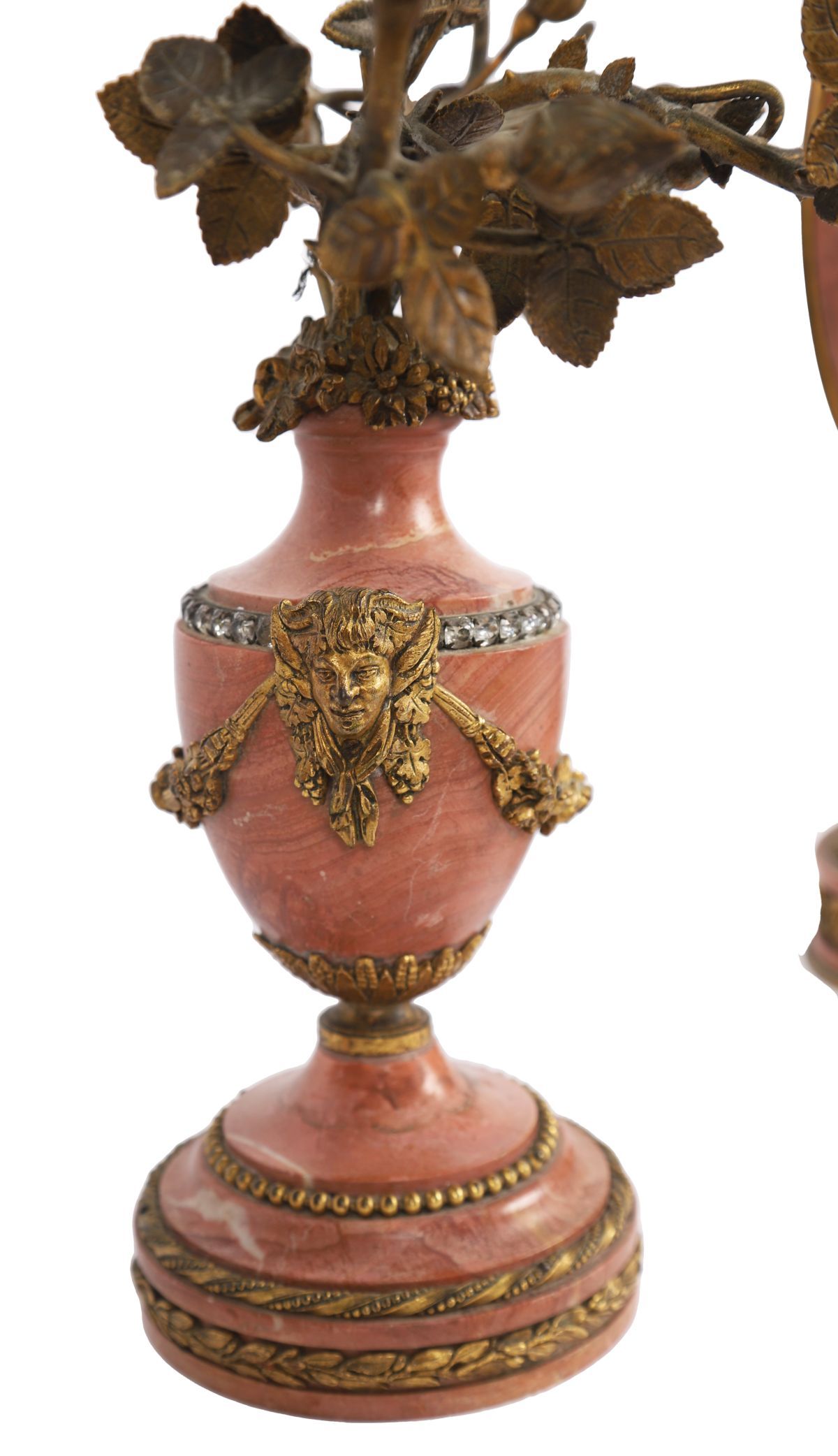 19th-century French clock set, the lyre-shaped case housing a circular enamel dial, mounted throughout with cast ormolu, flanked by a pair of matching garniture vases fitted with foliate candle branches.