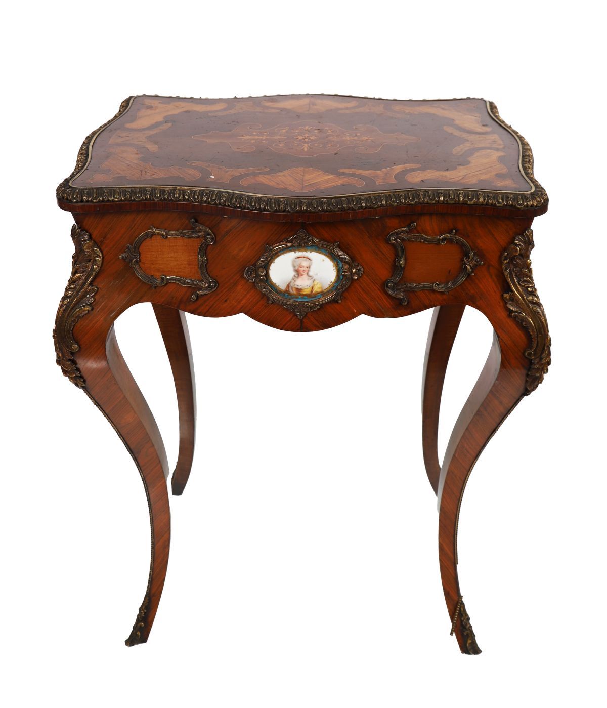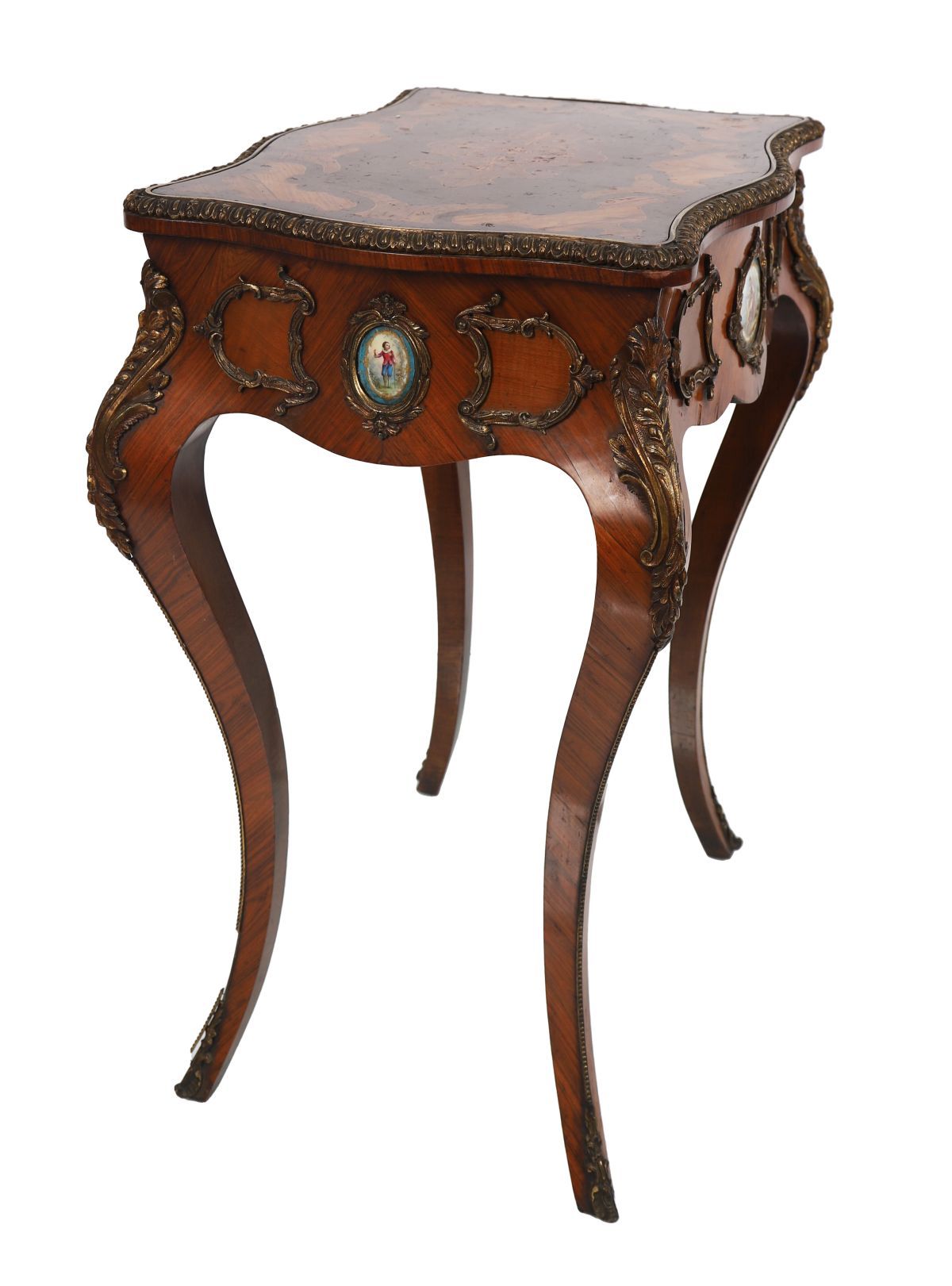 19th-century kingwood worktable, the shaped top inset with a Sèvres porcelain panel, above a fitted frieze drawer, mounted throughout with cast ormolu and raised on cabriole legs.