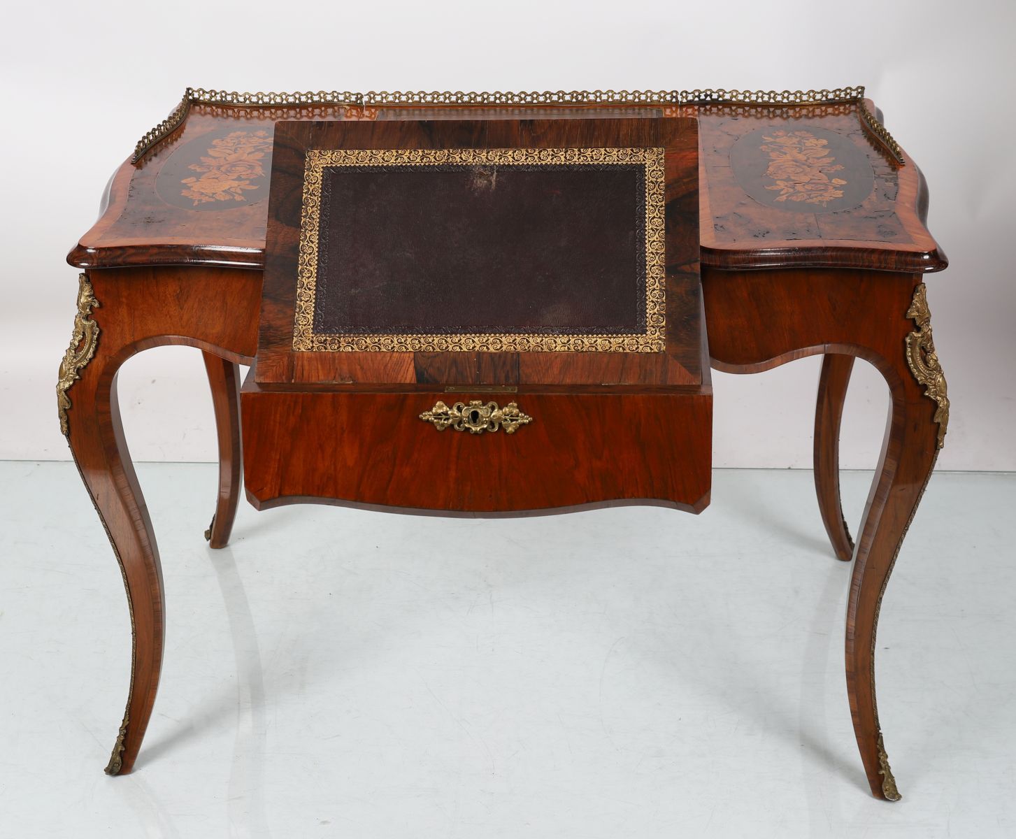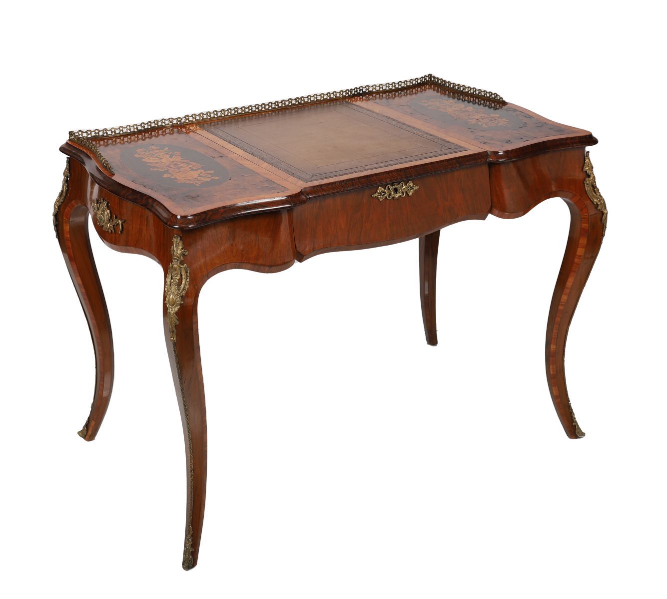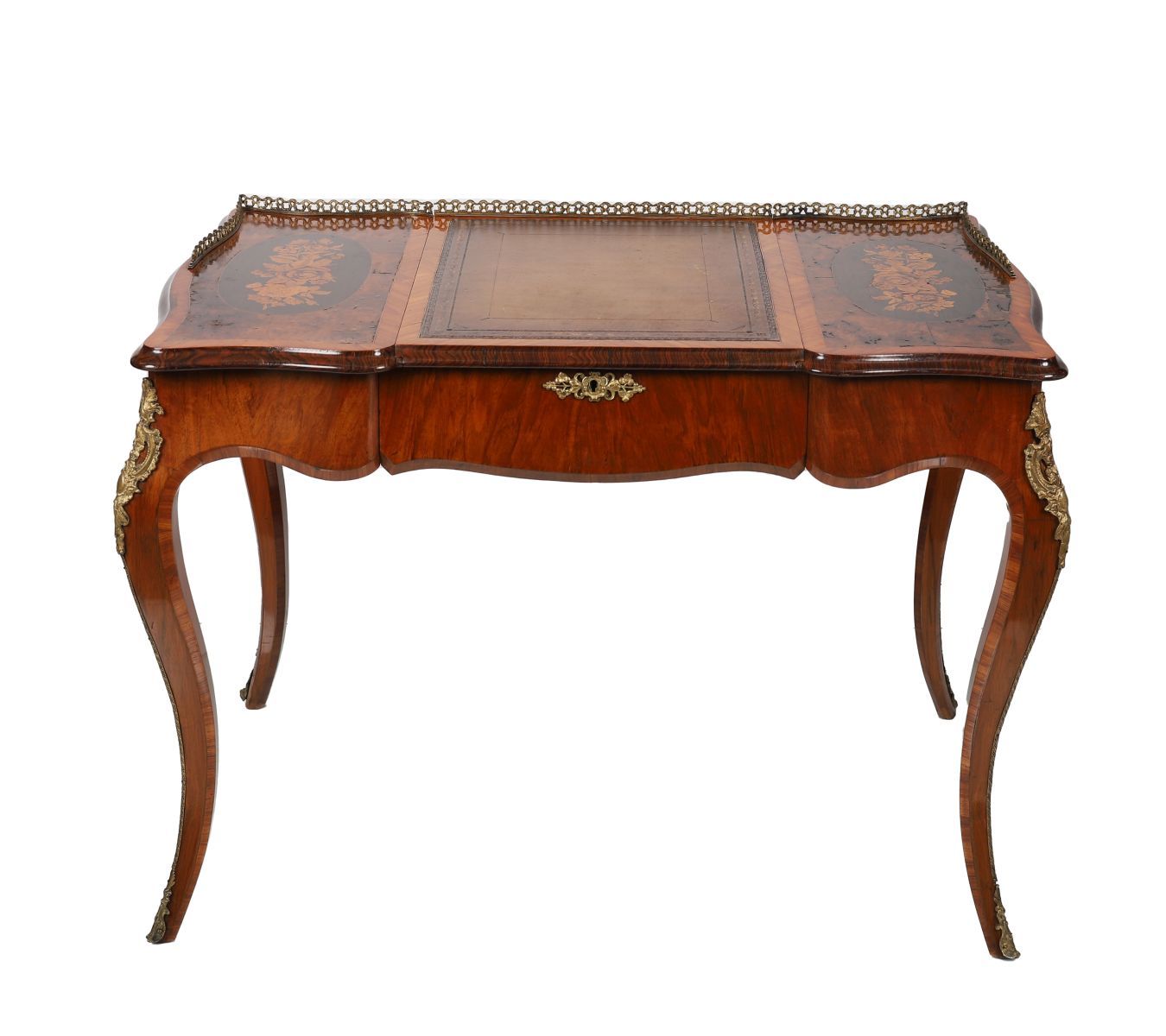 A fine 19th-century ormolu-mounted walnut and marquetry bureau plat, the rectangular top with a gilt-tooled leather writing surface flanked by floral marquetry panels, fitted with a frieze drawer and ormolu mounts to the corners and knees, on cabriole legs terminating in sabots. The top opens to reveal a compartmented interior.