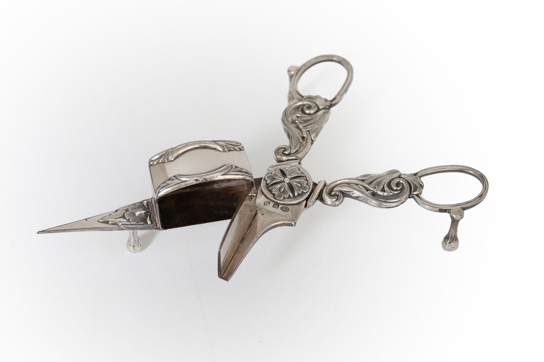 Lot 461 19TH-CENTURY ORNATE SHEFFIELD CANDLE SNUFFER ON TRAY
