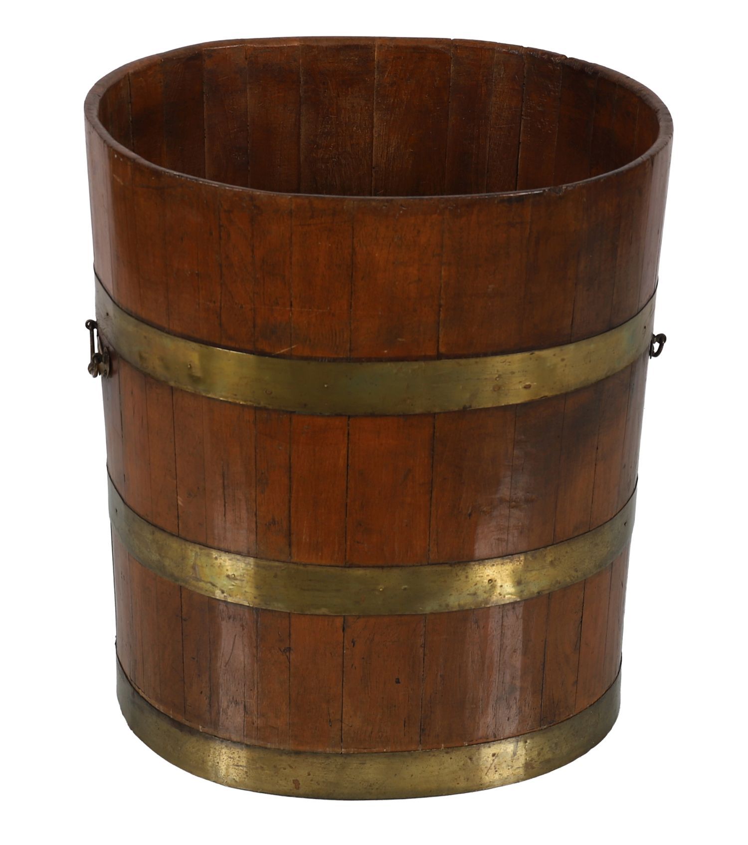 A 19th-century oval oyster bucket in coopered mahogany with twin brass bands and side swing handles.