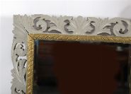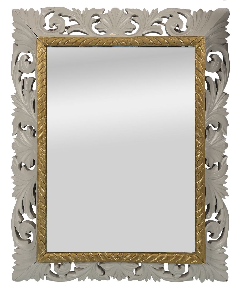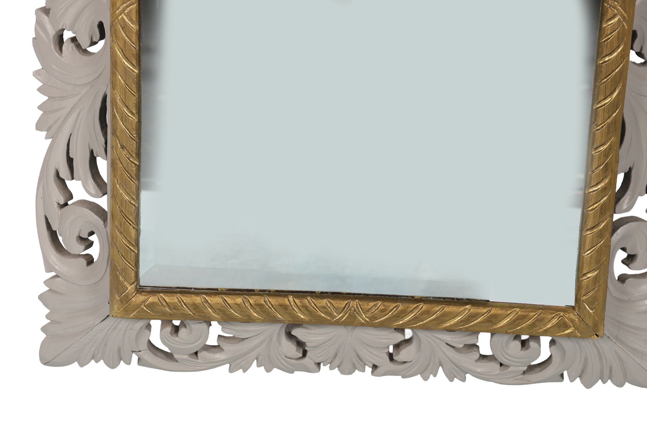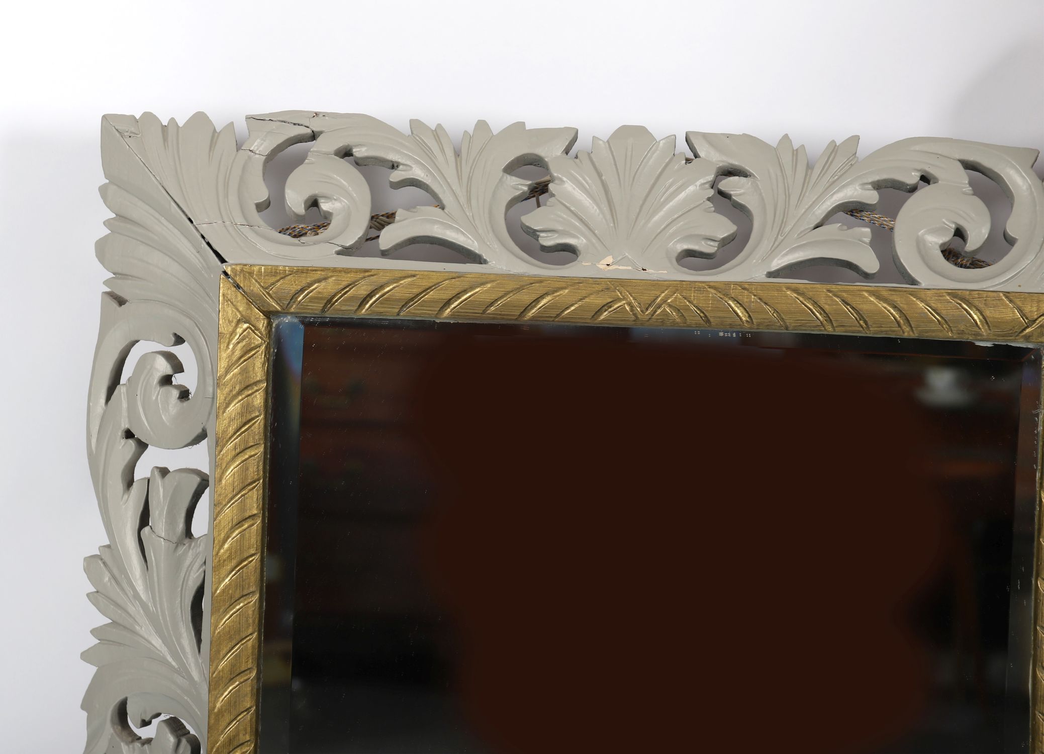 A finely carved 19th century rectangular cushion mirror, the inner frame highlighted in gilt with diagonal leaf detailing, surrounded by a wide border of painted and pierced acanthus leaf scrollwork. The gilt and painted finish enhances the depth of the carved foliate decoration, producing an elegant contrast between the gold and muted tones.