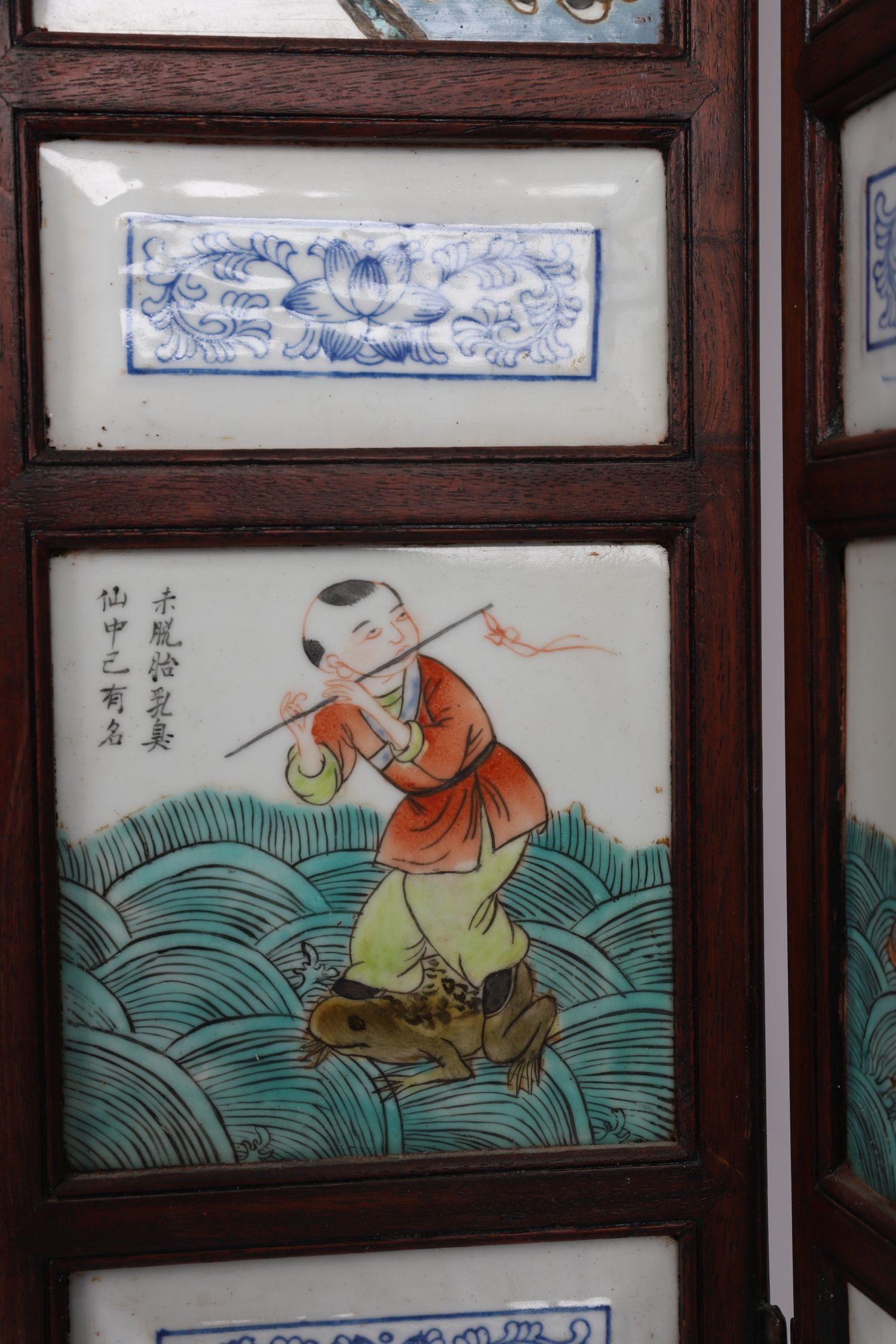 A pair of six-leaf scholar's folding screens, each inset with porcelain plaques finely painted in famille rose enamels with scenes of scholars, attendants, and children at leisure in garden settings, interspersed with calligraphic inscriptions in black script. Framed in hardwood with lacquered panels and decorative borders. Such miniature folding screens were prized as studio furniture, combining artistic appreciation with scholarly refinement.