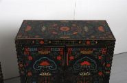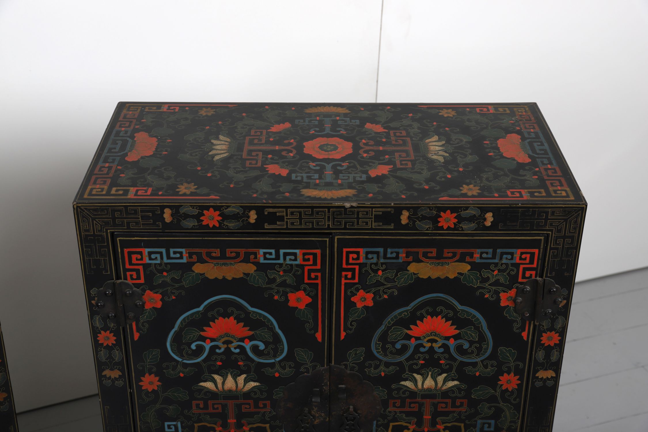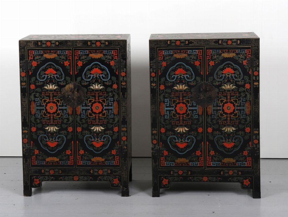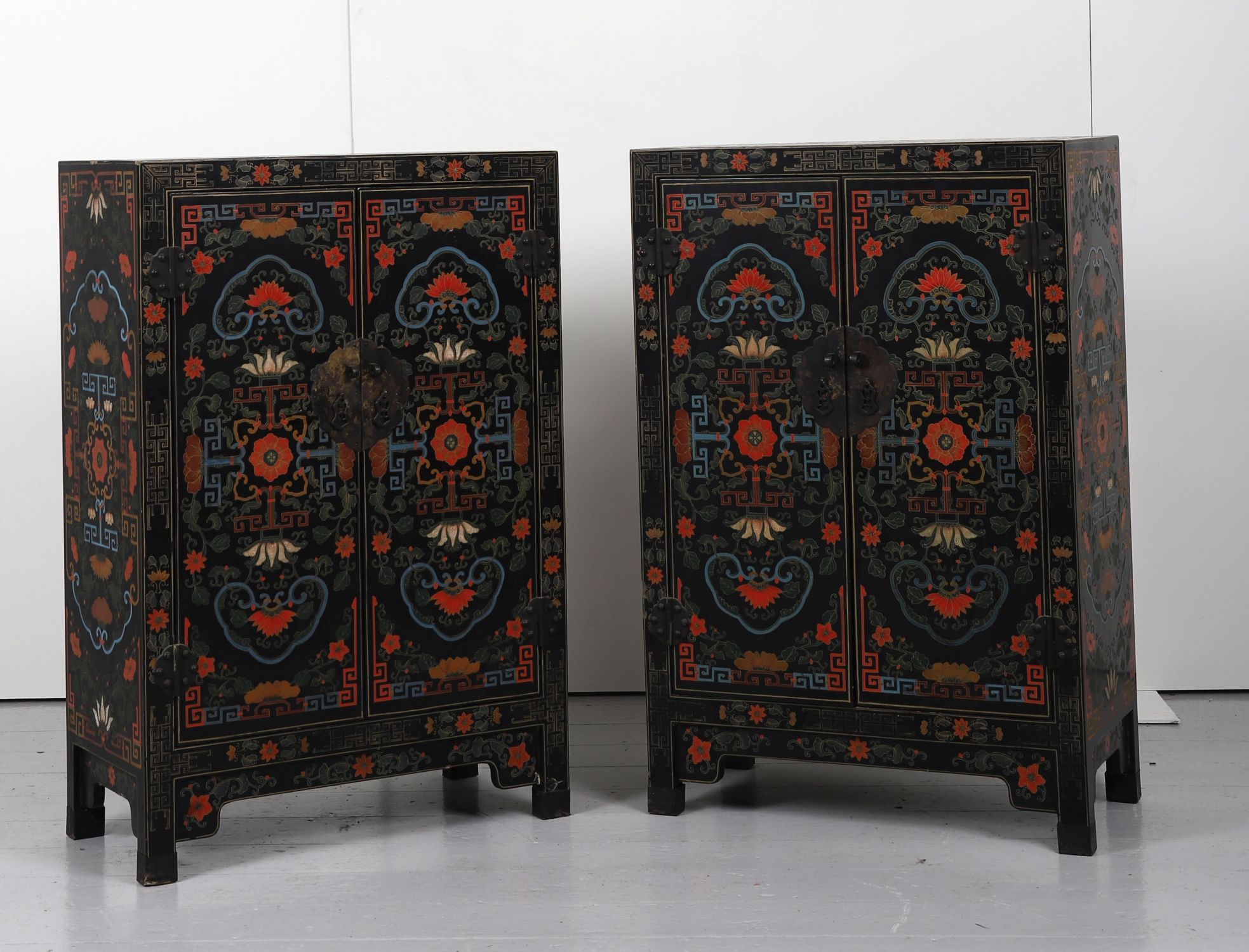 A matched pair of lacquered cabinets, decorated in polychrome with stylised peony blossoms and scrolling foliate motifs on a black ground, fitted with circular brass lockplates. The sides and tops decorated en suite with floral reserves.