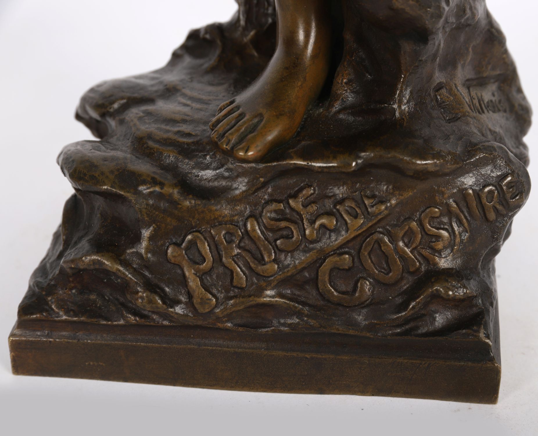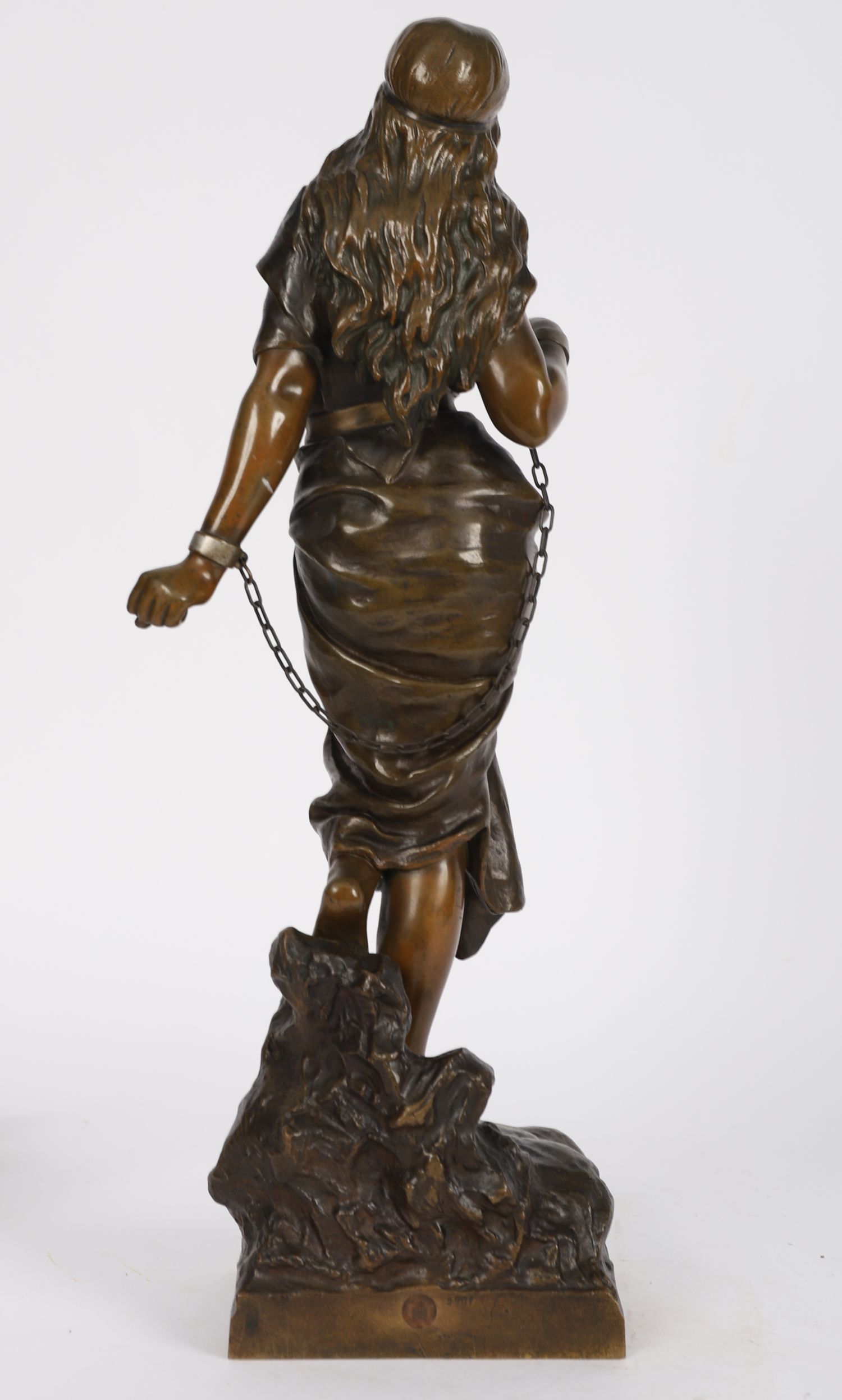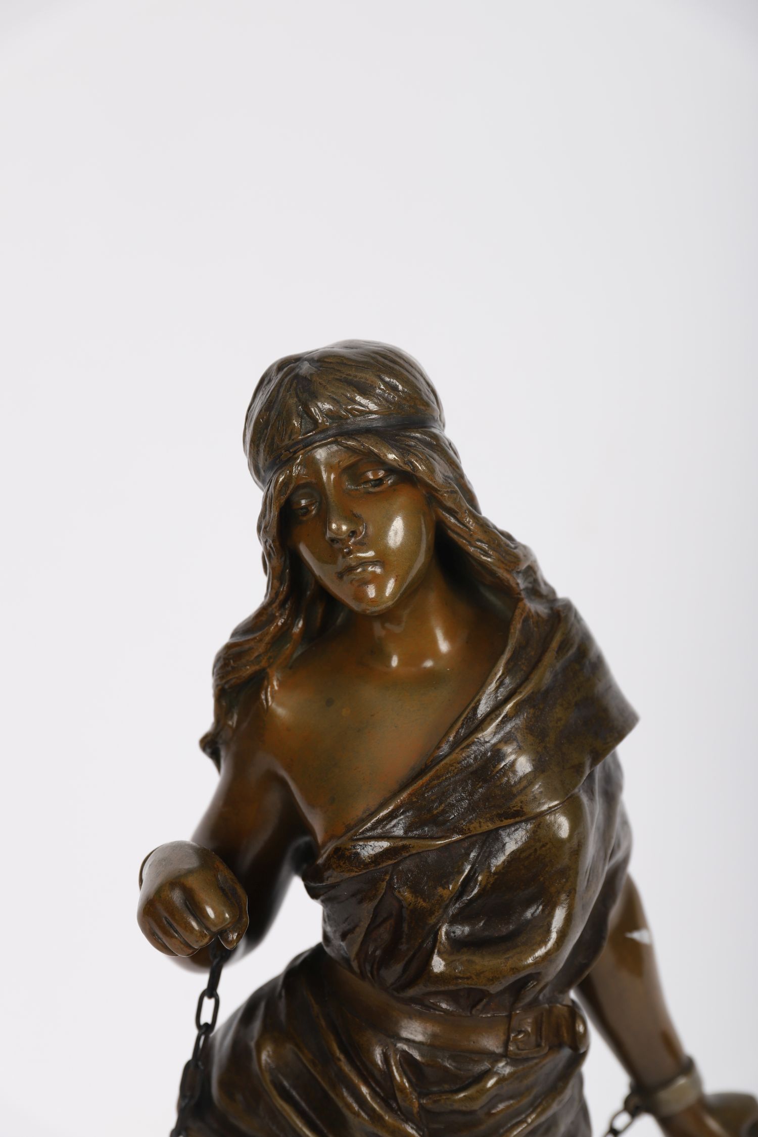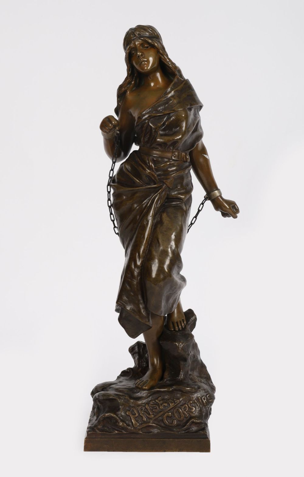 A dramatic 19th-century patinated bronze figure titled L’Esclave, signed H. Risch, depicting a standing barefoot female captive in loosely draped garments, her wrists bound by chains. Cast in expressive detail with flowing robes, defined musculature, and emotional realism, the sculpture stands on a naturalistic base inscribed PRISE DE CORSAIRE. Likely allegorical in nature, this work reflects 19th-century romanticism and the influence of orientalist themes.