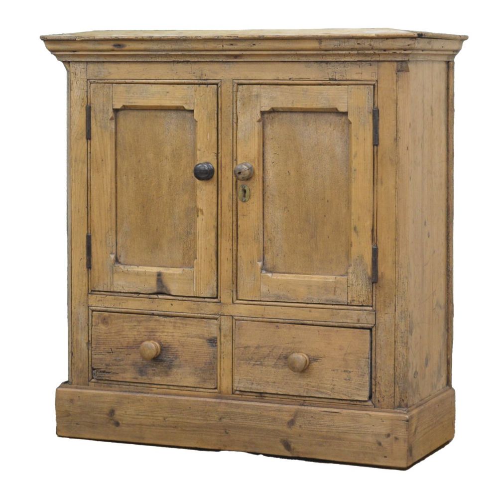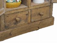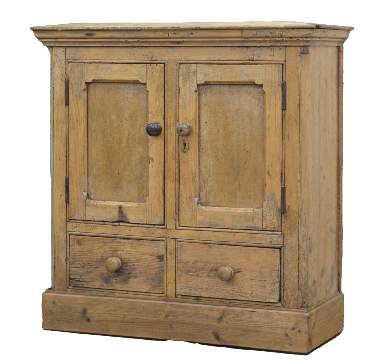 comprising two upper cupboard doors above a pair of short drawers, with round wooden knobs; used for storing dried goods and kitchenware.