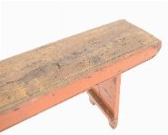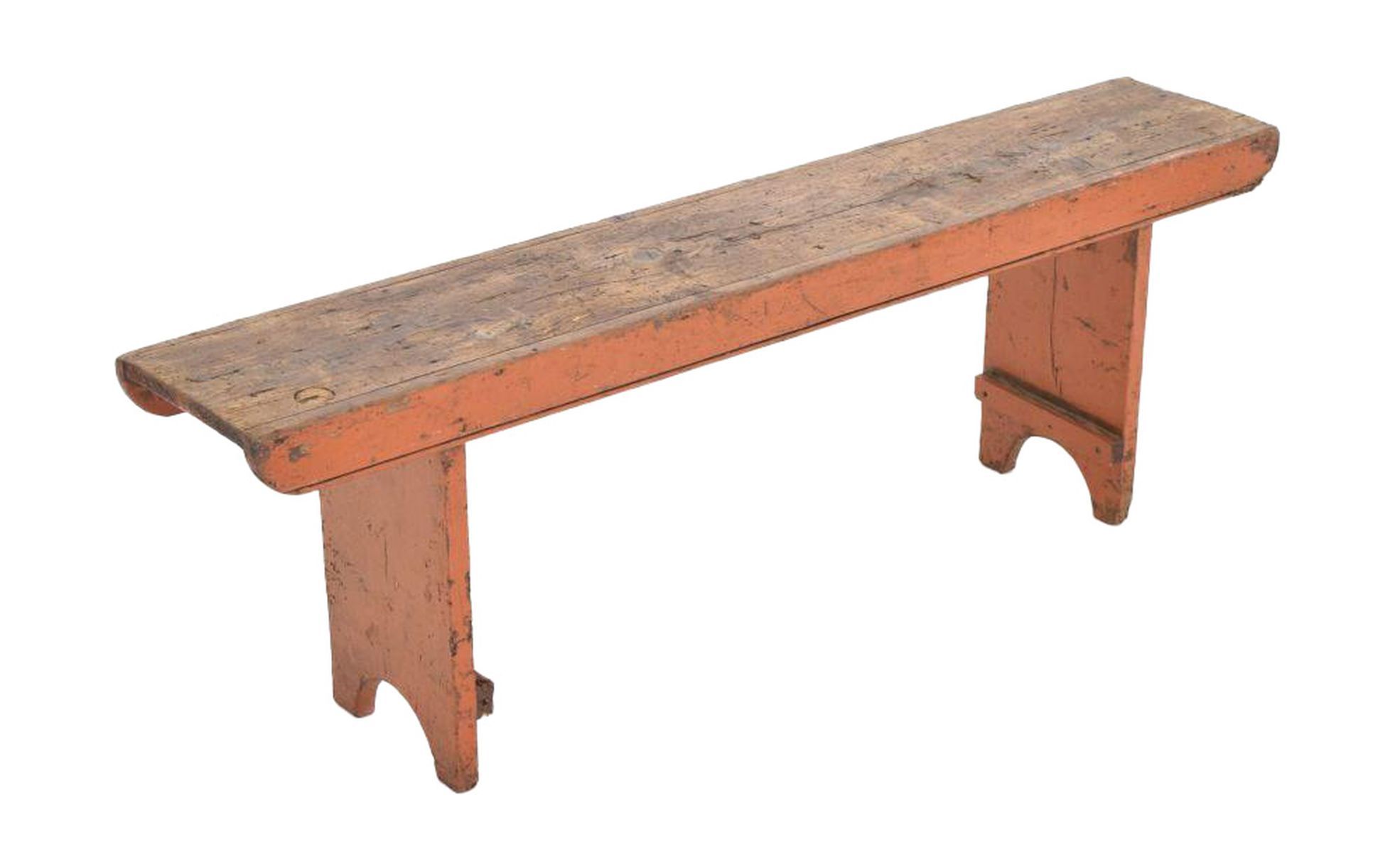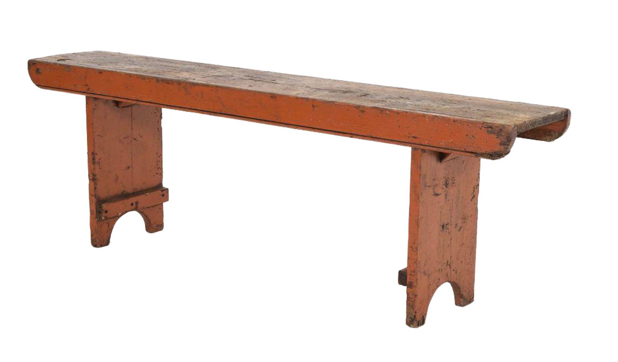 A 19th-century pine kitchen bench, retaining its original ochre-red paint. The single plank seat is raised on slab supports with arched cut-outs. Displays a well-worn surface and rich, characterful patina. A fine example of Irish vernacular furniture.