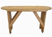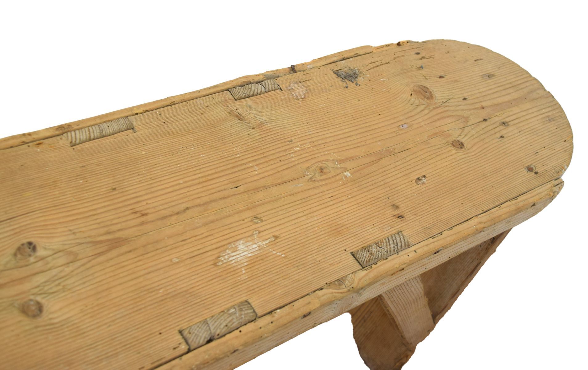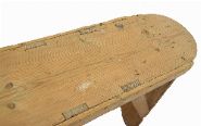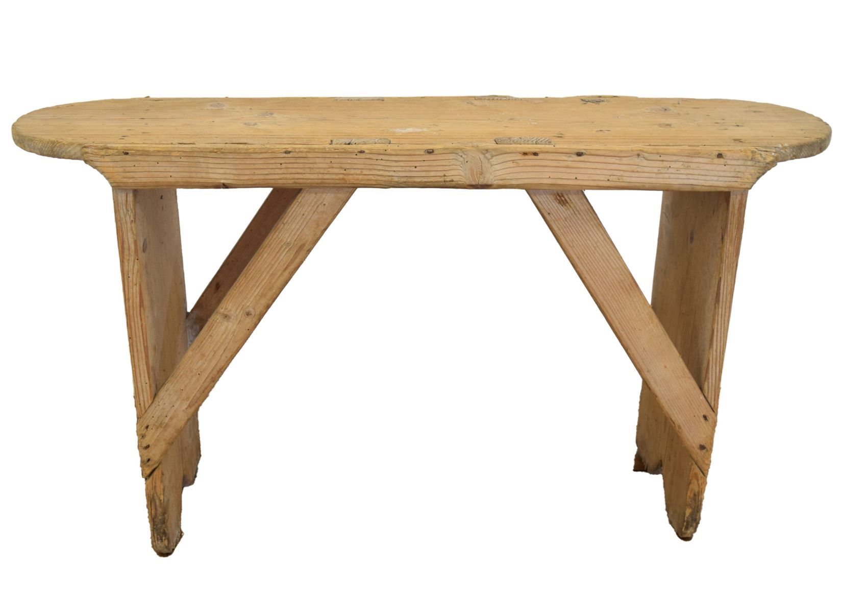 the elongated rectangular top with D-shaped ends, raised on square supports; a utilitarian item with pleasing wear.