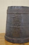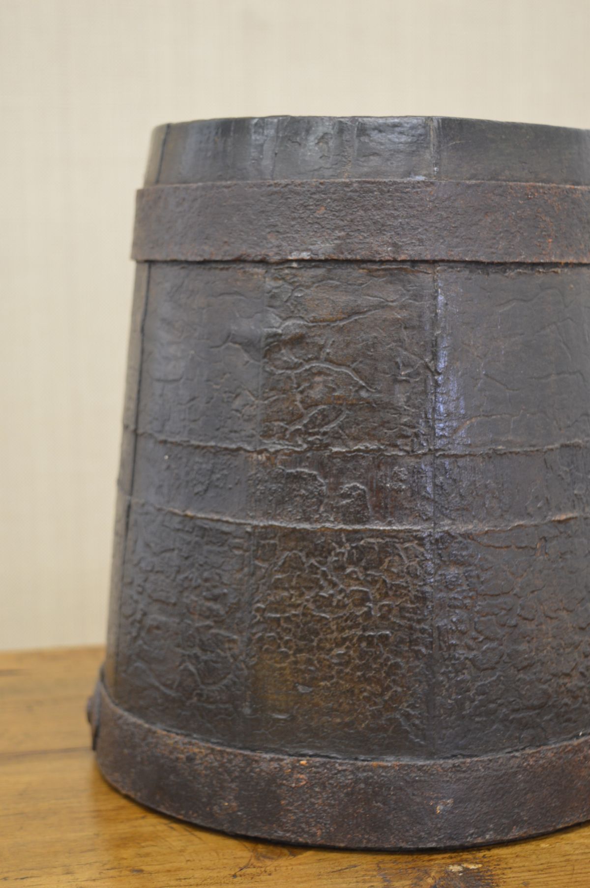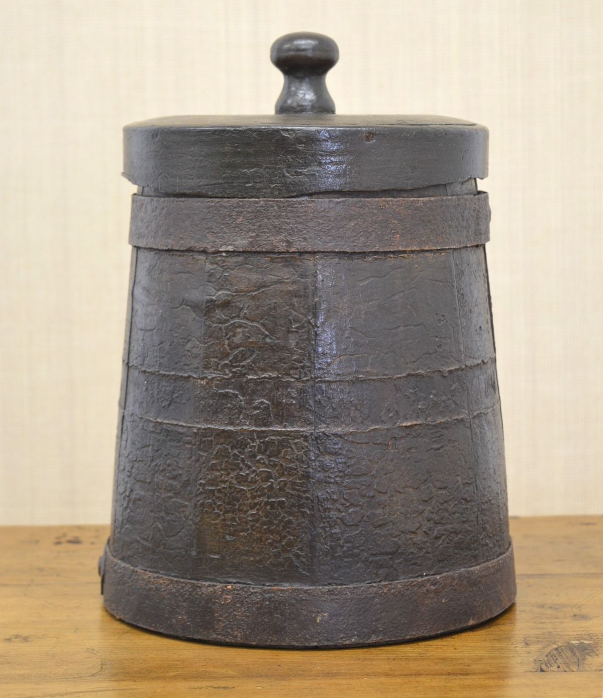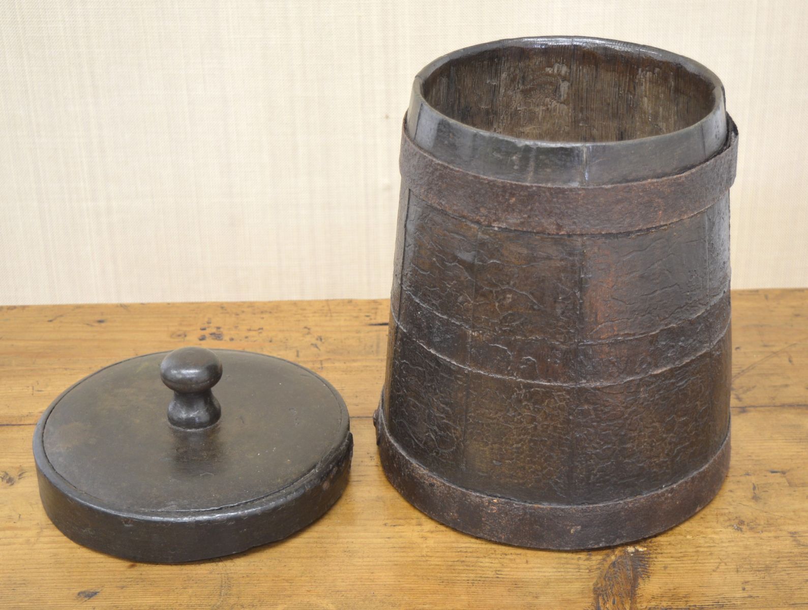 19th-century pine flour bin of tapering cylindrical form with metal bands and fitted cover with knop handle.