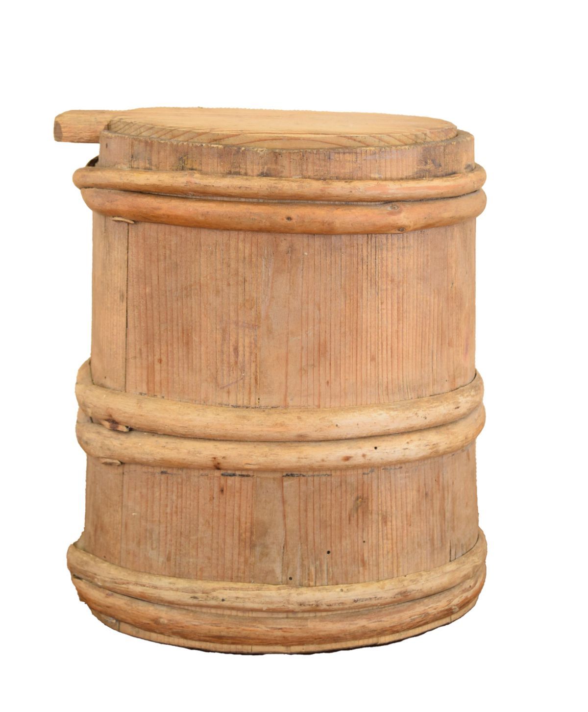coopered oval bin with fitted wooden lid, once used for flour storage in country kitchens.