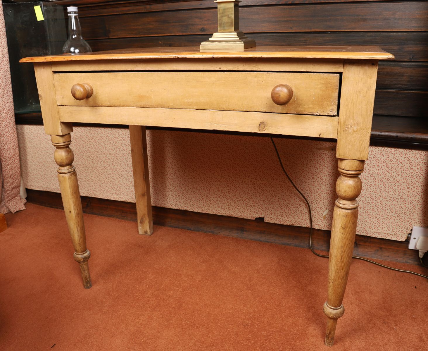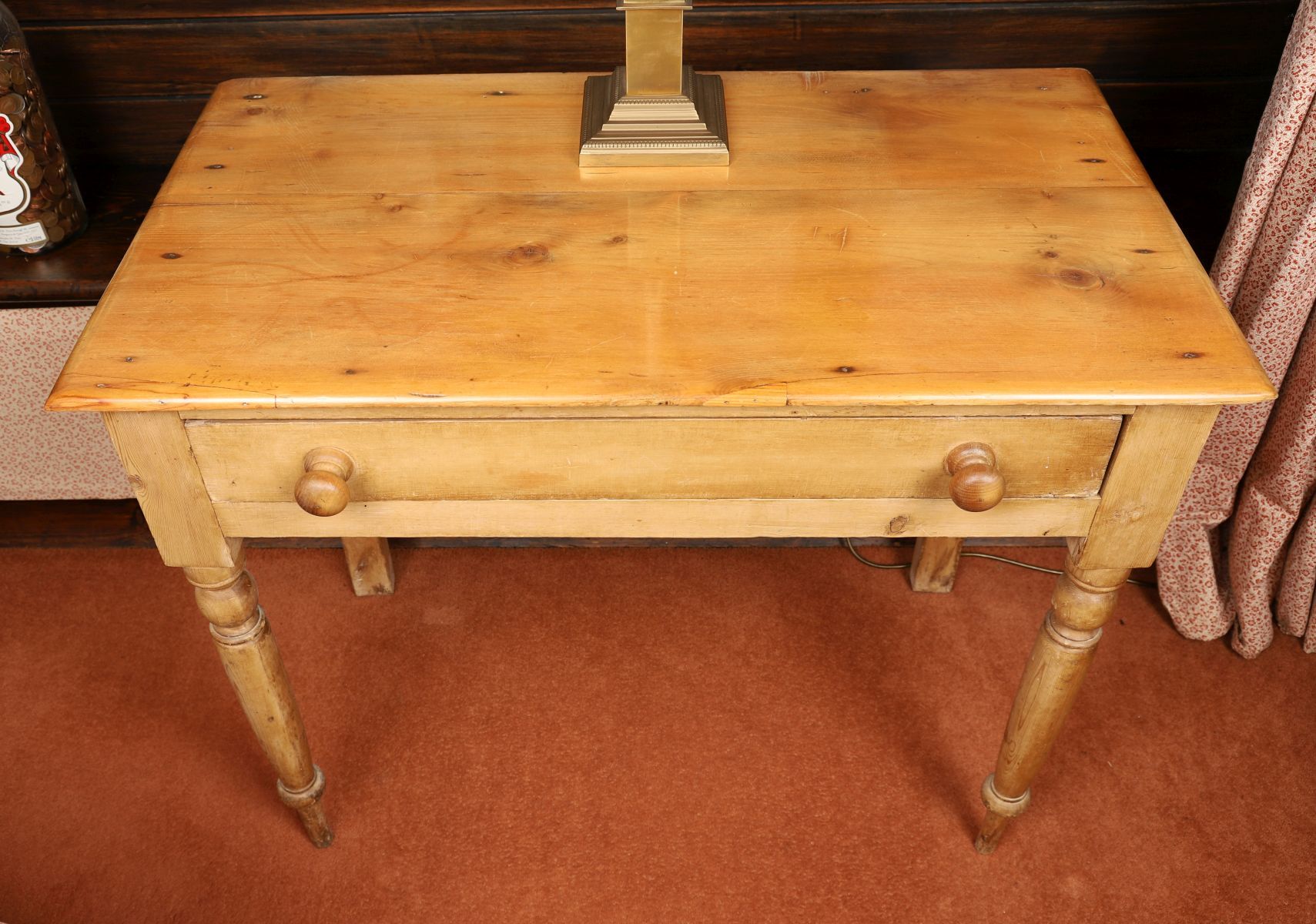 A 19th-century pine side table with rectangular top above a single frieze drawer, raised on turned legs. Plain utilitarian construction with visible grain, wear and patina.