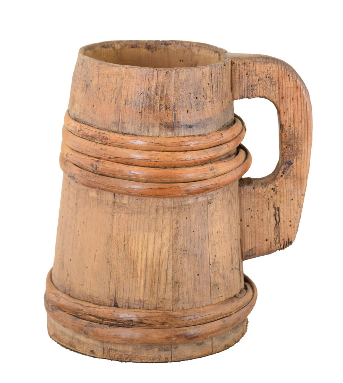 with side handle, coopered in construction, once used for domestic water storage or transport.