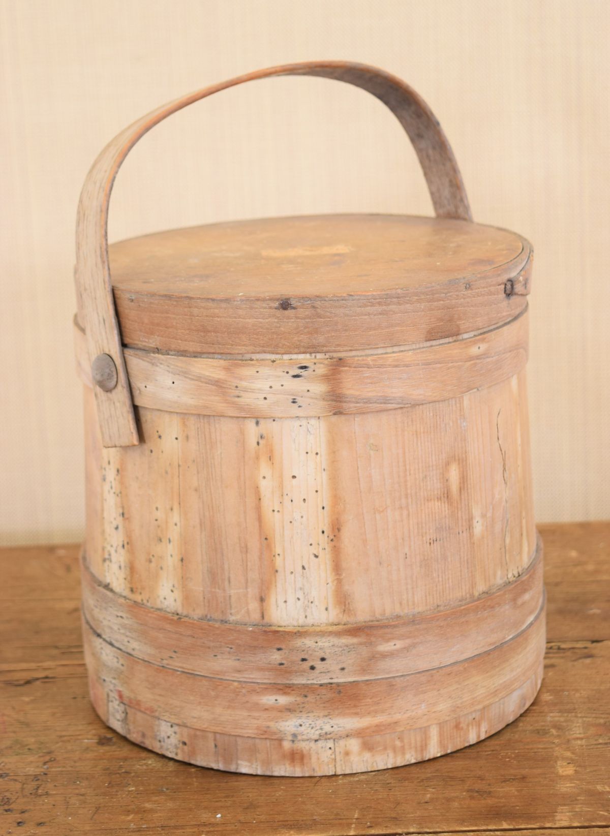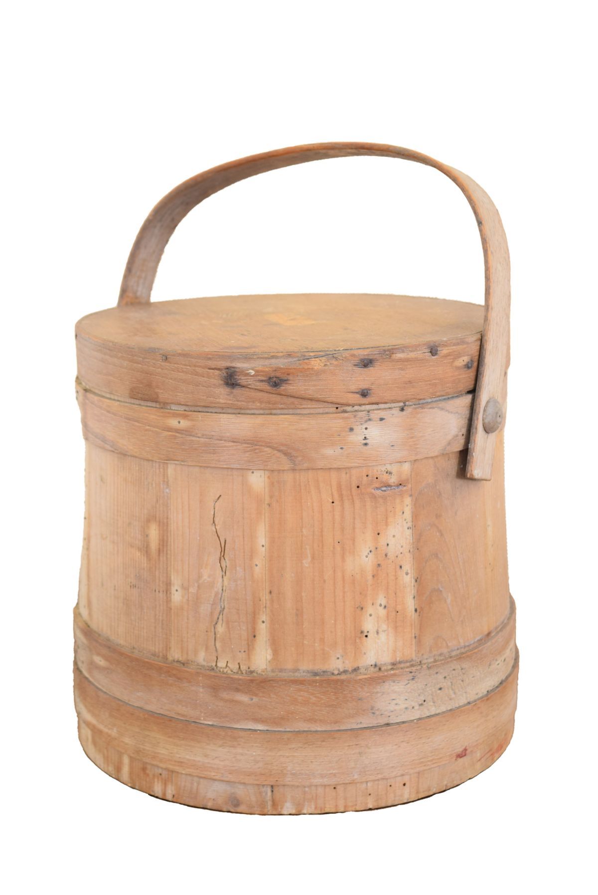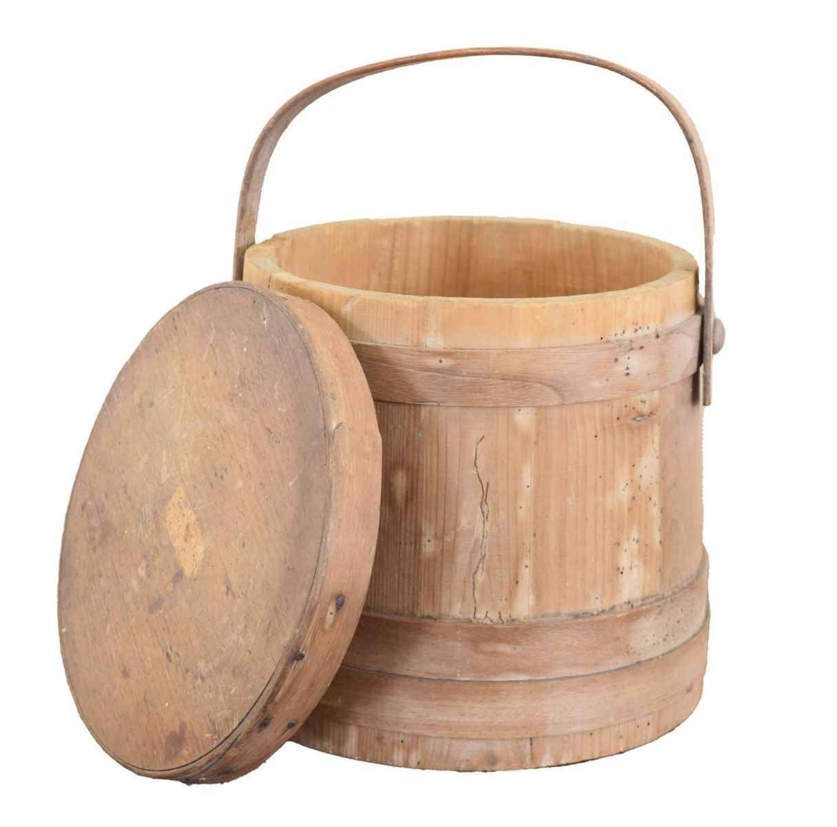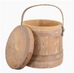 of tapered cylindrical form, with fitted swing handle and wooden lid.