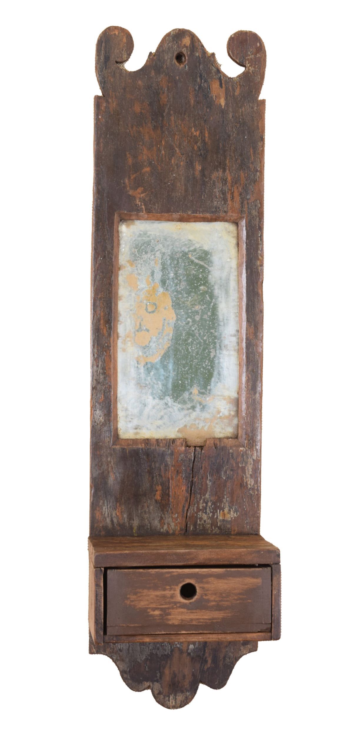 fitted with mirror and small candle drawer; a decorative and functional hallway or bedroom accessory.