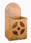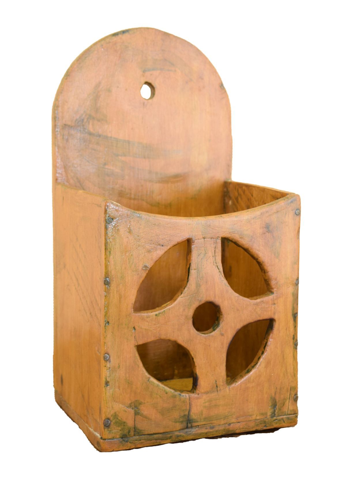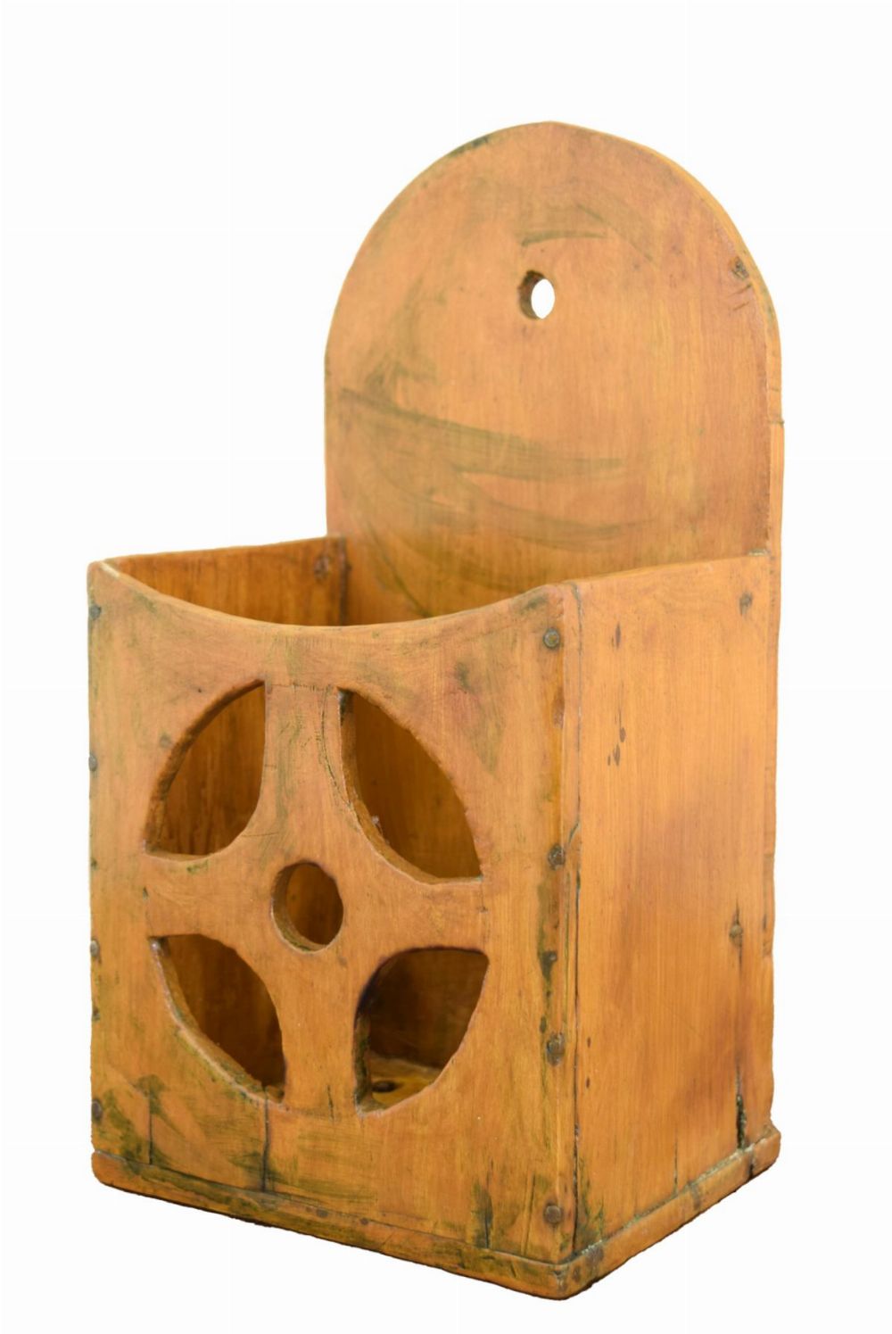 in original paint, with hinged lid and shaped backplate for mounting; used to store candles near hearth or hallway.