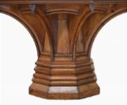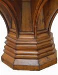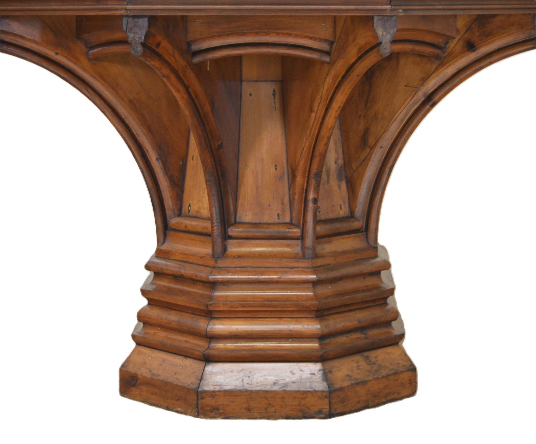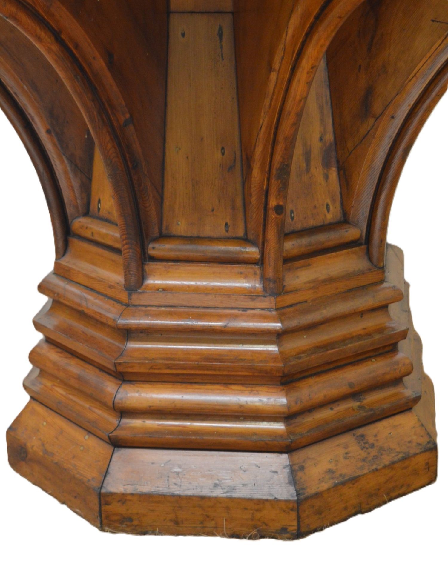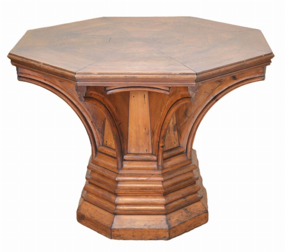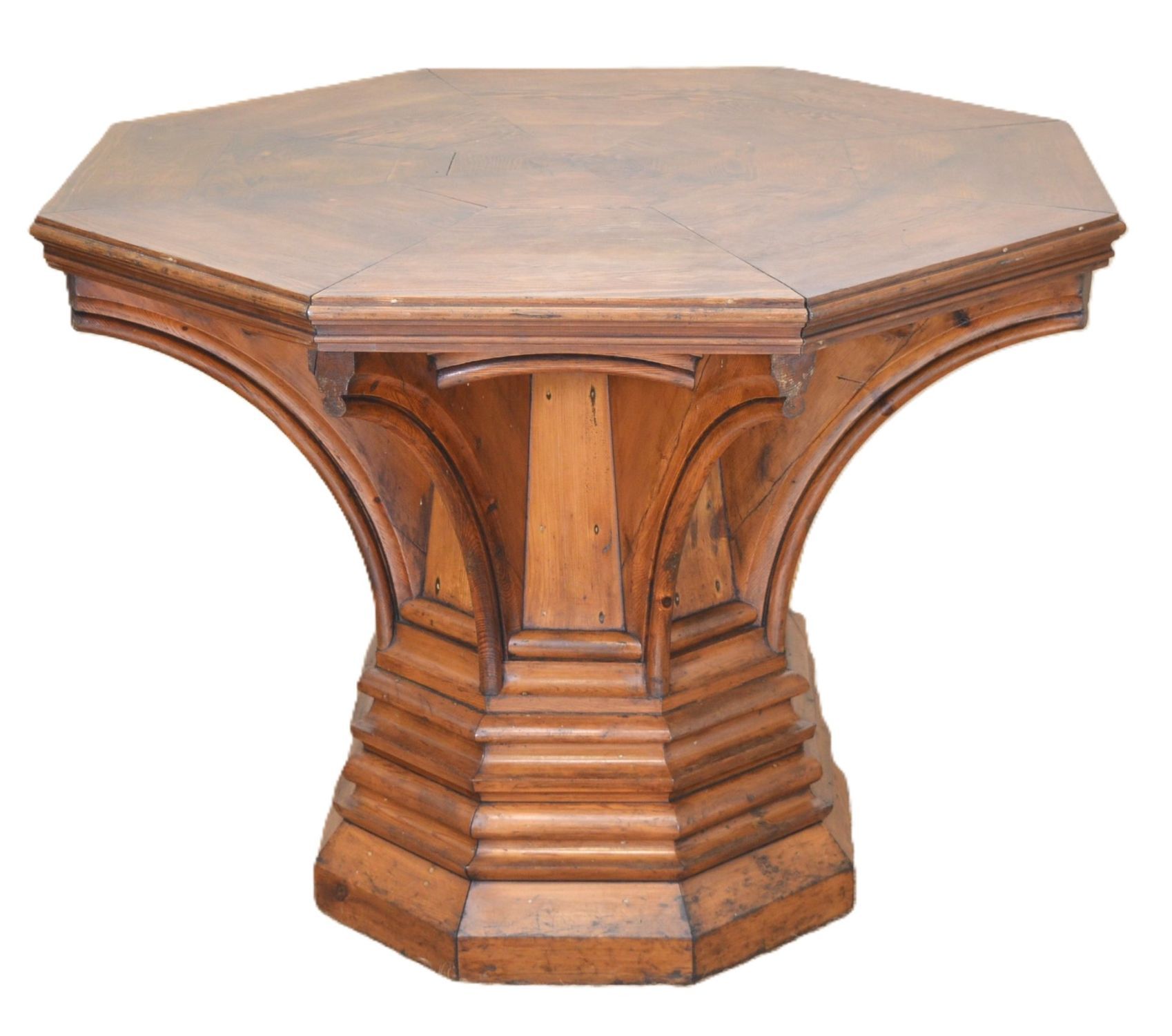 A 19th century octagonal centre table in pitch pine, the top with geometric veneered panels raised on a bold octagonal pedestal base with Gothic-style arched supports.