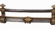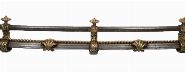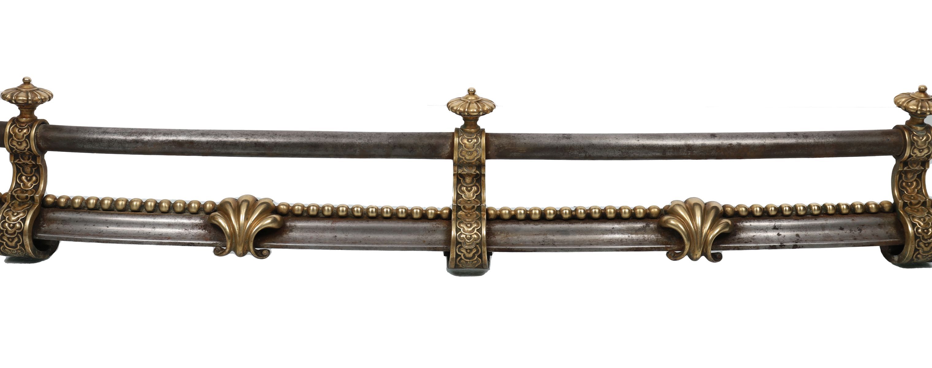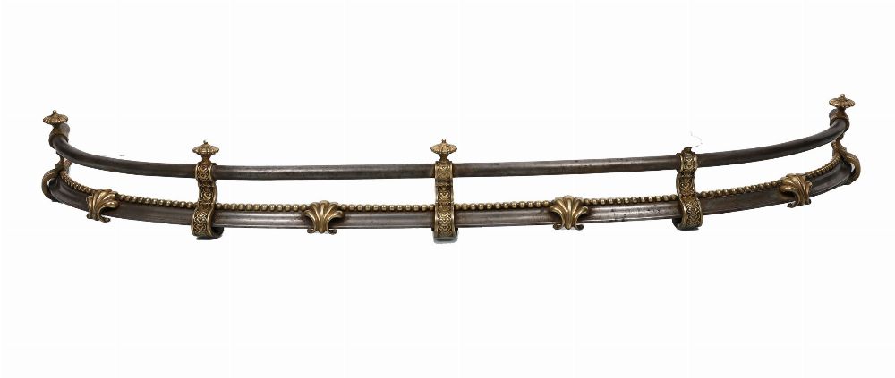 A 19th-century fire fender, the polished steel rails mounted with gilt-bronze bosses and decorative mounts, raised on shaped feet. Continental, 19th century.
