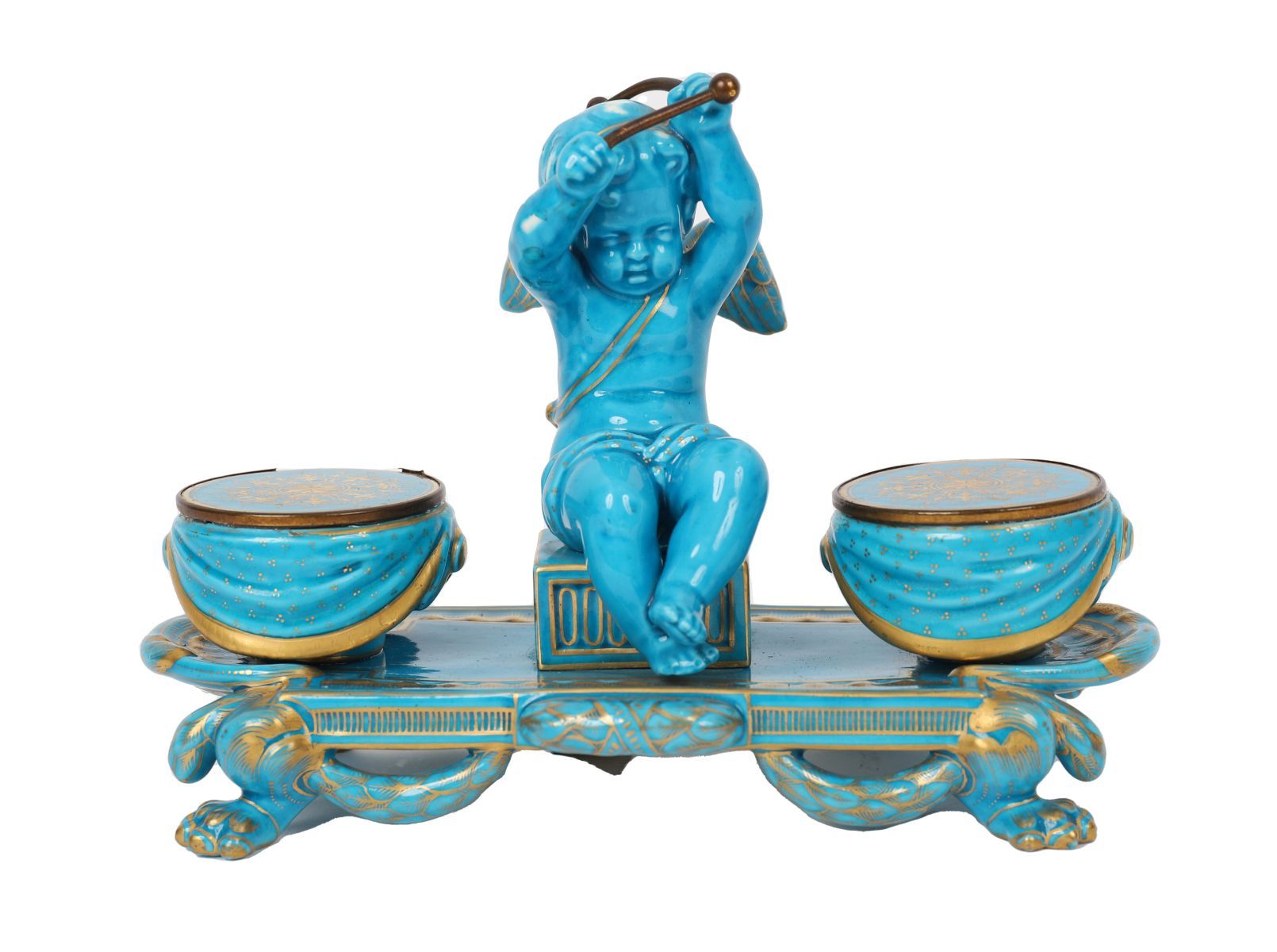 Elaborate porcelain ink stand in gilt and turquoise tones with ornate scrollwork and twin pots, attributed to Joseph Petit, Paris, 19th century.