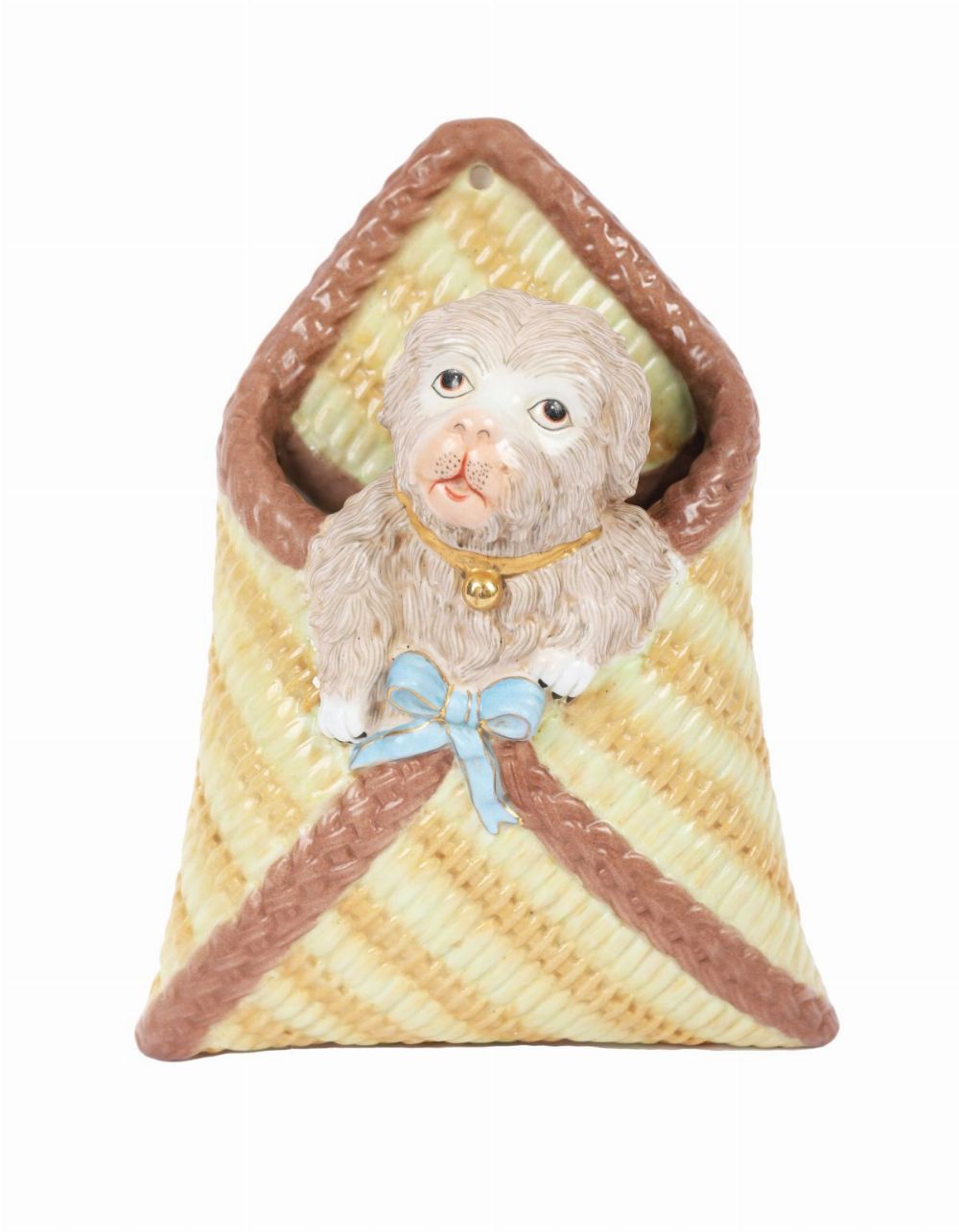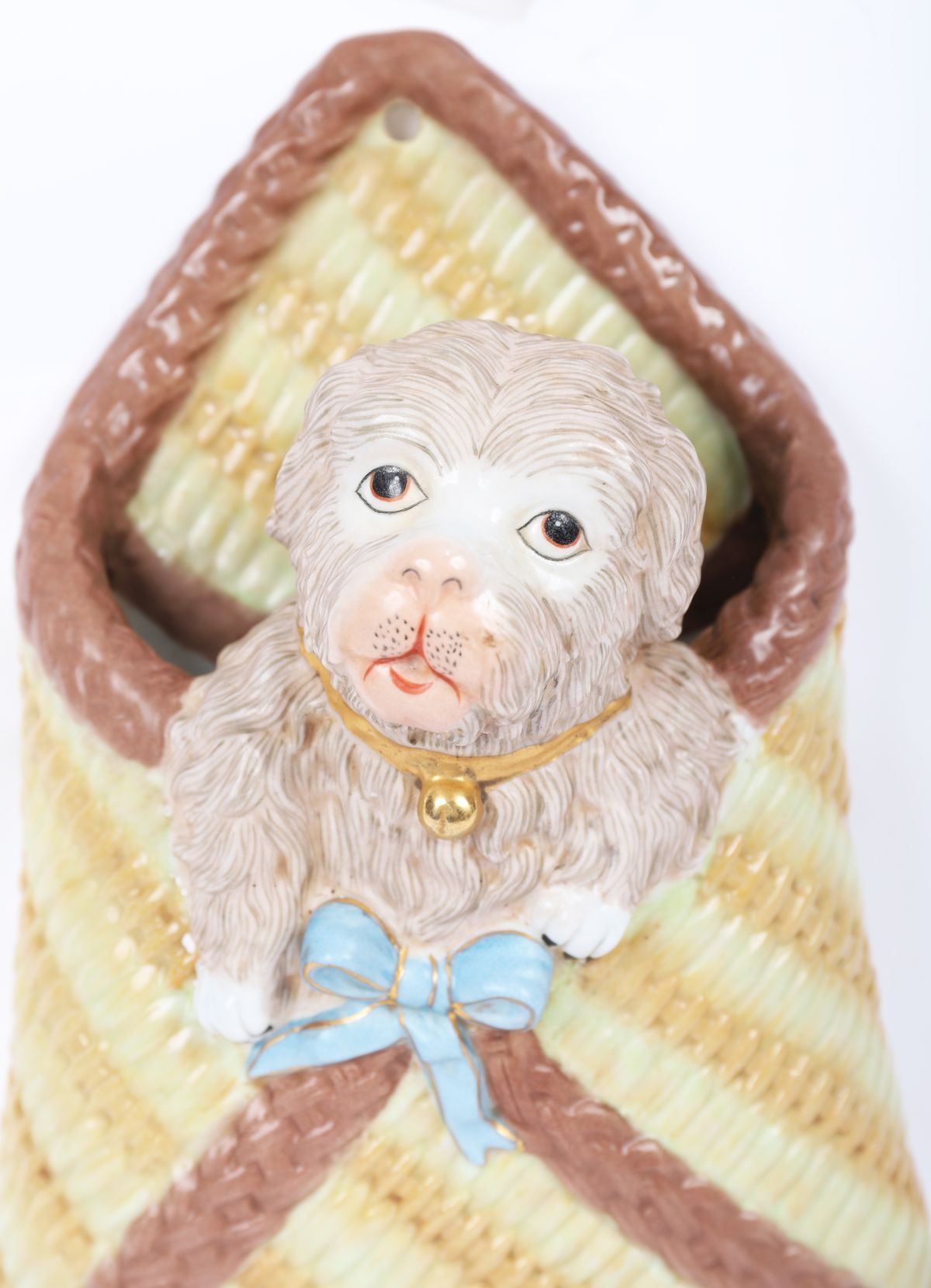 Charming 19th-century Continental porcelain wall pocket moulded as a dog's head in a basket with blue ribbon detail.