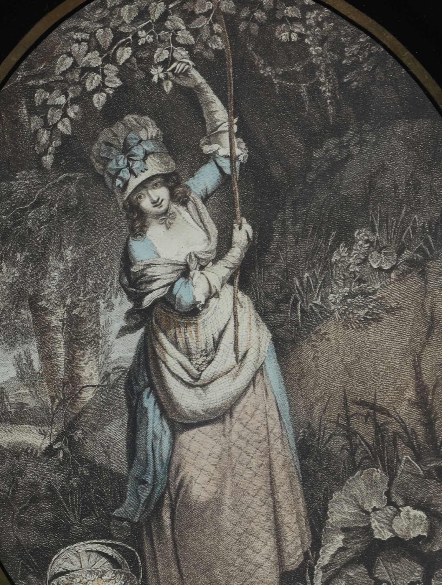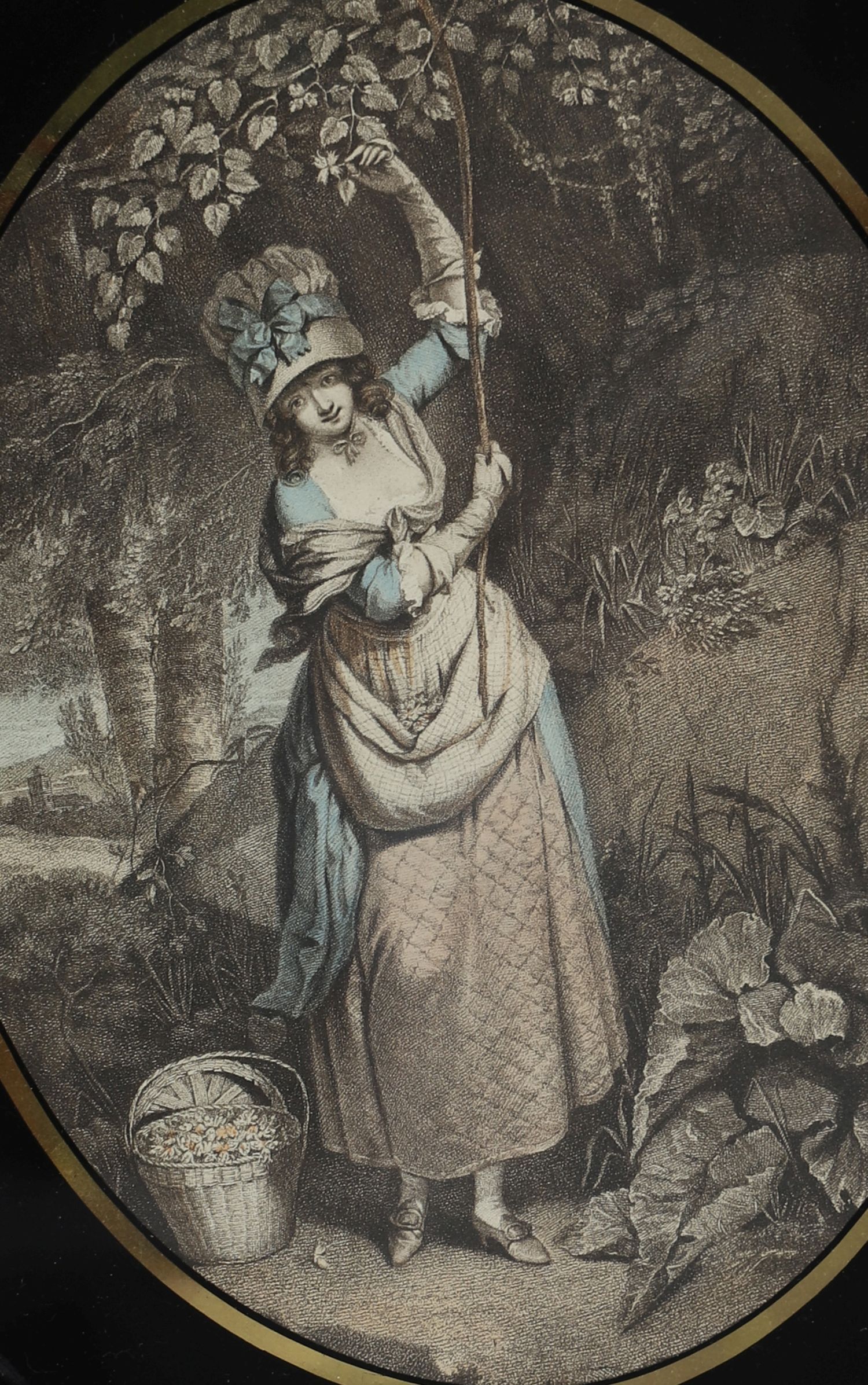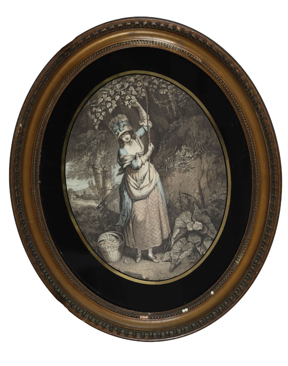 A charming 19th-century stipple engraving titled Gathering Nuts, depicting a young woman in rustic dress reaching into the branches of a woodland tree, with a woven basket at her feet. The pastoral scene is executed in soft tones and set within an oval verre églomisé glass mount (reverse-painted and gilded border), and housed in an ornate oval gilt frame with beaded and ribbon moulding.