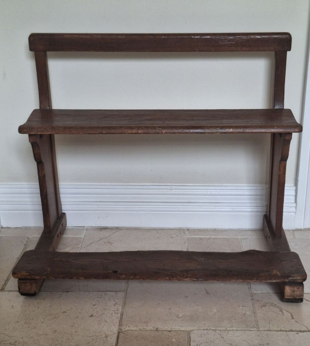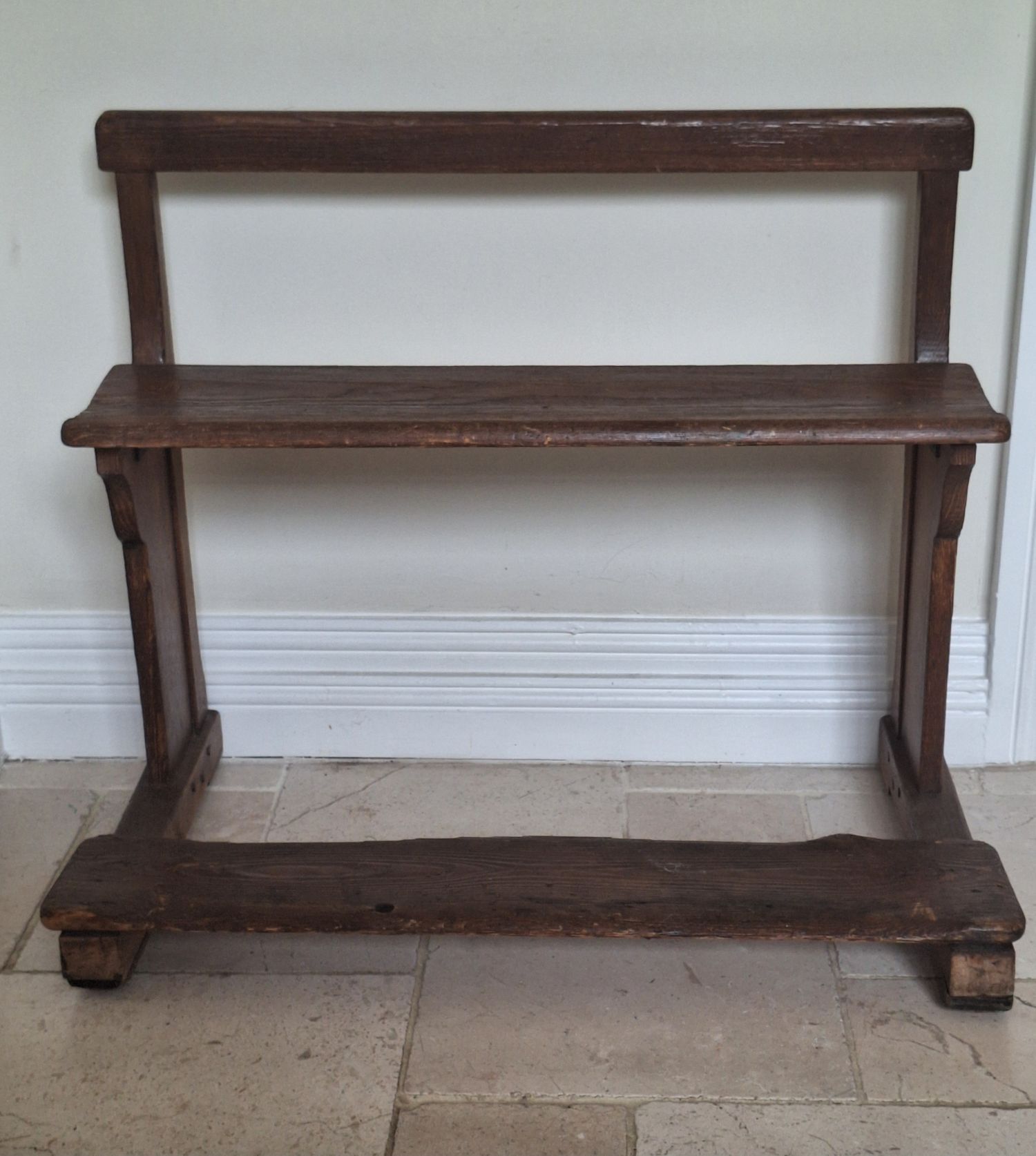 A rustic provincial pine bench, fashioned in the 19th century with two sturdy treads and a simple backrest. The surface bears a timeworn patina, evoking the honest charm of vernacular country furniture.
