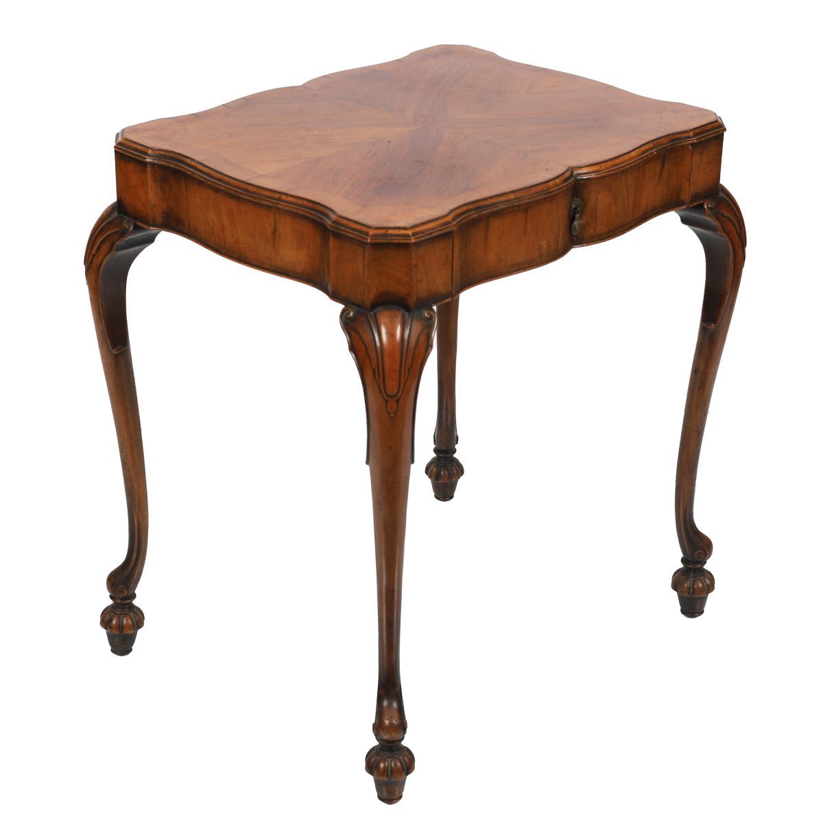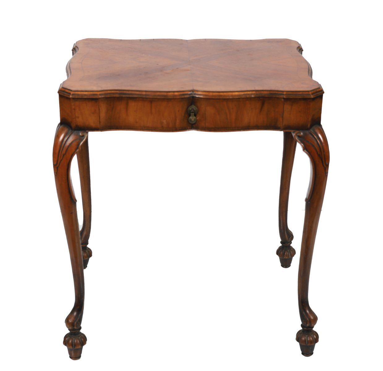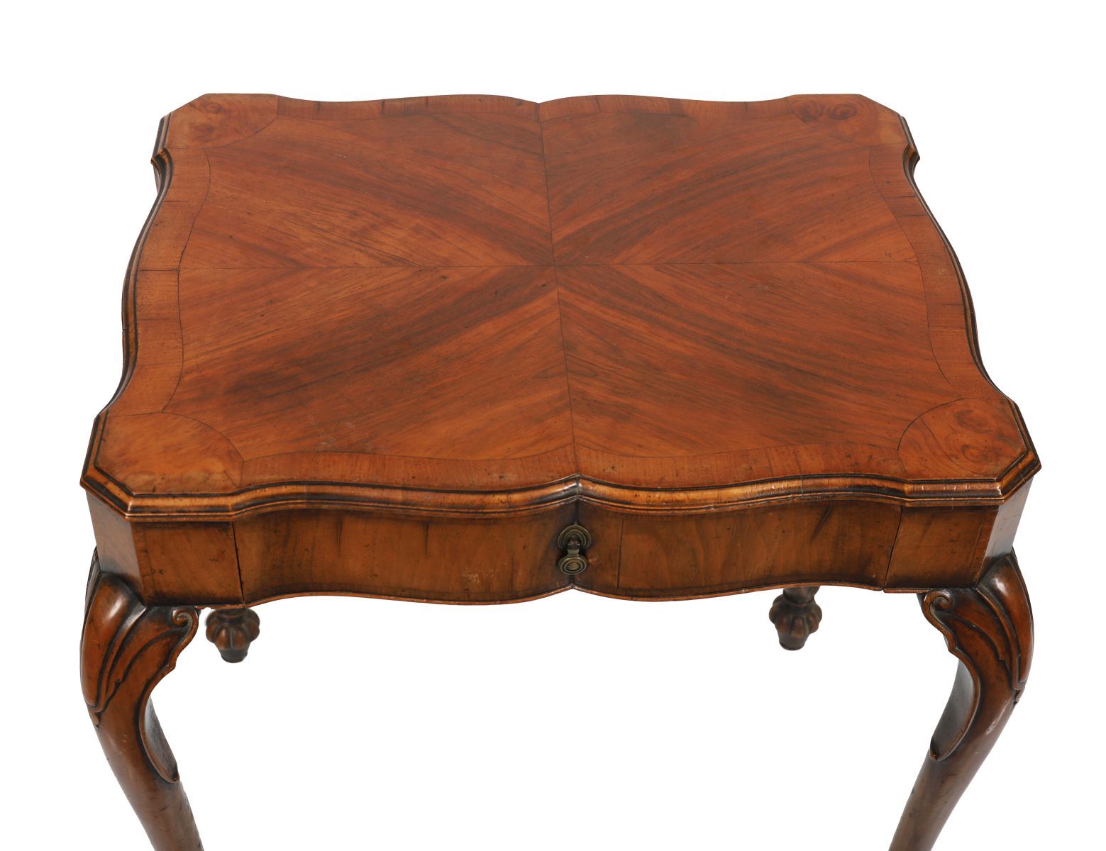 Late 19th century. A Queen Anne style walnut occasional table, serpentine-shaped top over a single frieze drawer, raised on cabriole legs with pad feet.