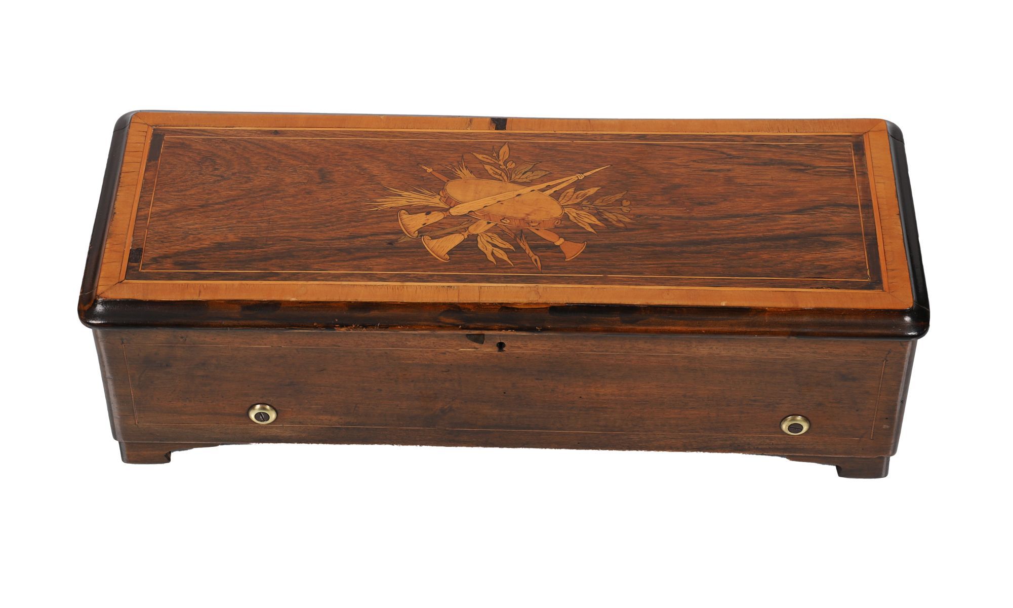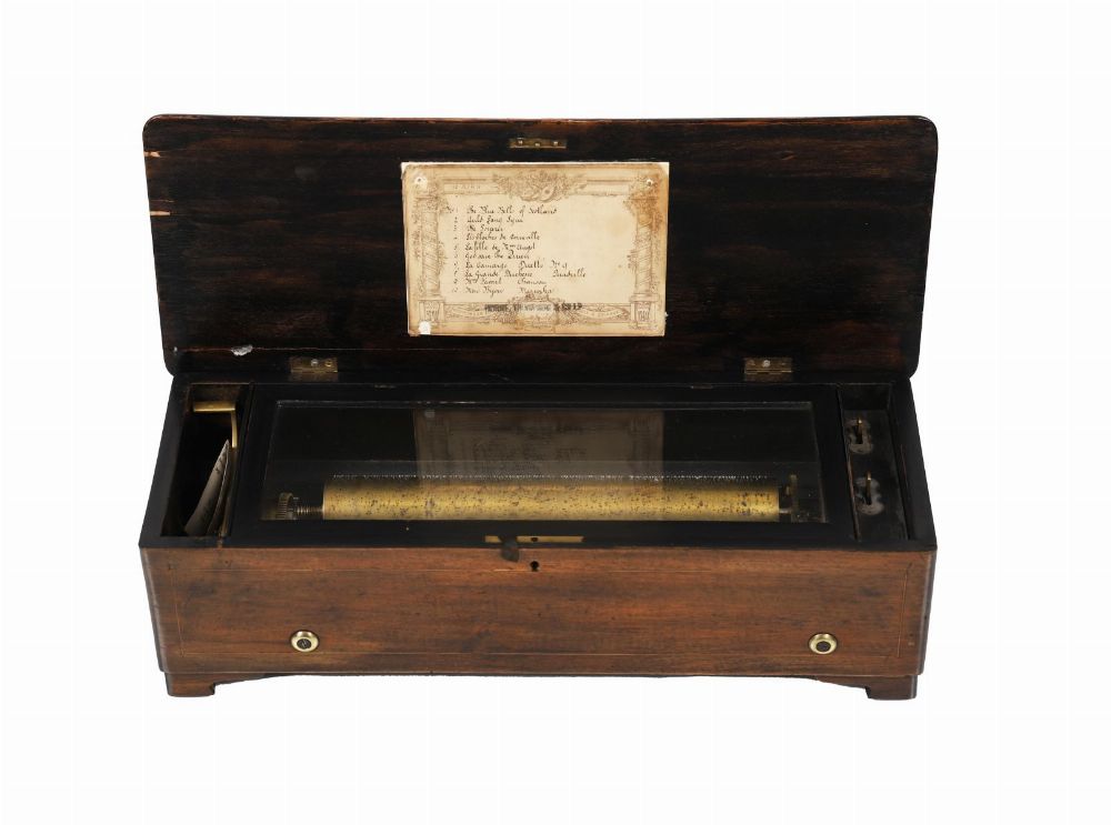 A 19th-century rosewood and marquetry inlaid cylinder music box, the lid inlaid with floral and musical trophies, opening to reveal a musical mechanism with comb and cylinder.