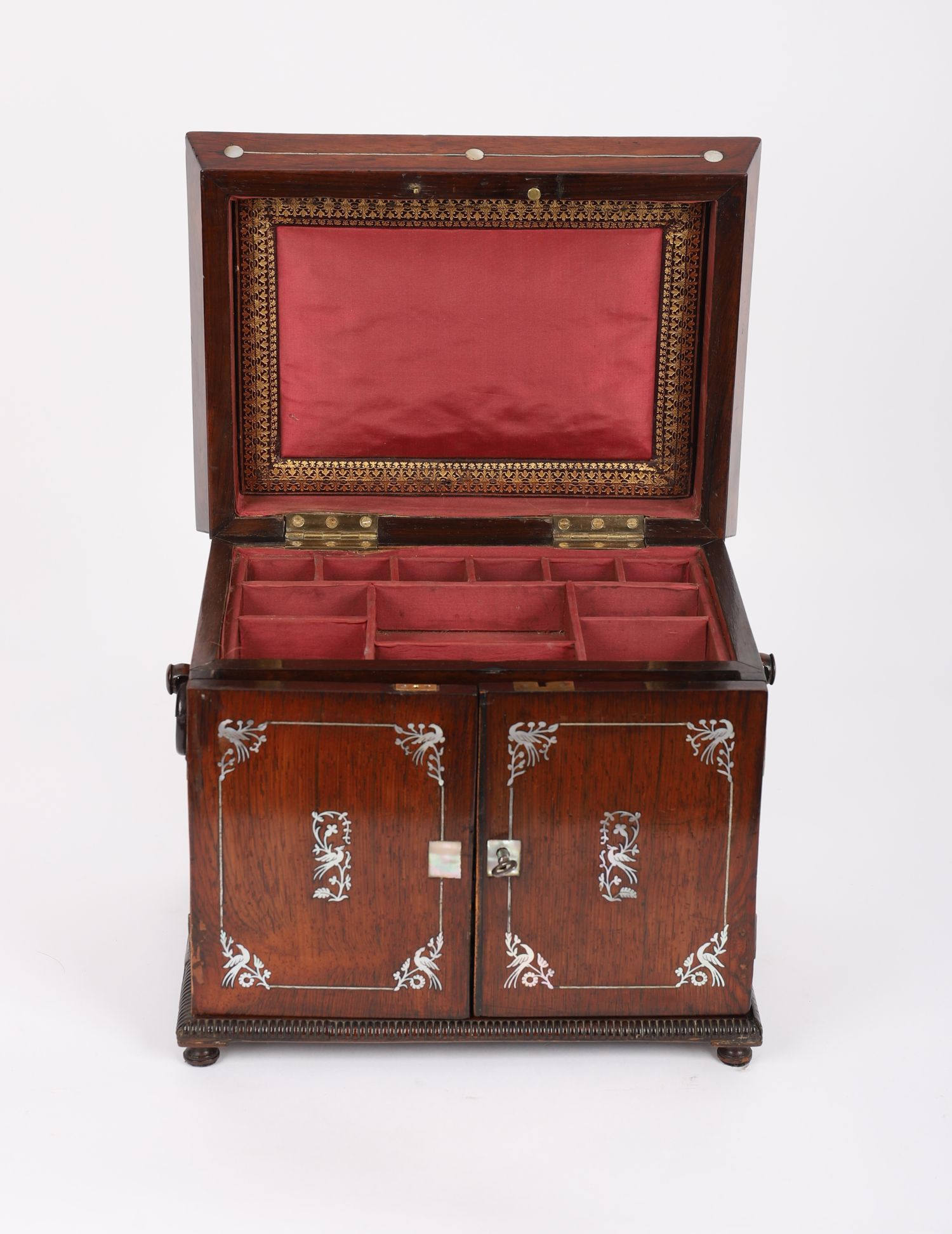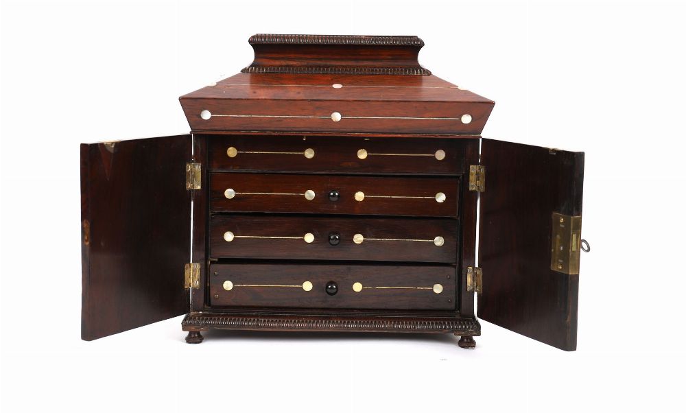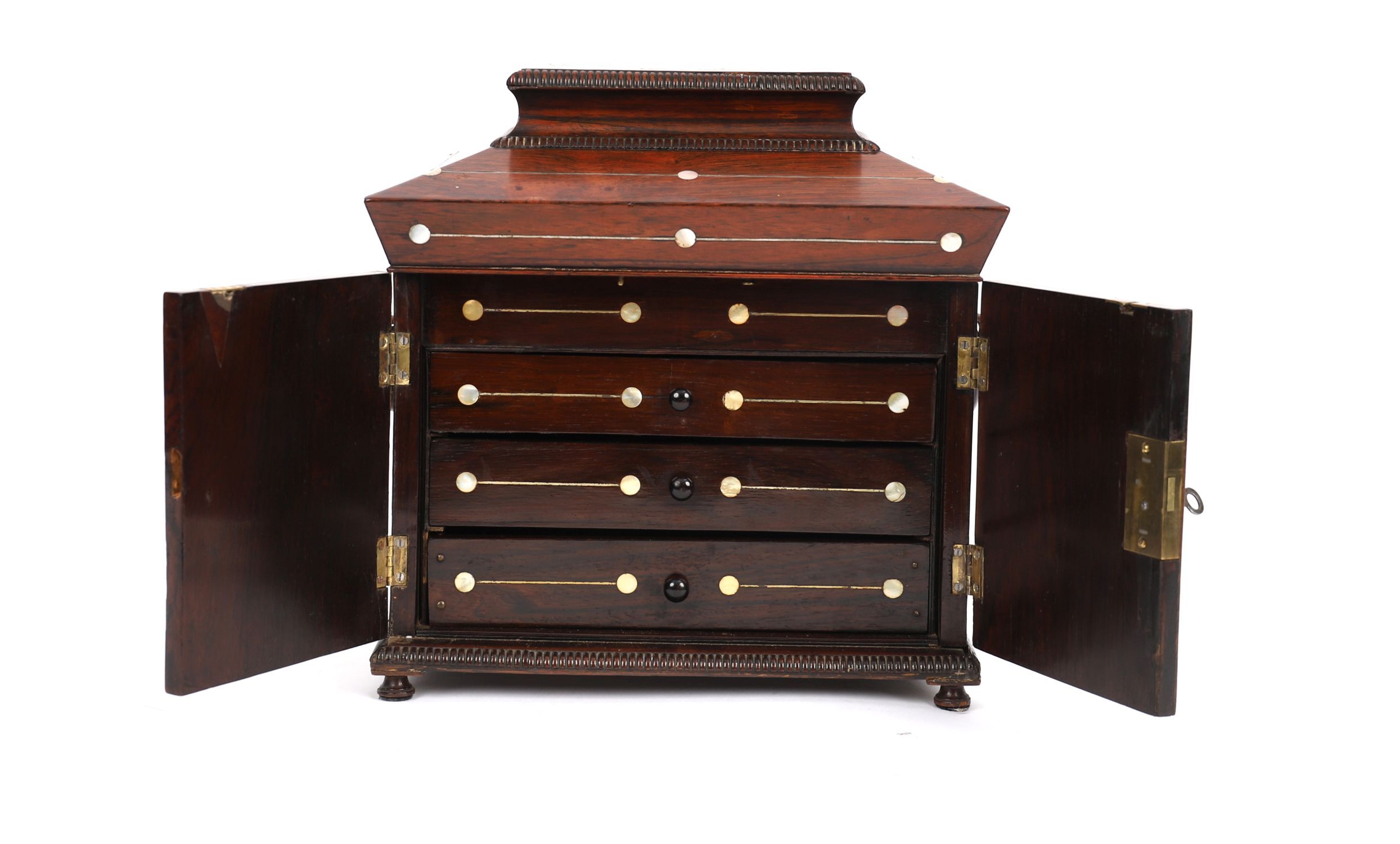 A 19th century rosewood miniature cabinet with inset mother-of-pearl marquetry and ivory stringing. The architectural form opens to reveal a fitted interior of small drawers, used for jewellery or personal effects.